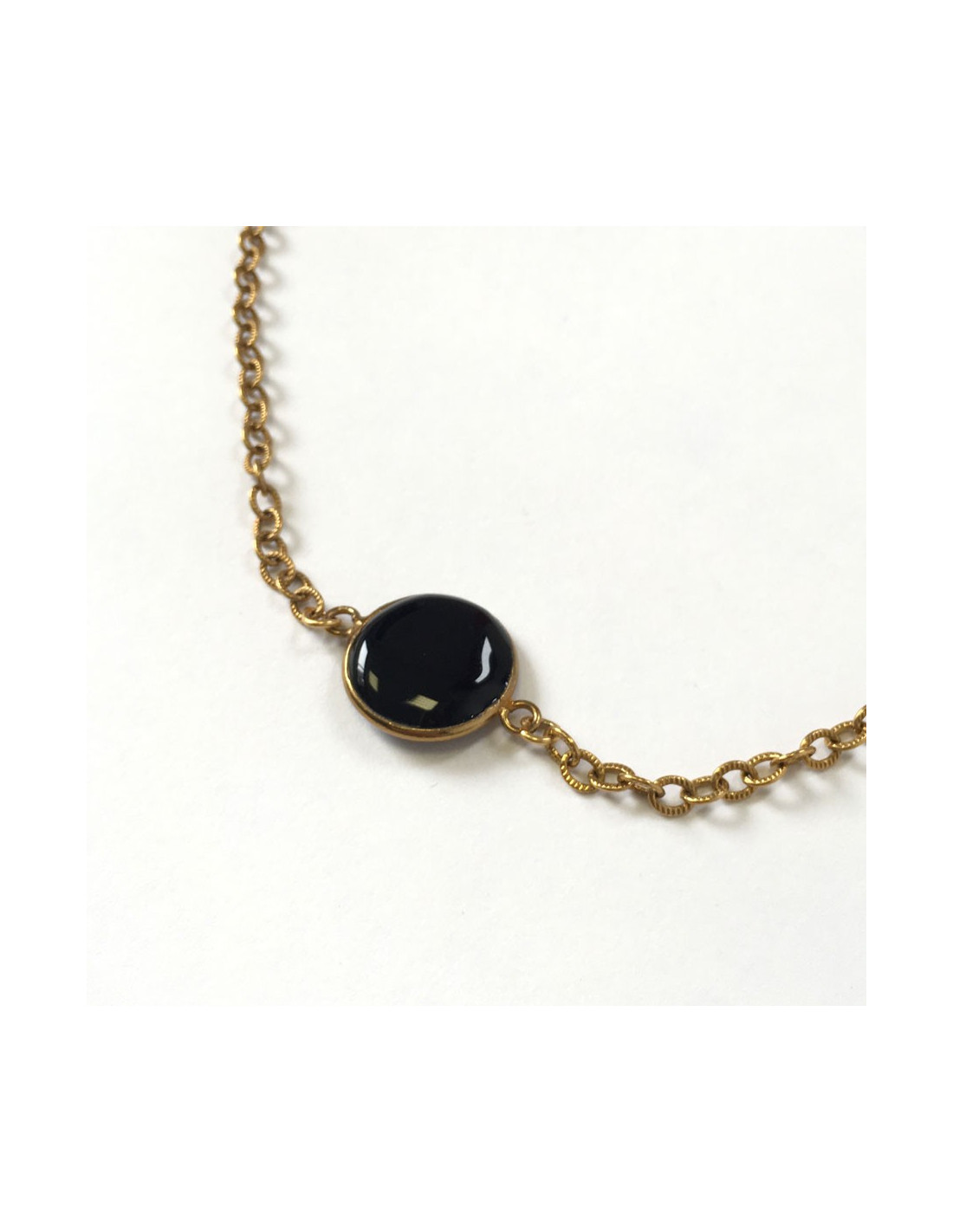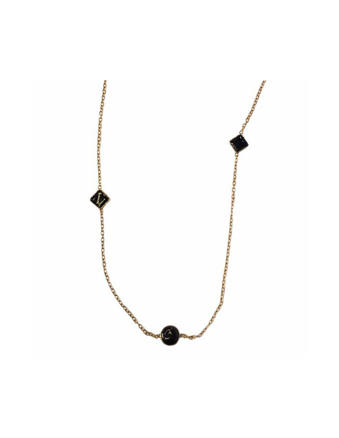 Beau sautoir MARGUERITE DE VALOIS chaîne dorée et éléments carrés et ronds en pâte de verre noire.
