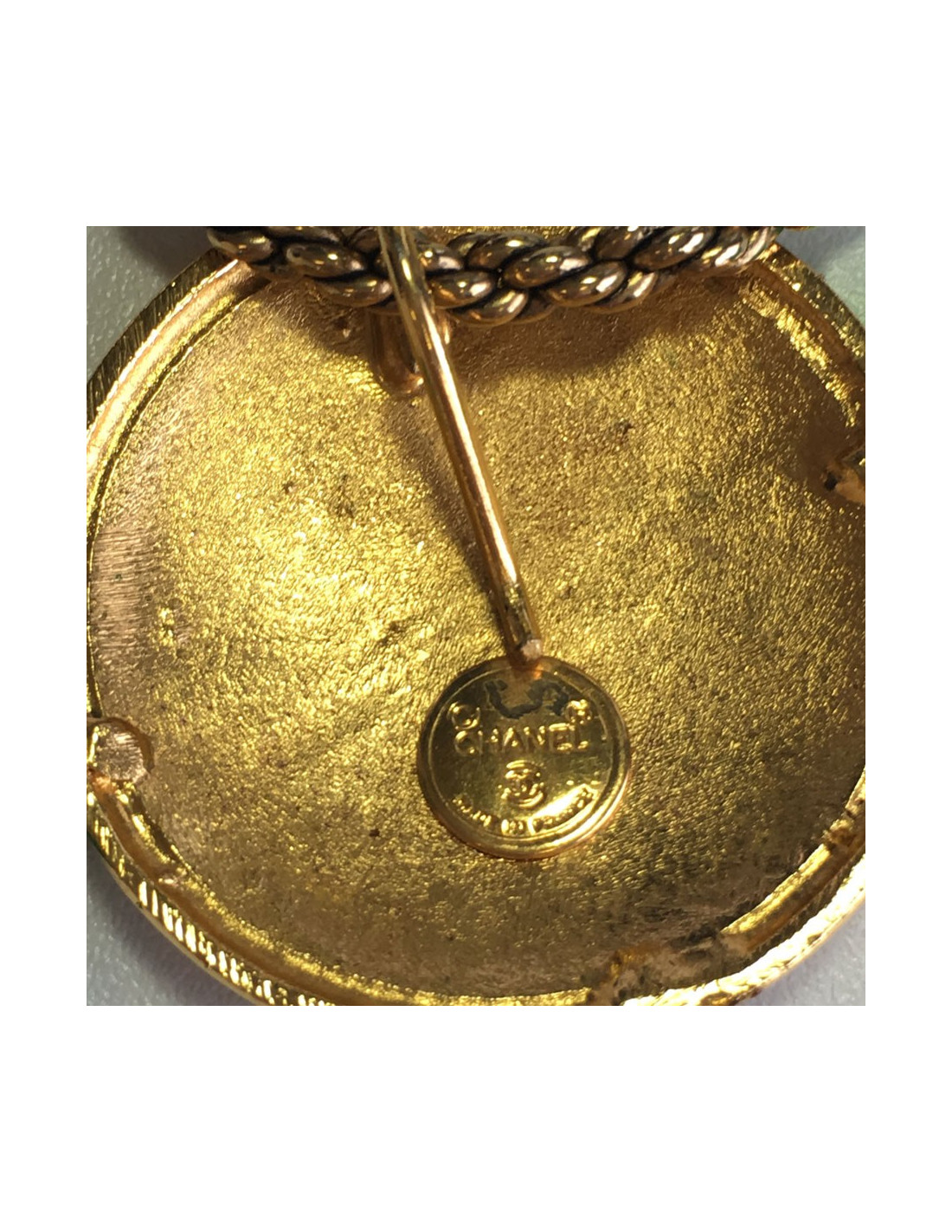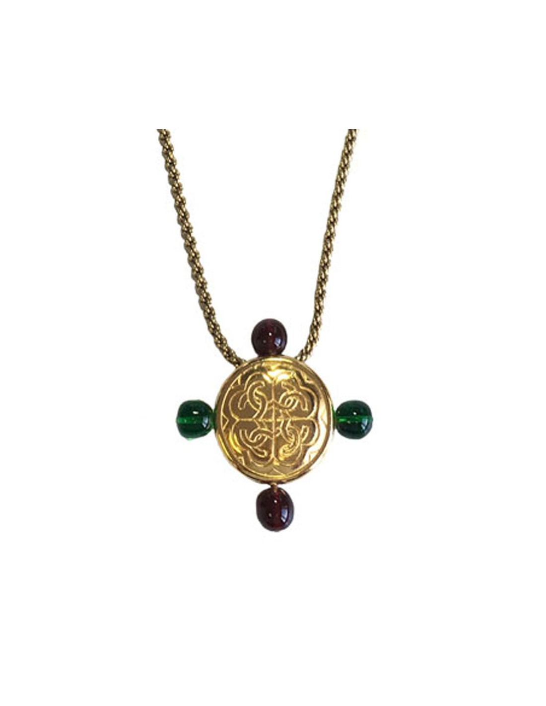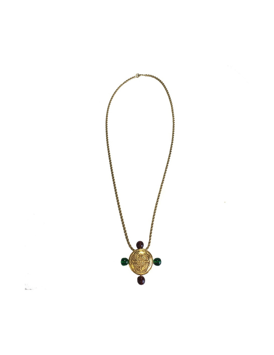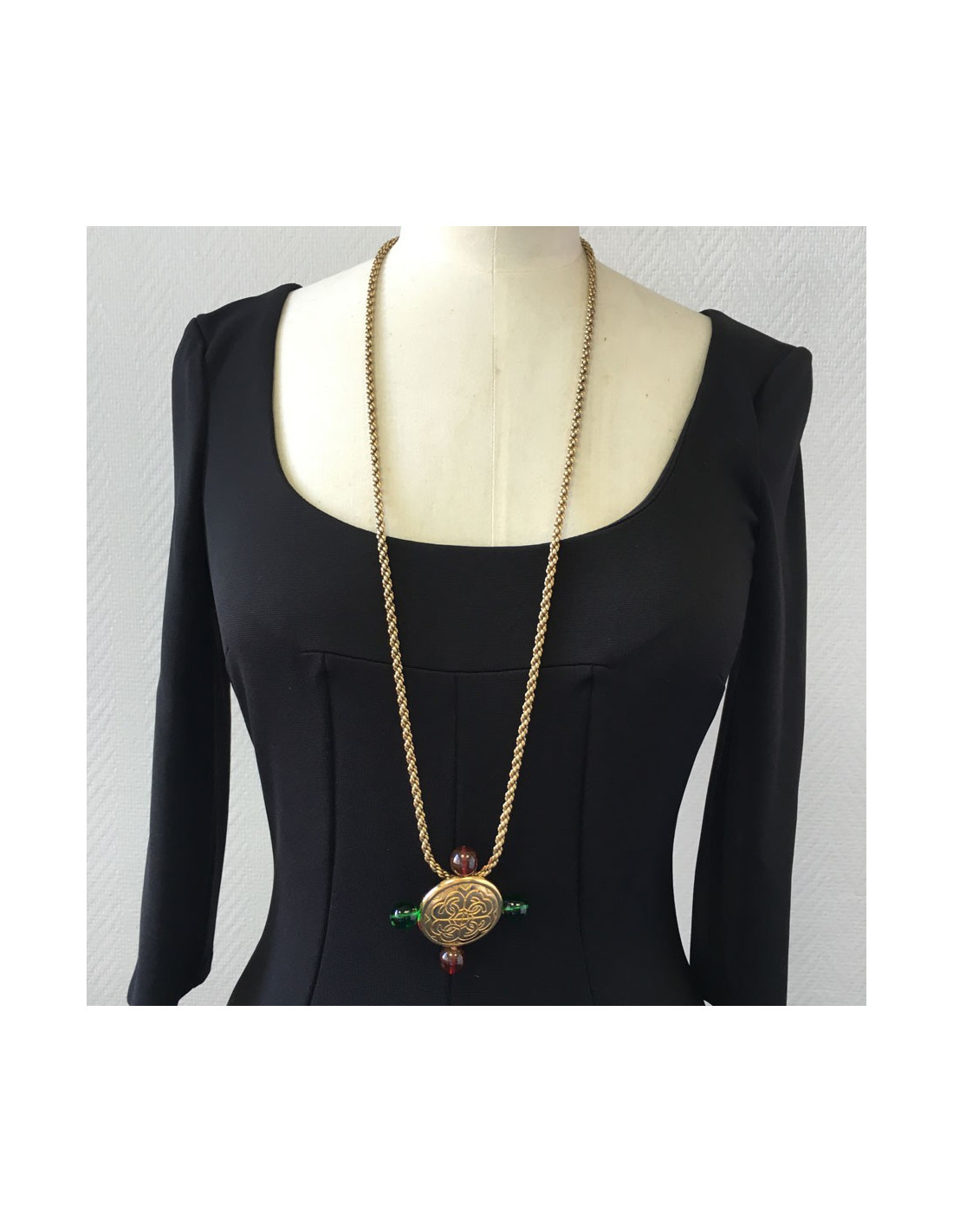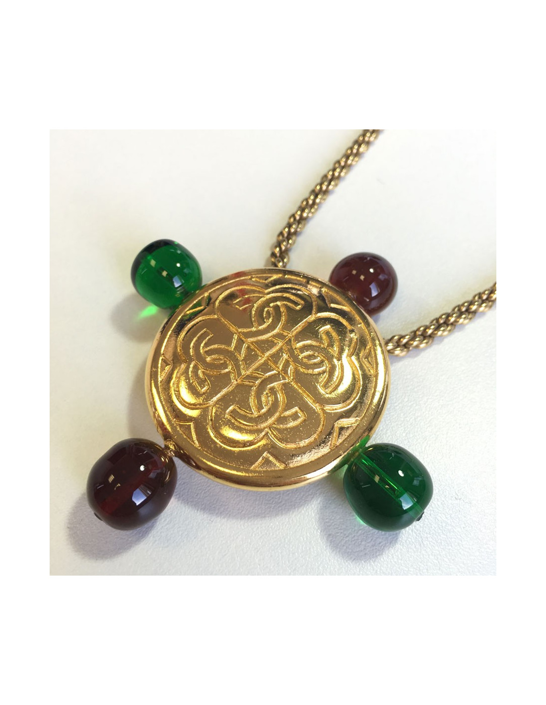 Très beau sautoir CHANEL en métal doré avec pendentif doré agrémenté de 4 pierres en résine verte et bordeaux. Pièce vintage, 80's. Fermoir crochet.