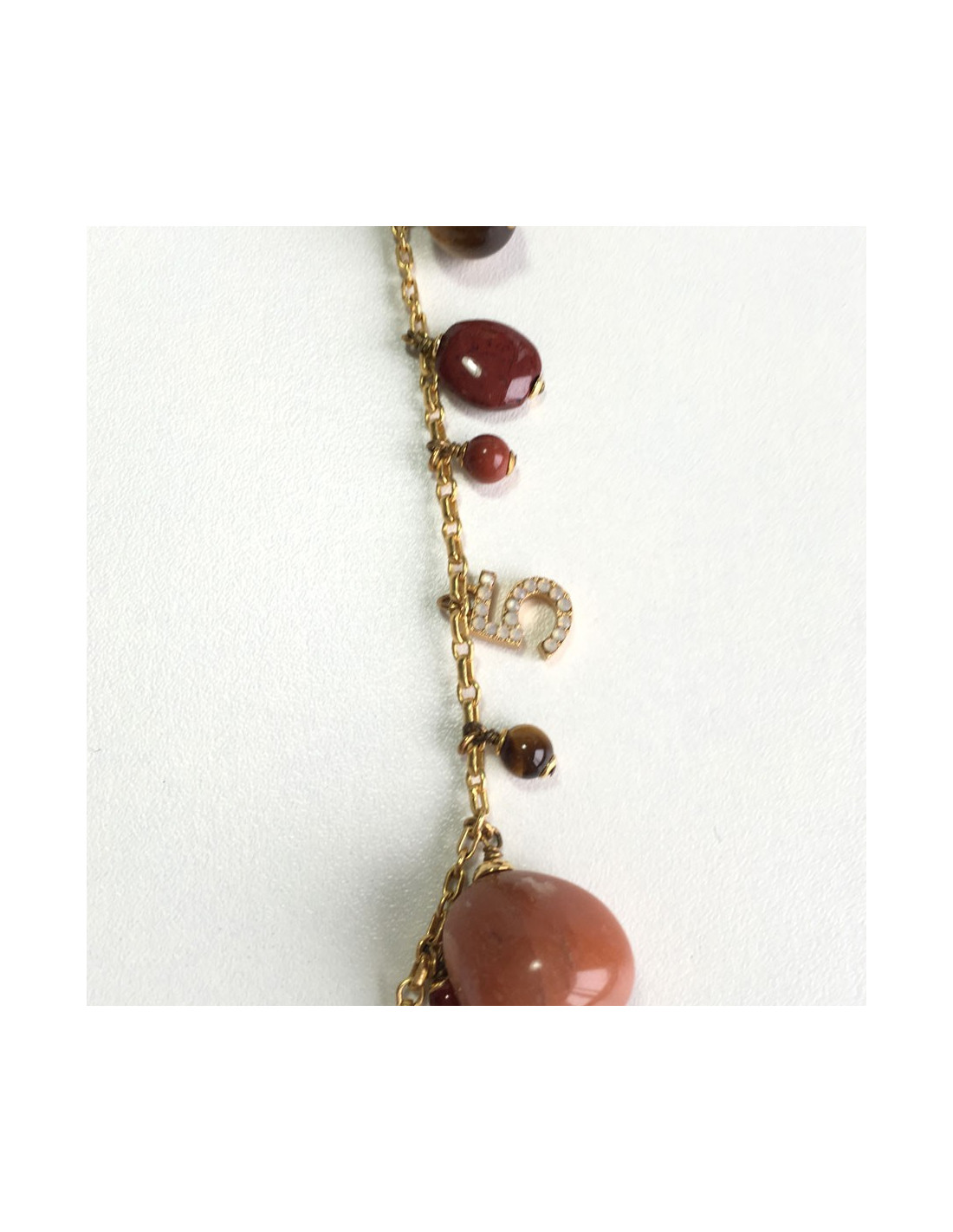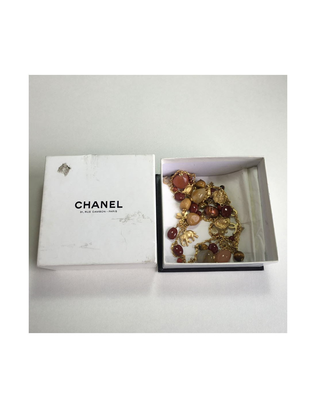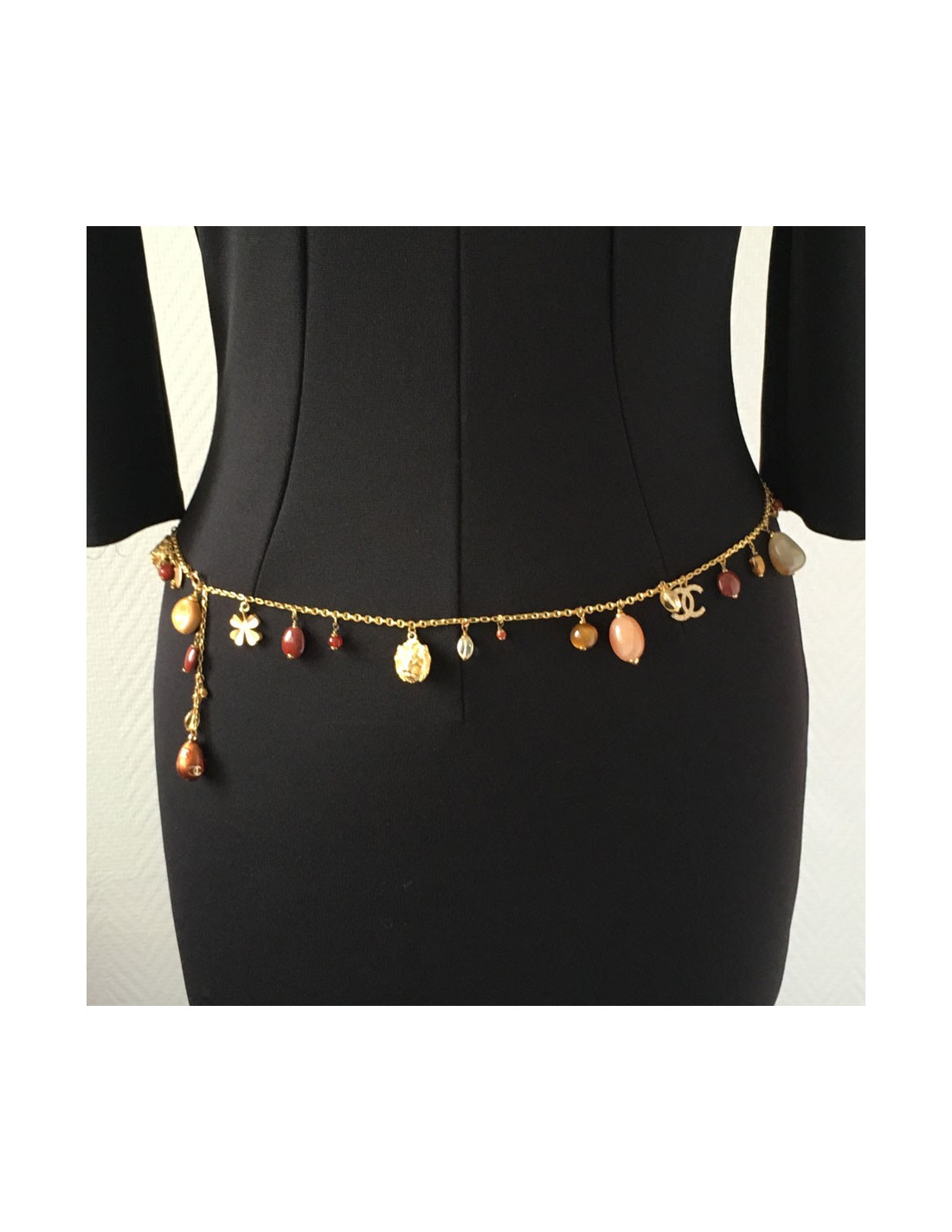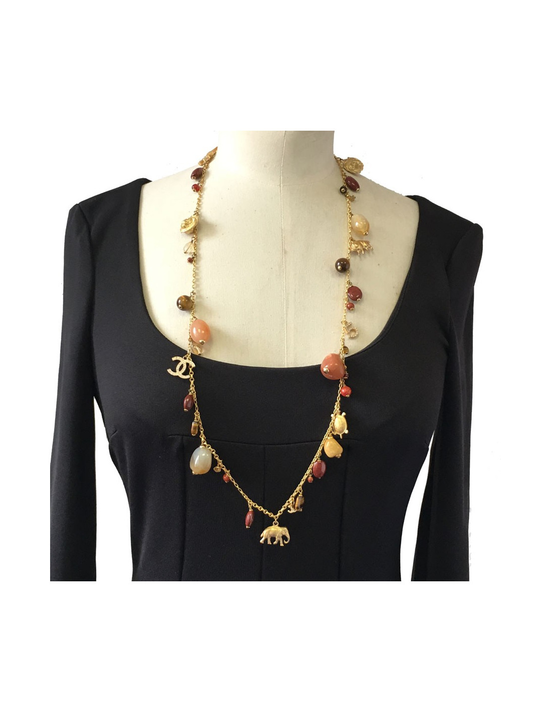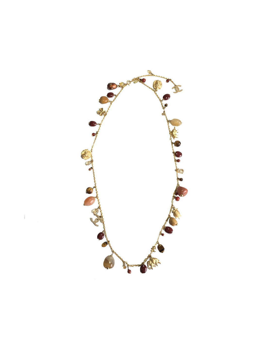 Pièce d'exception! Superbe sautoir CHANEL couture. Chaîne en métal doré, charms symboles de la maison (5, CC, trèfles, éléphant,...), pierres semi-précieuses de multiples couleurs.