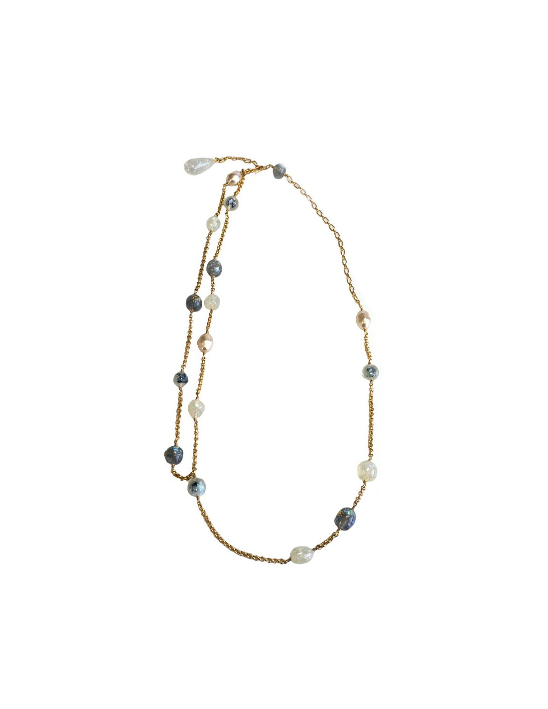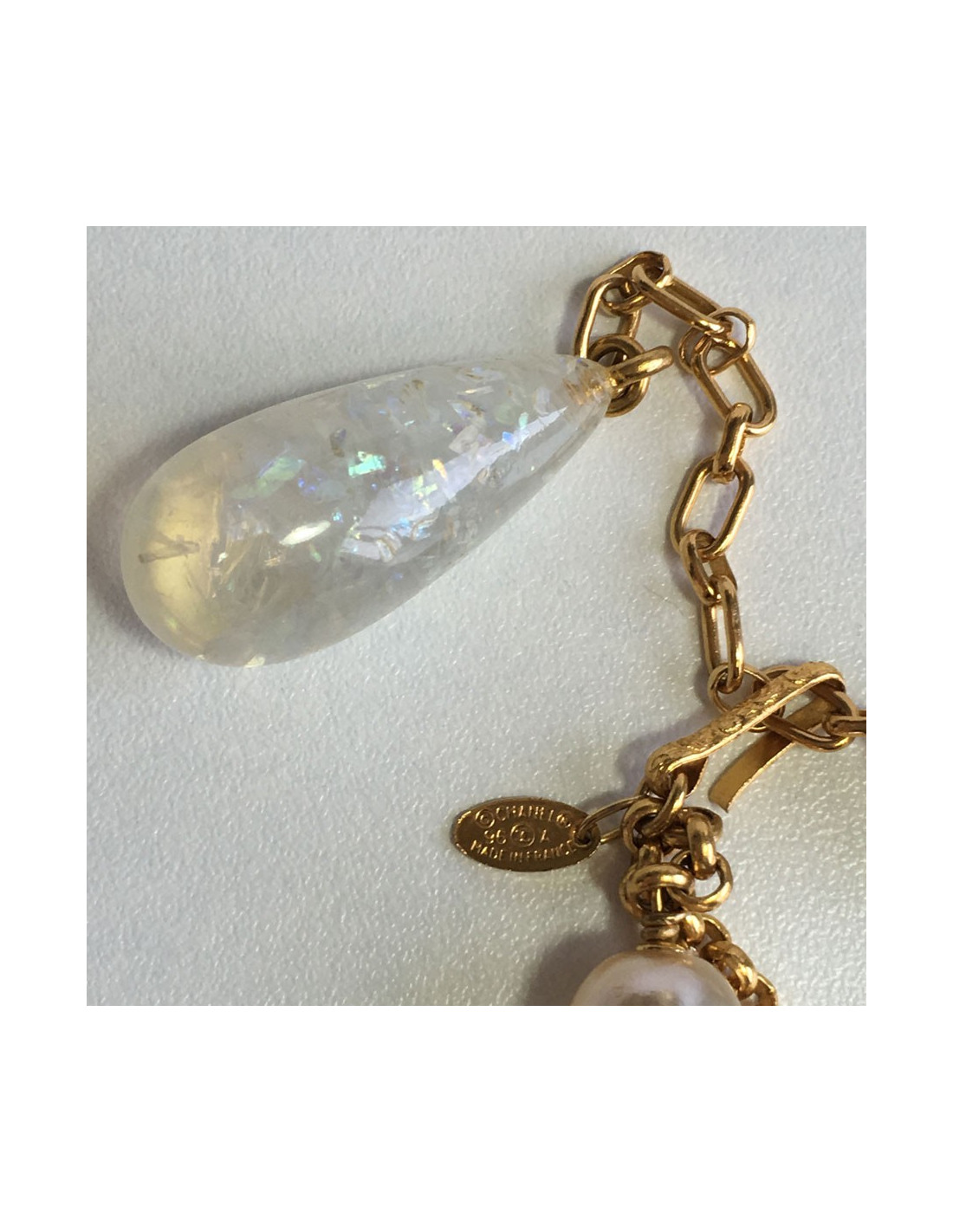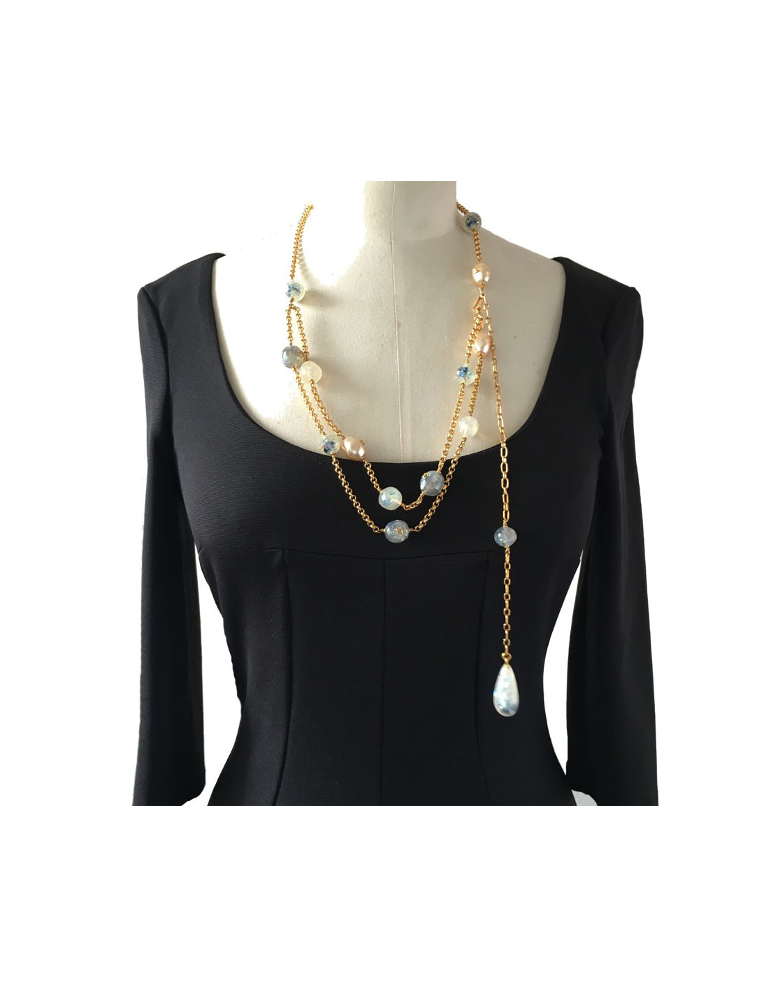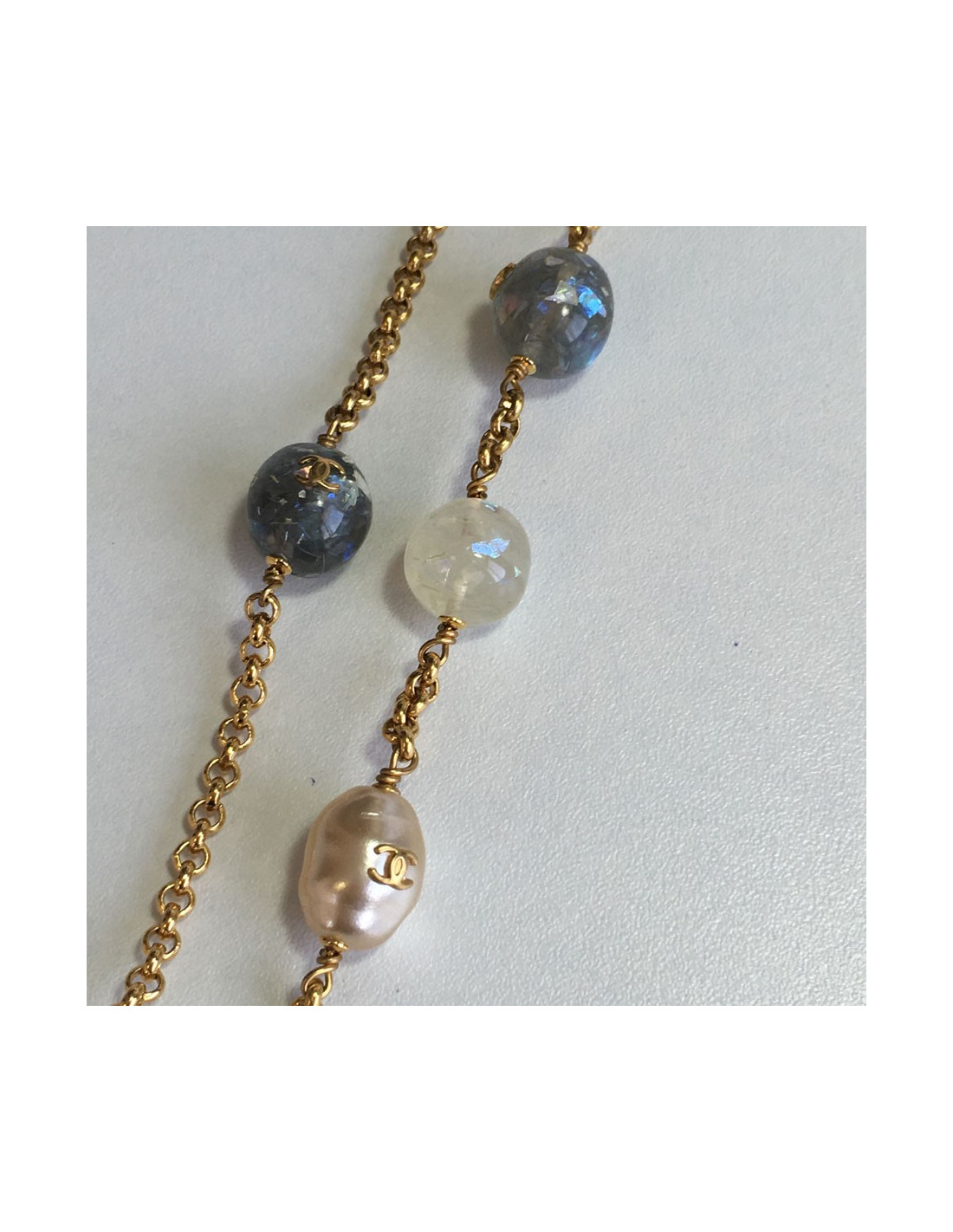 Ceinture-sautoir CHANEL en chaîne dorée et perles bleues en plastique avec éclats de nacres et perles nacrées en pâte de verre. Fermoir crochet. Collection 1996. Pièce vintage. En parfait état.