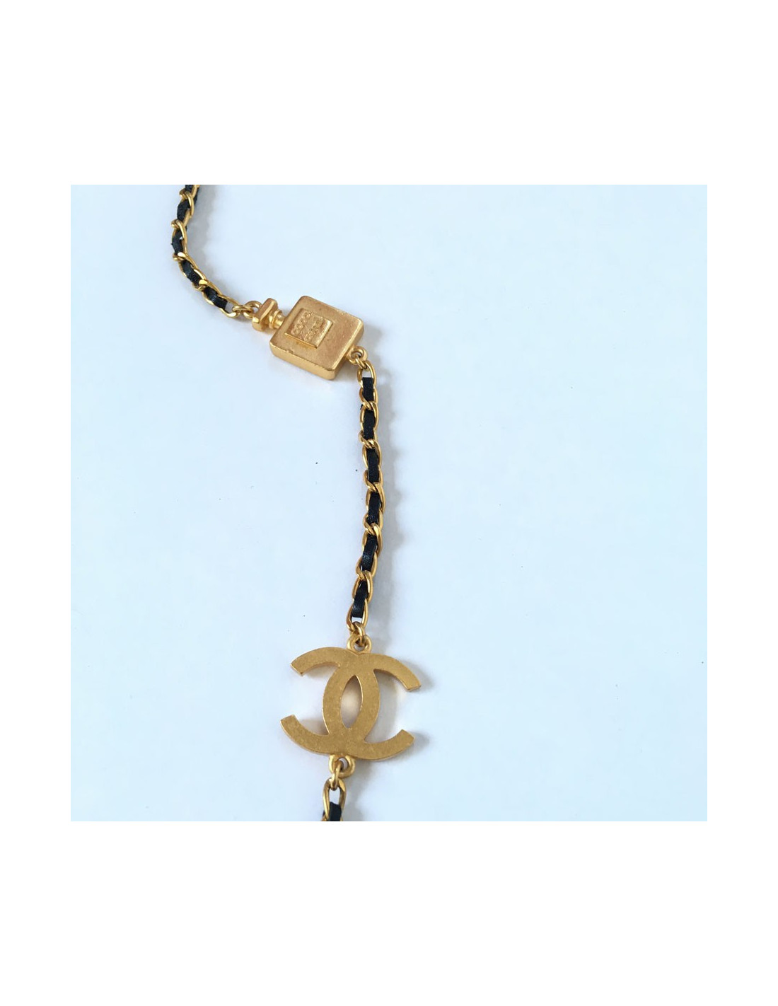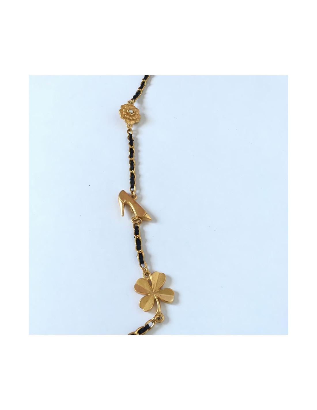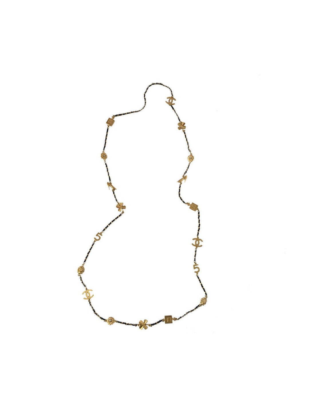 Collector! Pièce iconique de la Maison Chanel. Sautoir CHANEL chaîne en métal doré mat entrelacé de cuir noir et symboles de la marque doré mat: flacon Coco, trèfle, 5, camélia, CC, escarpin, tête de lion.