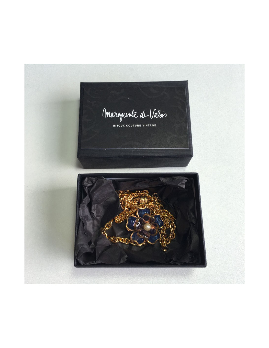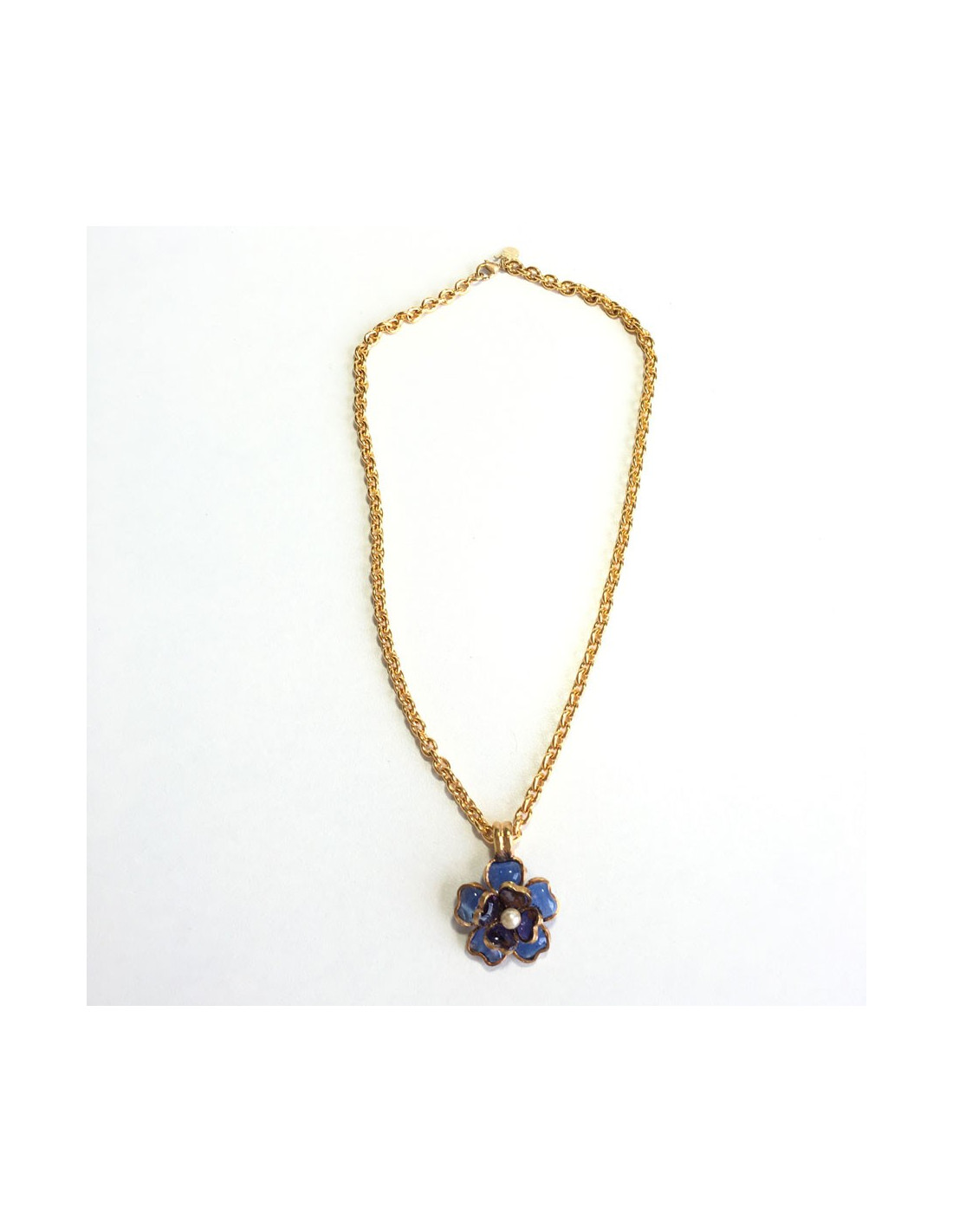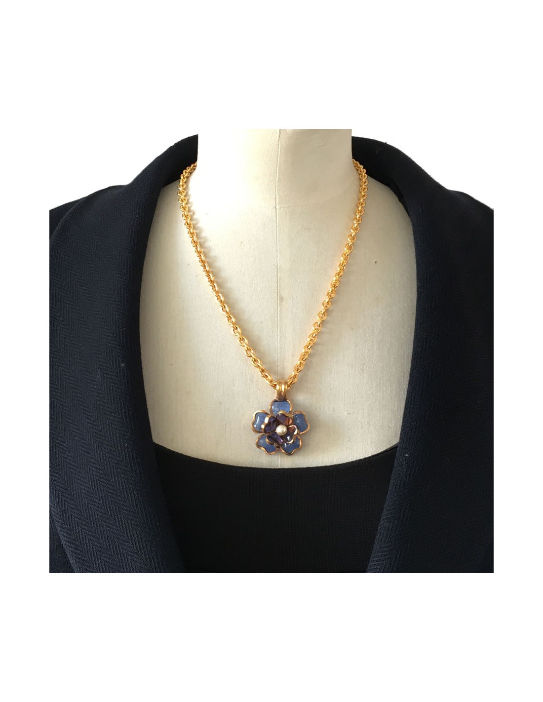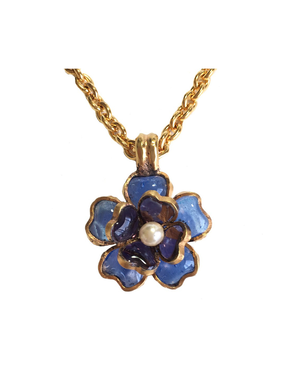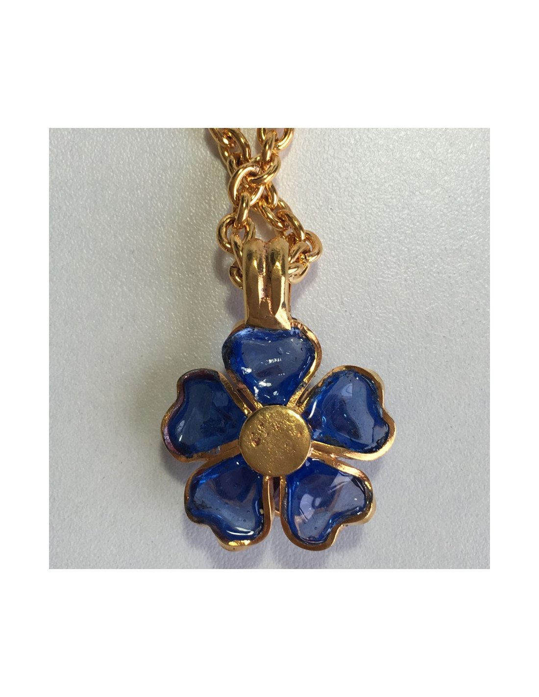 Collier MARGUERITE DE VALOIS fleurette en pâte de verre couleur saphir et améthyste. Petite perle au centre de la fleur. Chaîne en métal doré. Jamais porté.