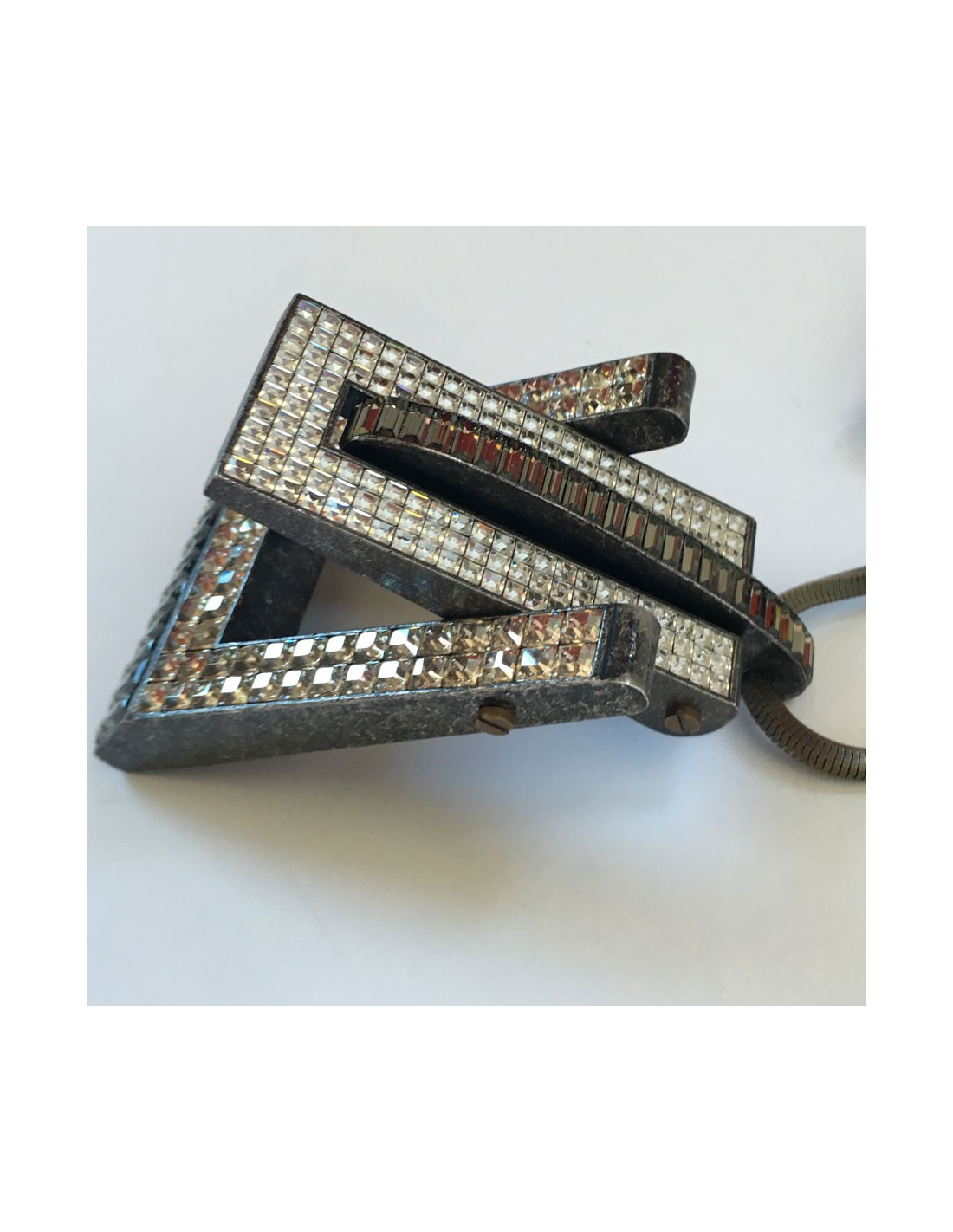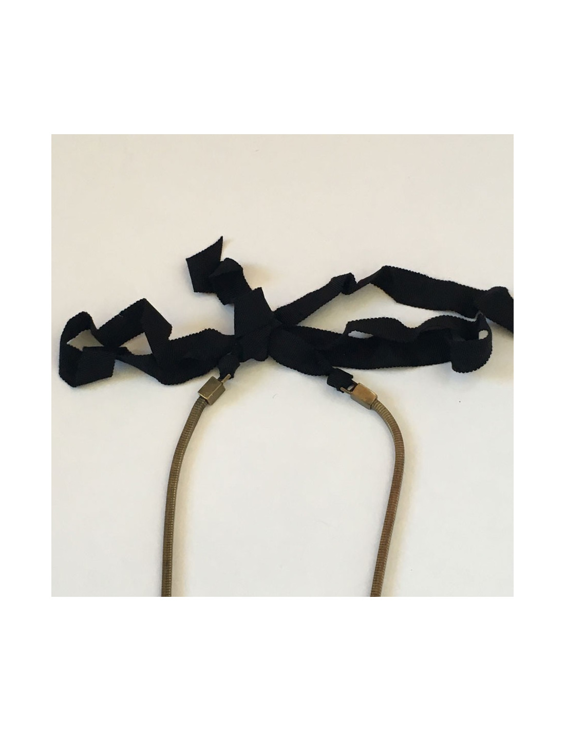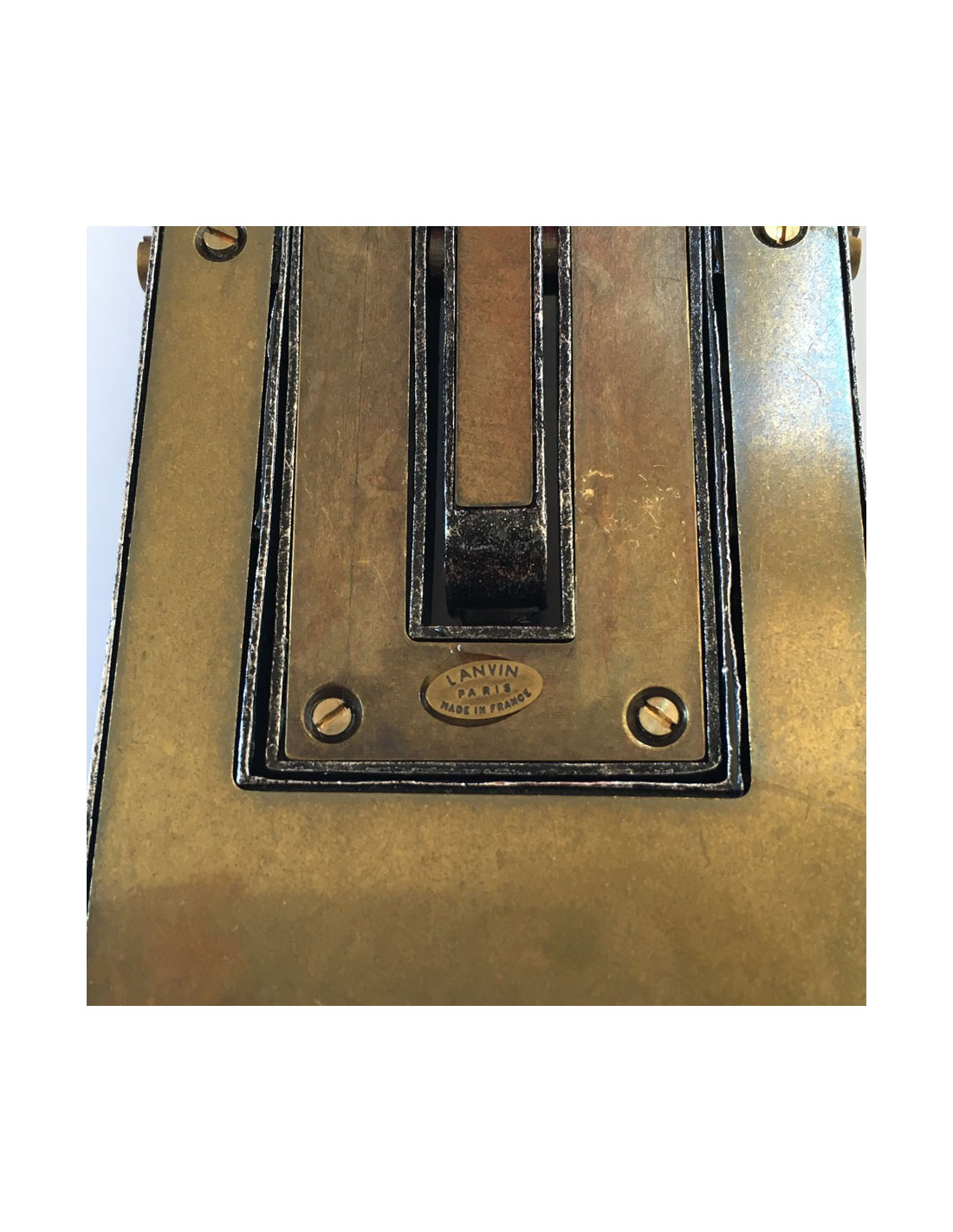 Majestueux collier en laiton de LANVIN collection 2014. Chaîne couleur or vieilli avec ruban en soie noir, plastron rectangulaire articulé en strass baguette et carré transparents et gris. En parfait état.