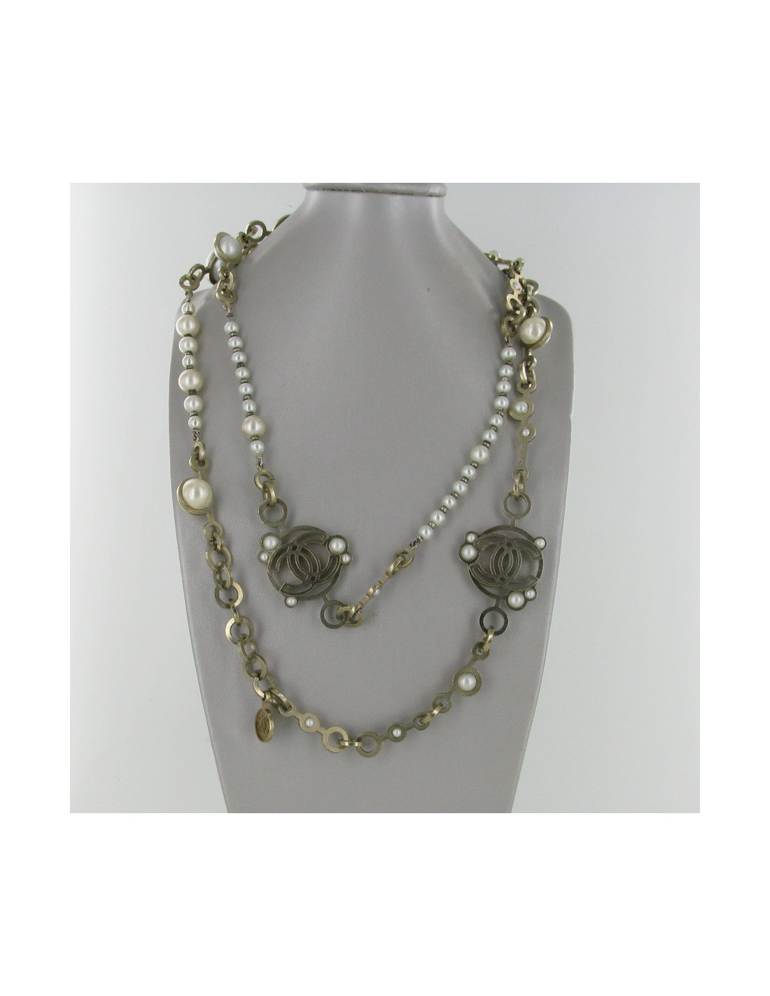Sublime sautoir CHANEL, chaîne en métal or pâle sertie de perles blanches en pâte de verre.
