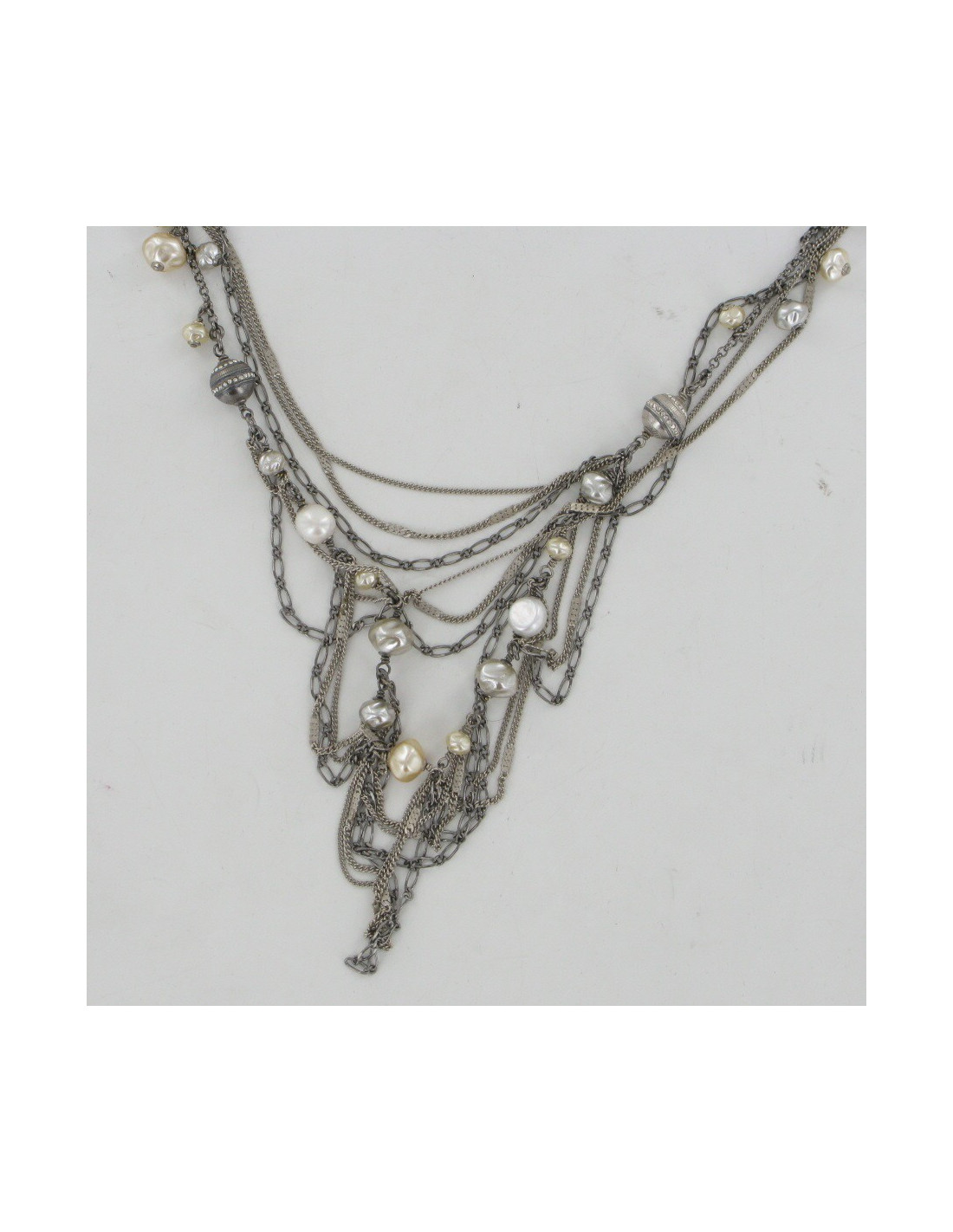 Chaînes argent vieilli, perles barroques nacrées, 4 sphère en métal argent vieilli serties de strass, 2 grands CC serties de strass