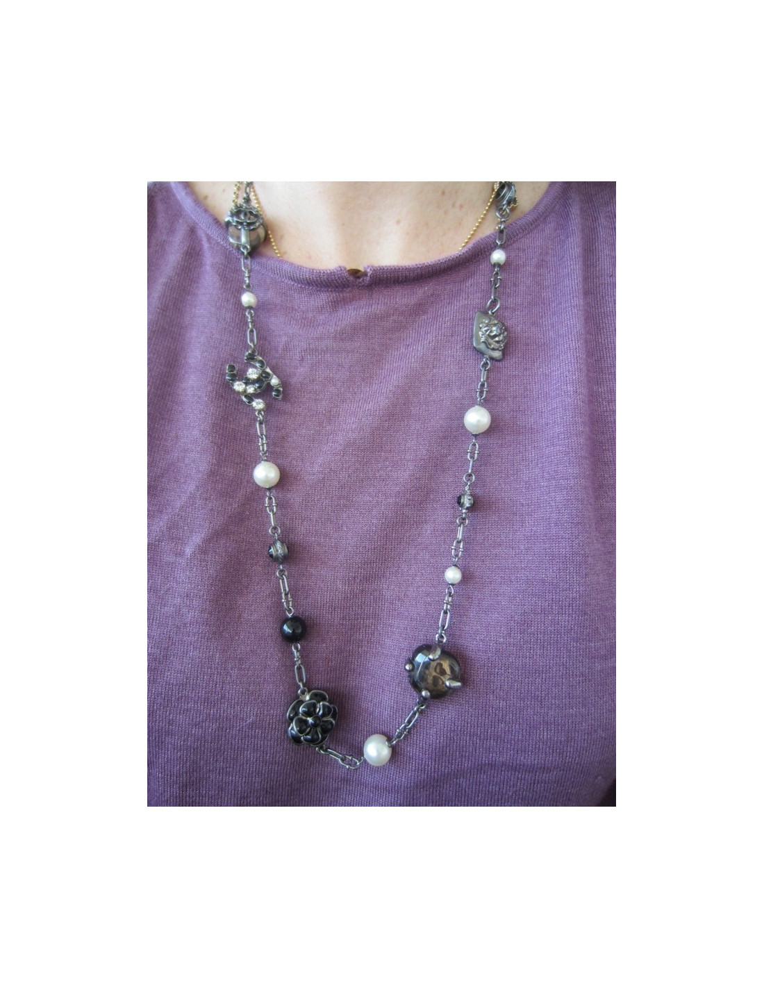 Sautoir changeant car chaque breloque a une double face : le lion devient CC en strass, la fleur marguerite de vient camélia, le CC ésine noire et strass devient CC en ruthénium...