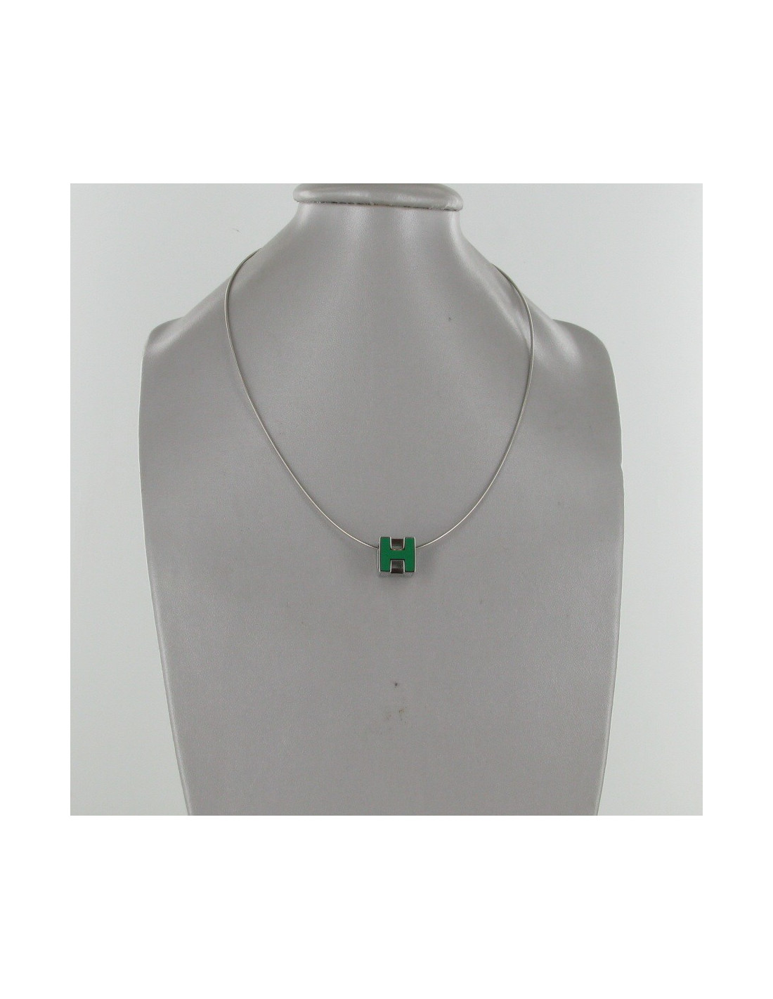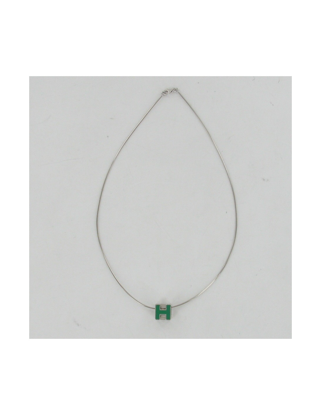 Pendentif de forme cubique représentant le H d'HERMES (1.2*1.2 cm). Emaillé vert sur 2 faces, 2 faces métal palladié et 2 faces pour le passage du lien.