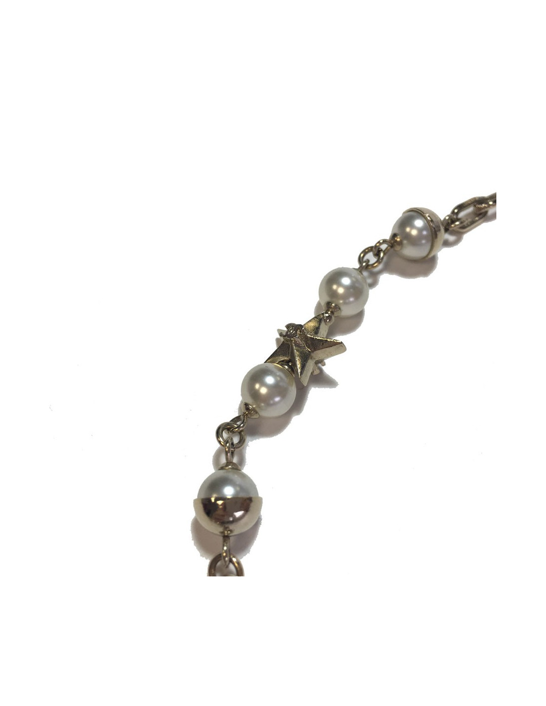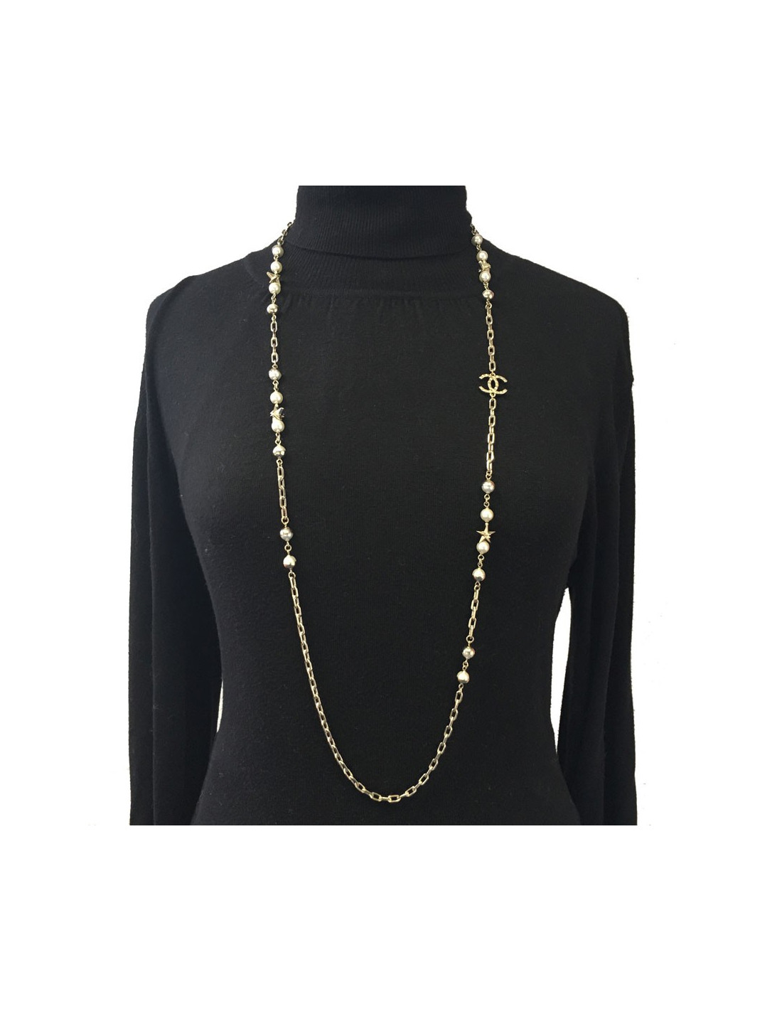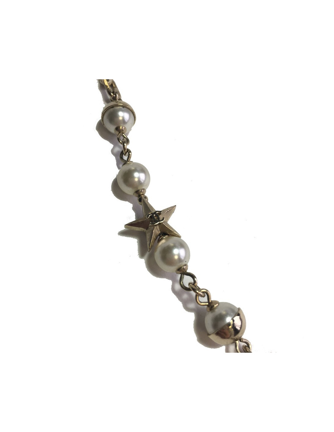Sautoir Chanel en métal doré, perles nacrées, CC doré et étoiles dorées. Jamais porté.