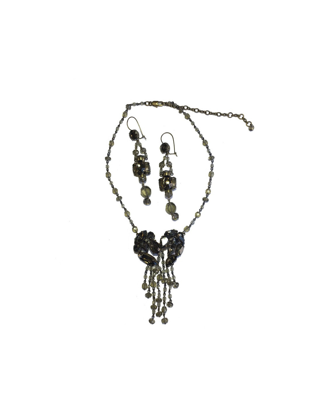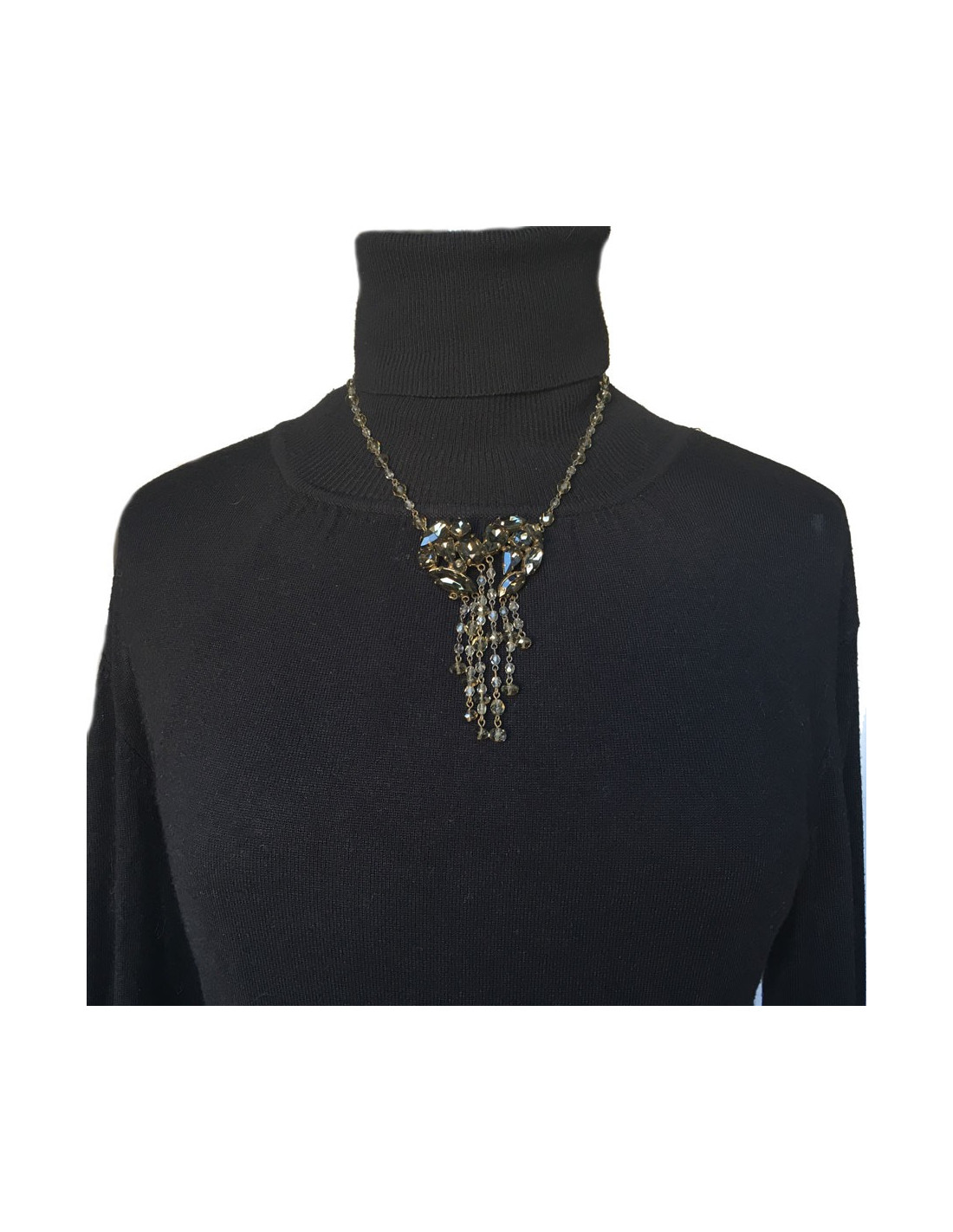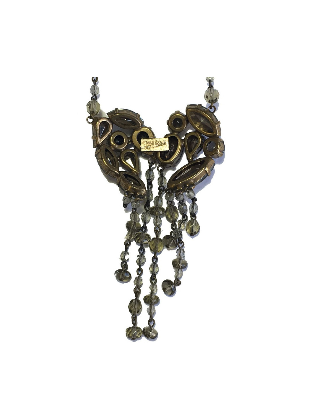 Parure Jean Paul Gaultier comprenant un collier et des boucles d'oreille clous . L'ensemble est en métal doré et pierres facettées de couleur ambrée de différentes tailles. Le collier a un pendentif de pierres facettées et de pampilles en petites perles ambrées.