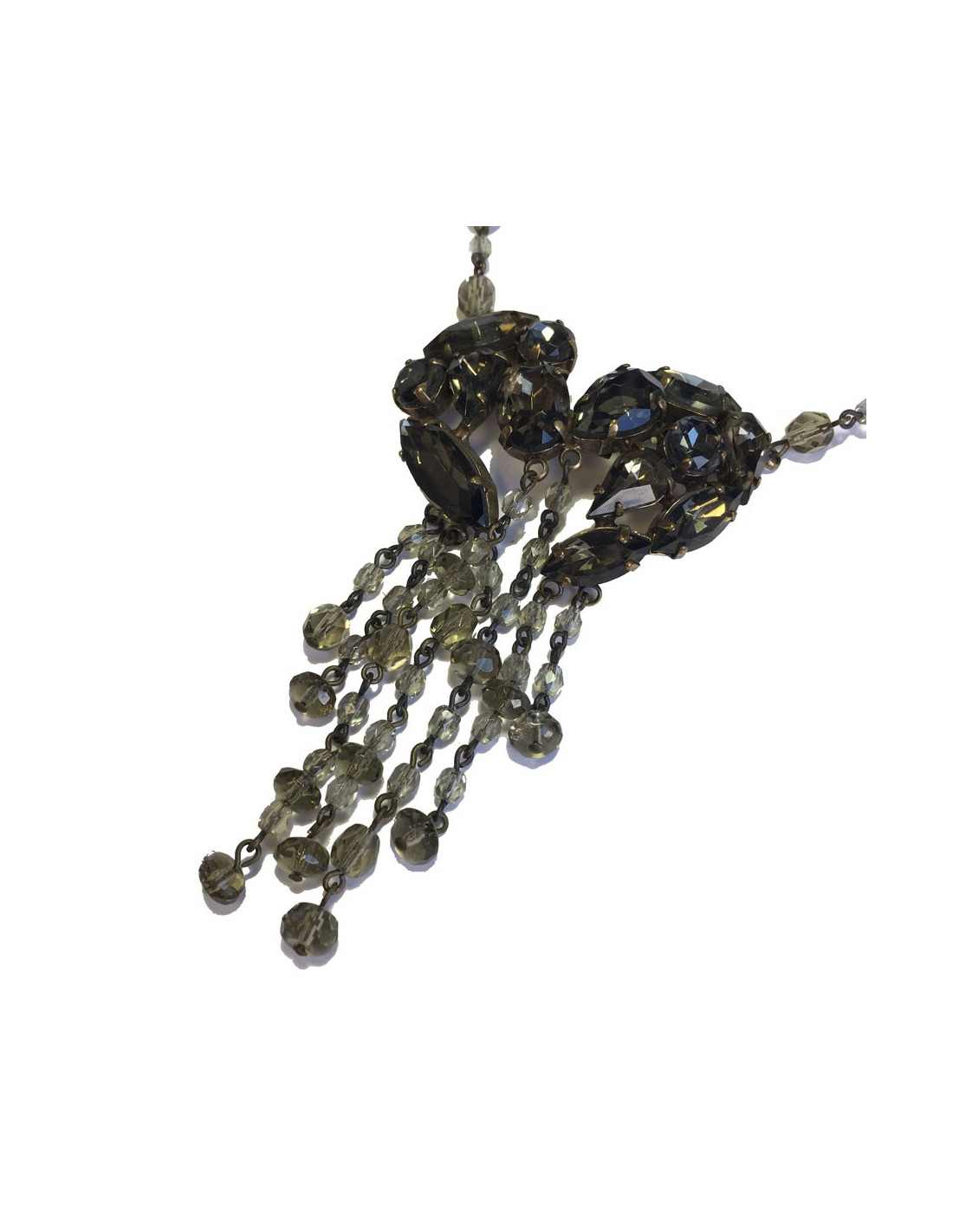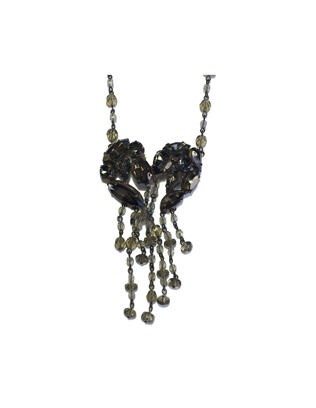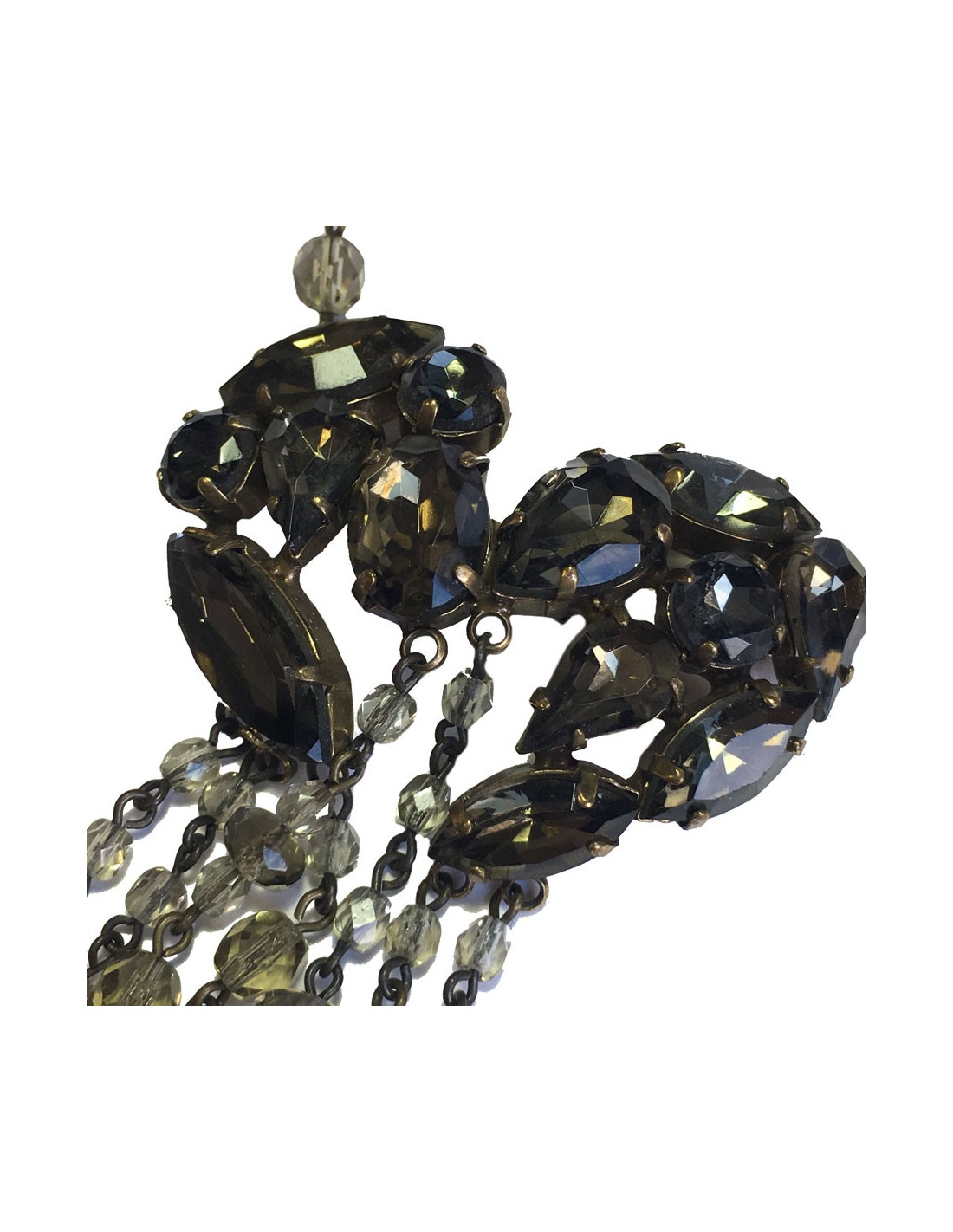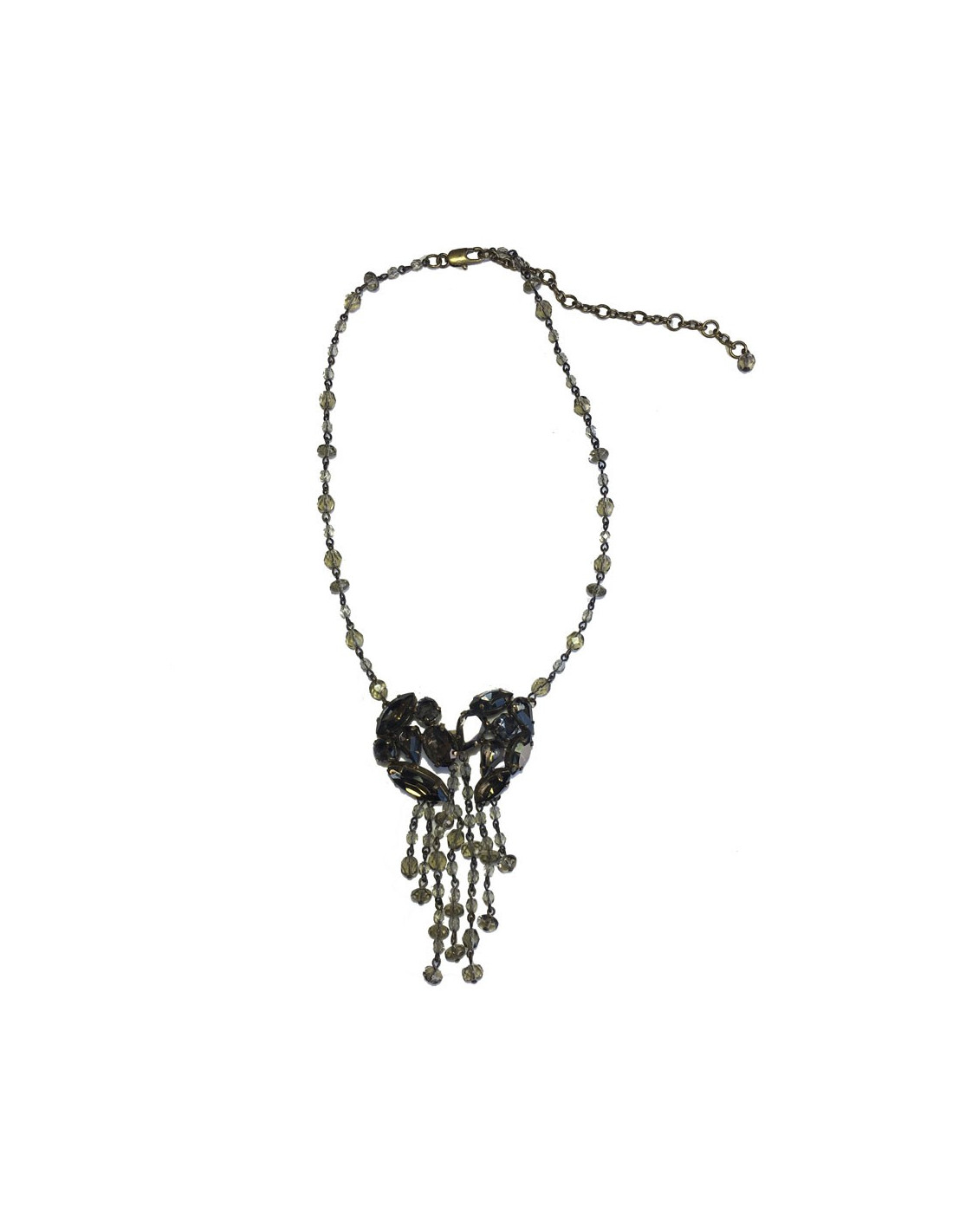 Parure Jean Paul Gaultier comprenant un collier et des boucles d'oreille clous . L'ensemble est en métal doré et pierres facettées de couleur ambrée de différentes tailles. Le collier a un pendentif de pierres facettées et de pampilles en petites perles ambrées.