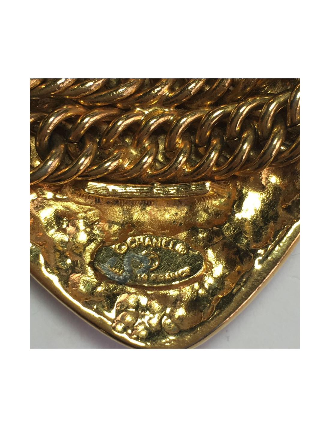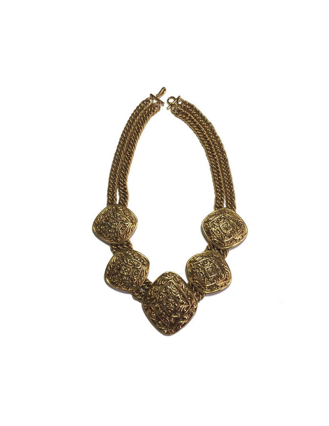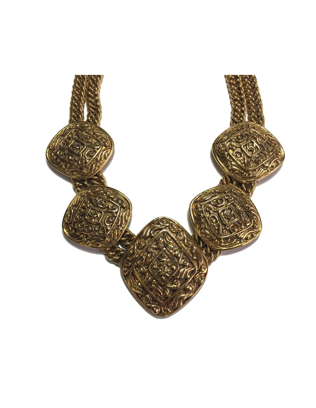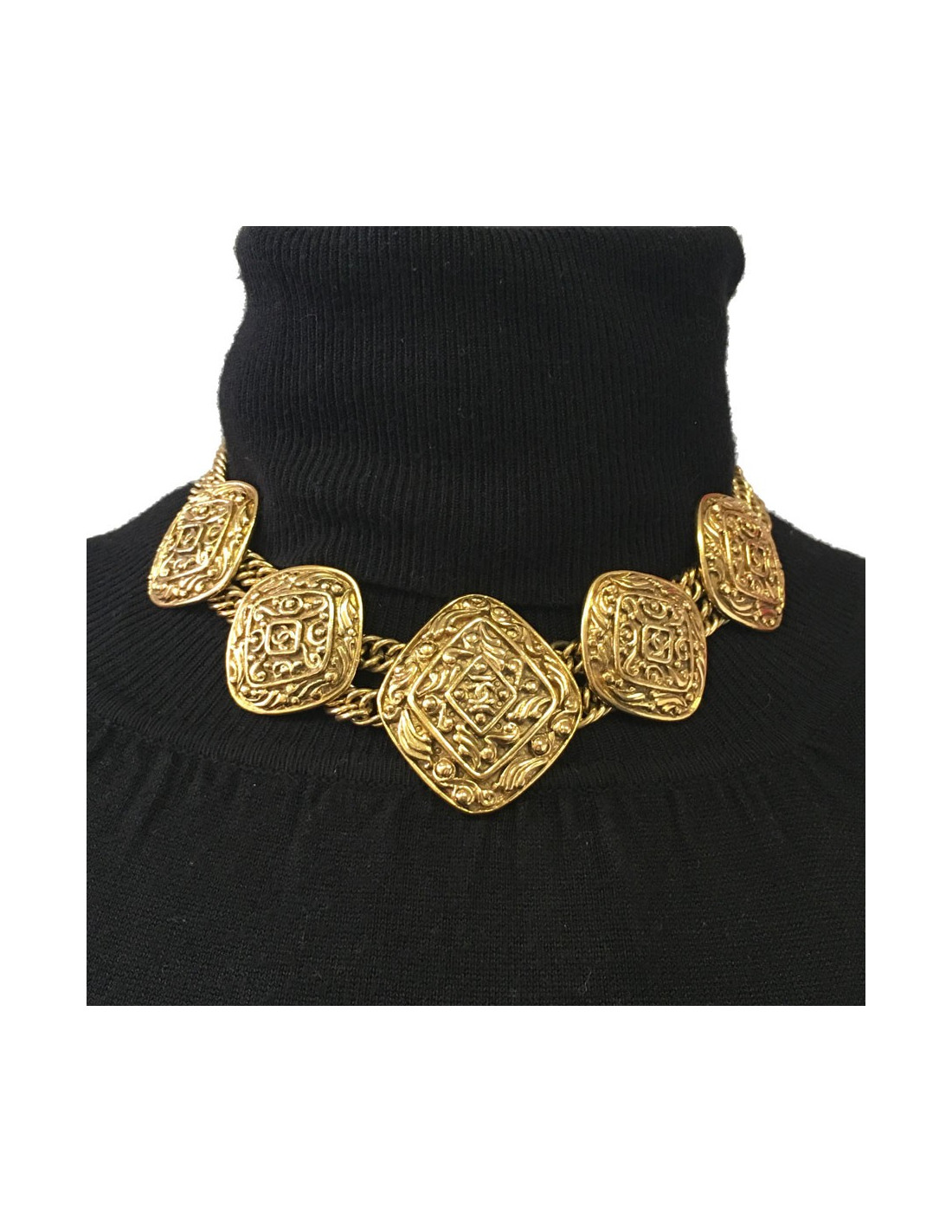 Collier ras de cou Chanel Couture en métal doré. Double chaîne en maille et fermoir crochet. 5 médailles en forme de losange,