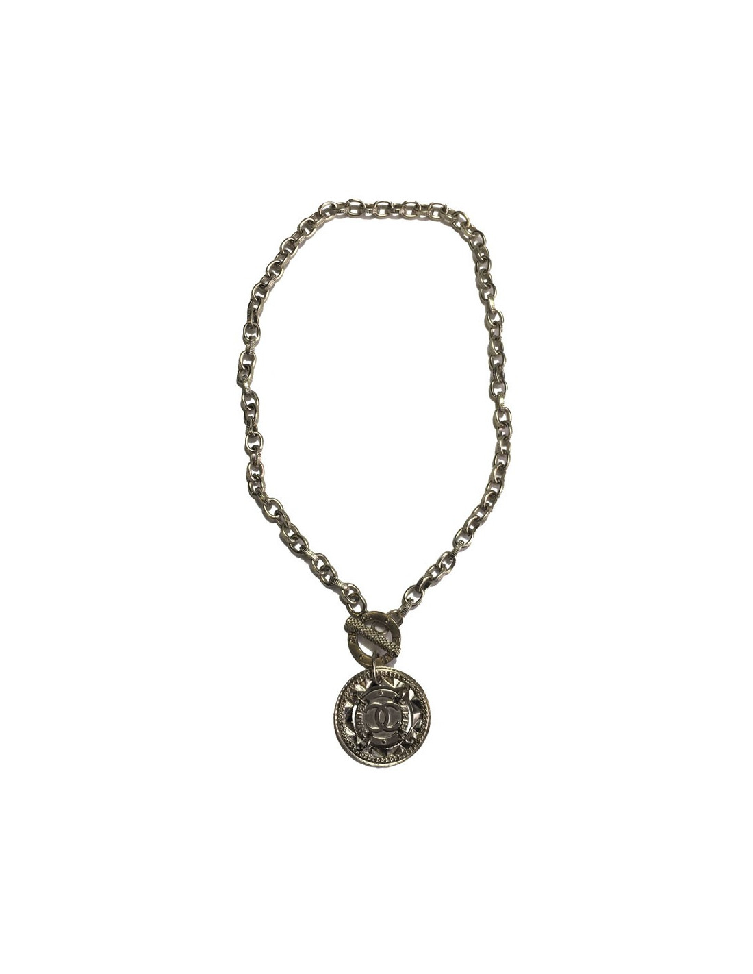 Tendance!, collier Chanel en métal de couleur or pâle. Médaille ronde avec un double C au centre. Le fermoir cabillot se porte sur le devant du collier. Inscription CHANEL PARIS sur l'anneau ainsi que sur une partie de la médaille. Fabrication française.