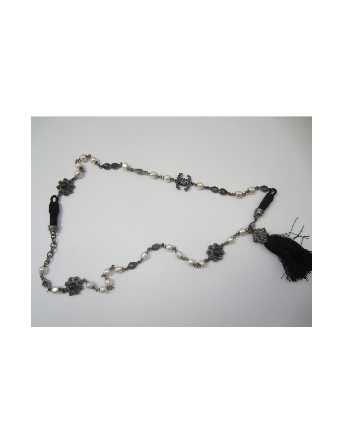 Sublime sautoir Chanel, Collection Paris-Byzance, perles nacrées , CC en pâte de verre noire pailleté, éléments en pâte de verre pailleté noir, gouttes en pâte de verre grise translucide, monté sur agent noir mat, pompon avec pampilles en tissus noir et attache en tissus noir.