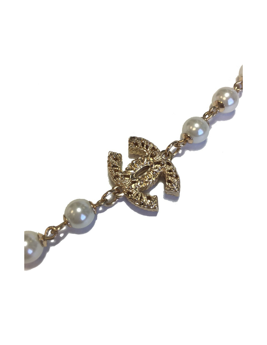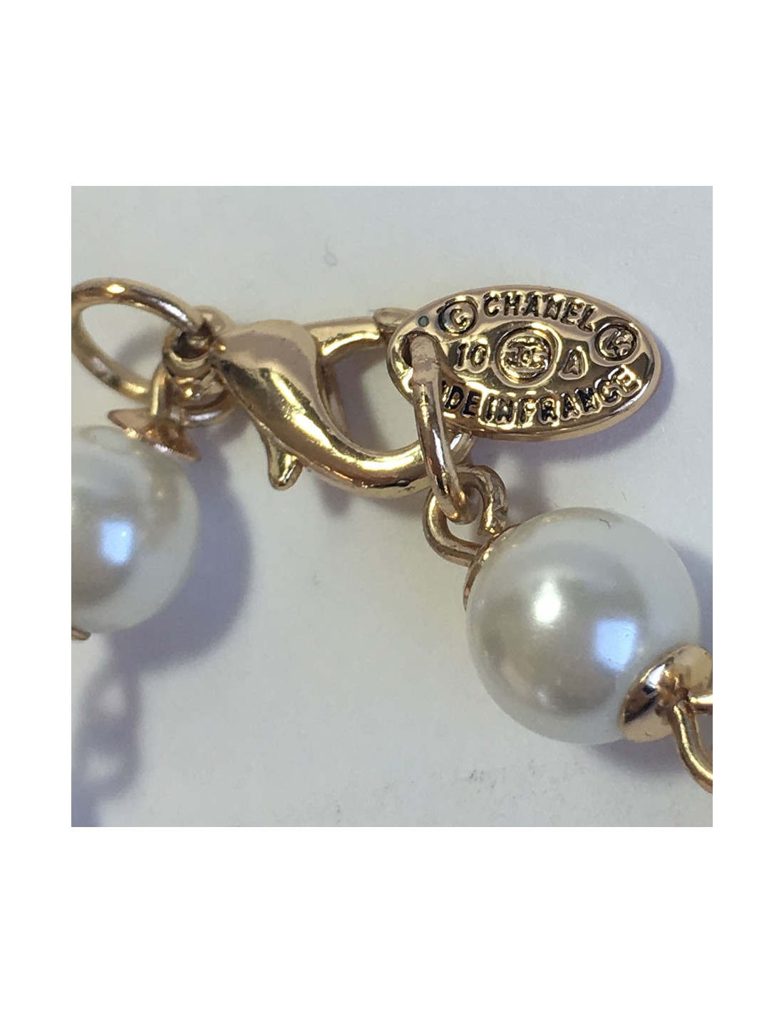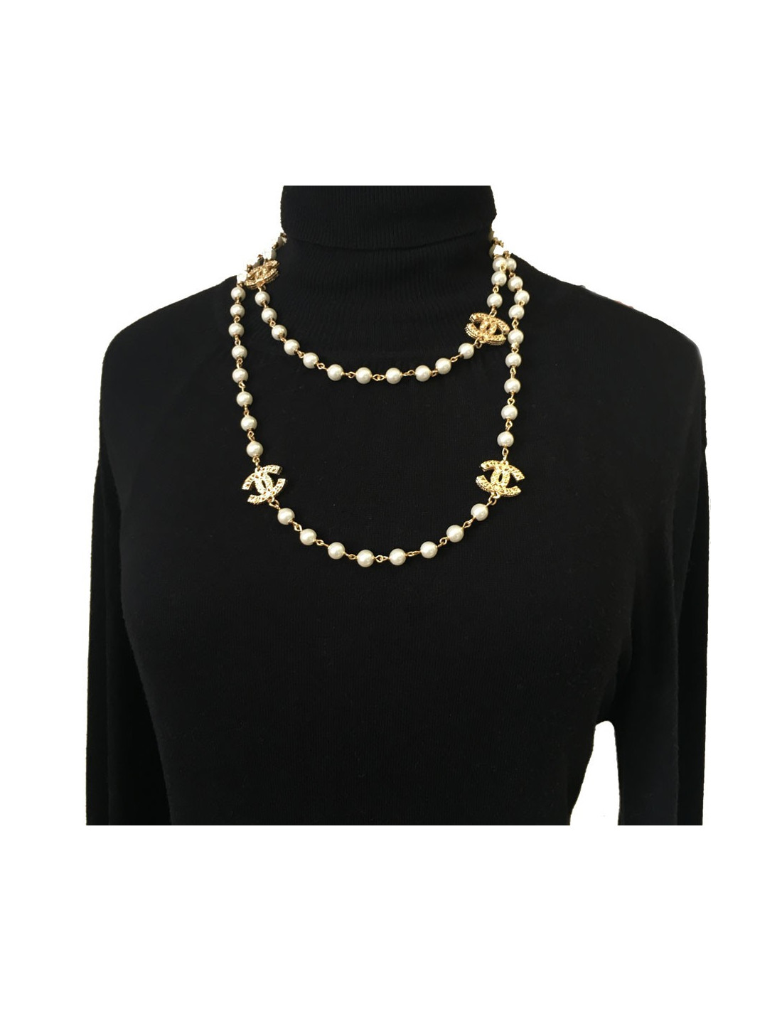 Magnifique sautoir Chanel en perles nacrées et 4 doubles C dorés. En très bon état.