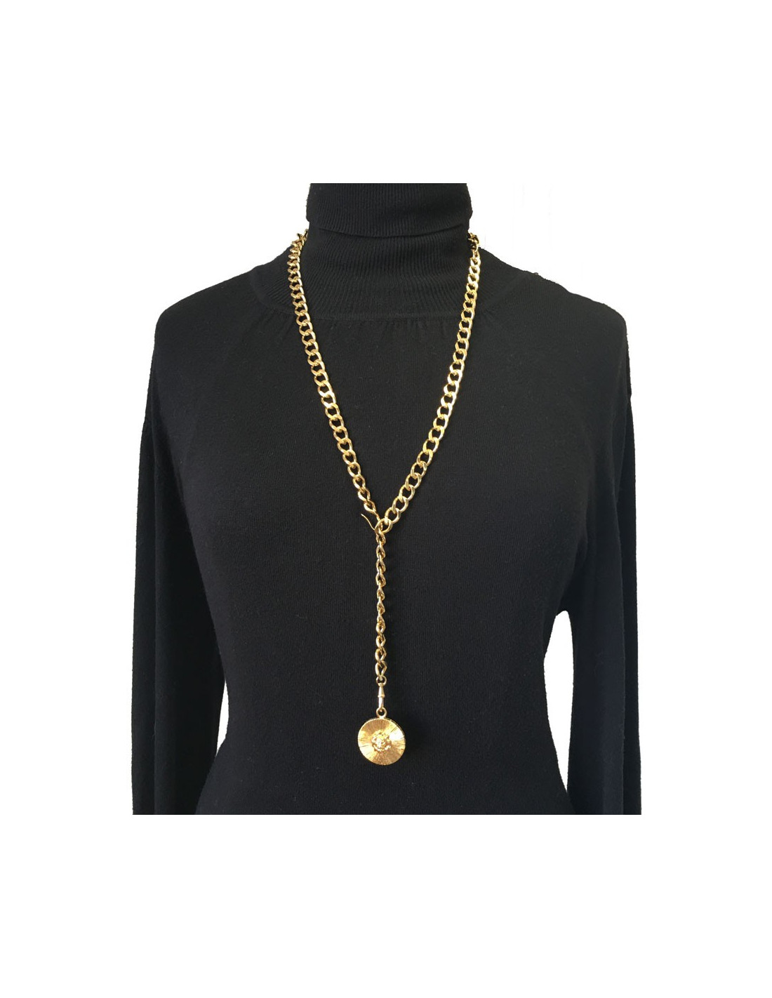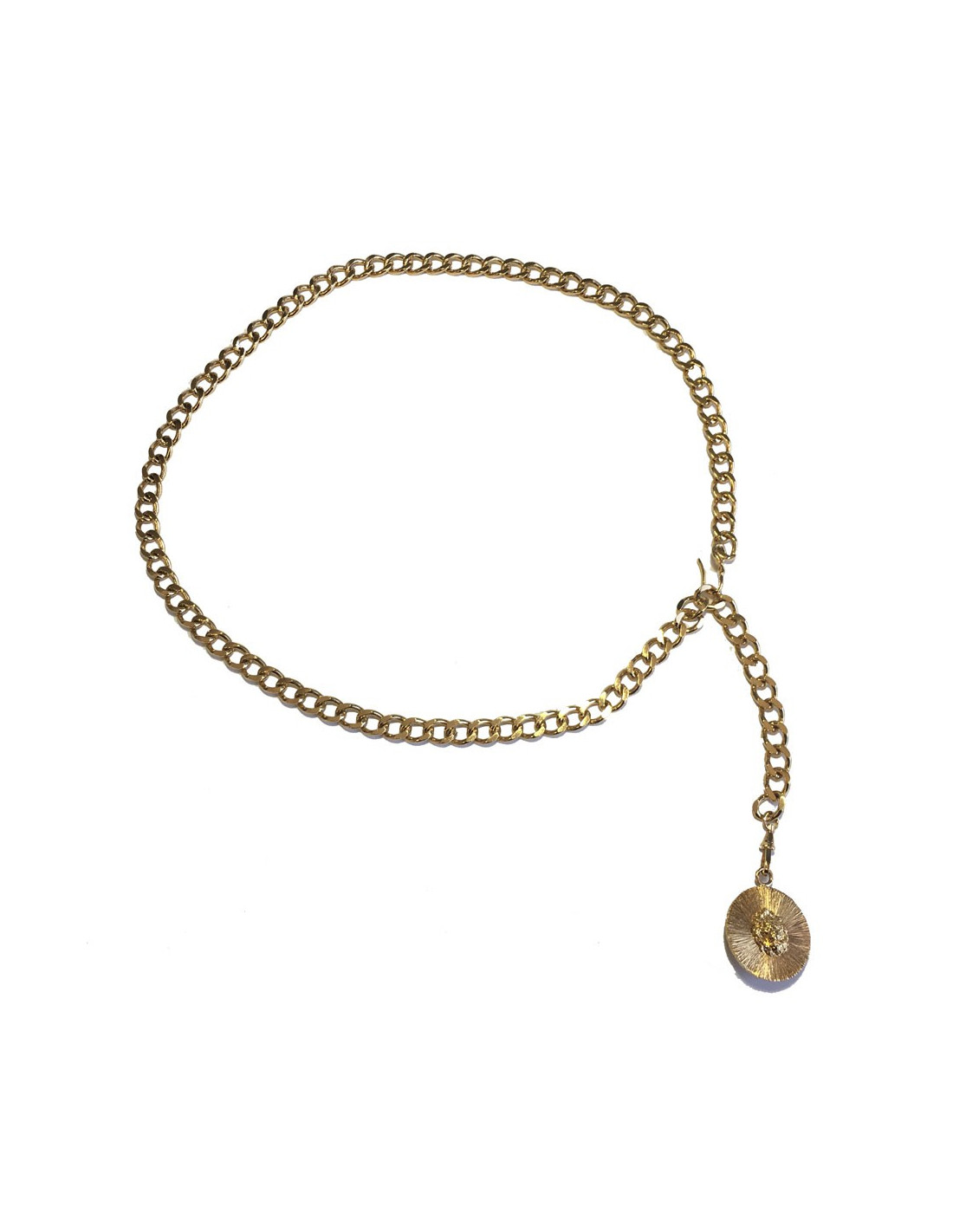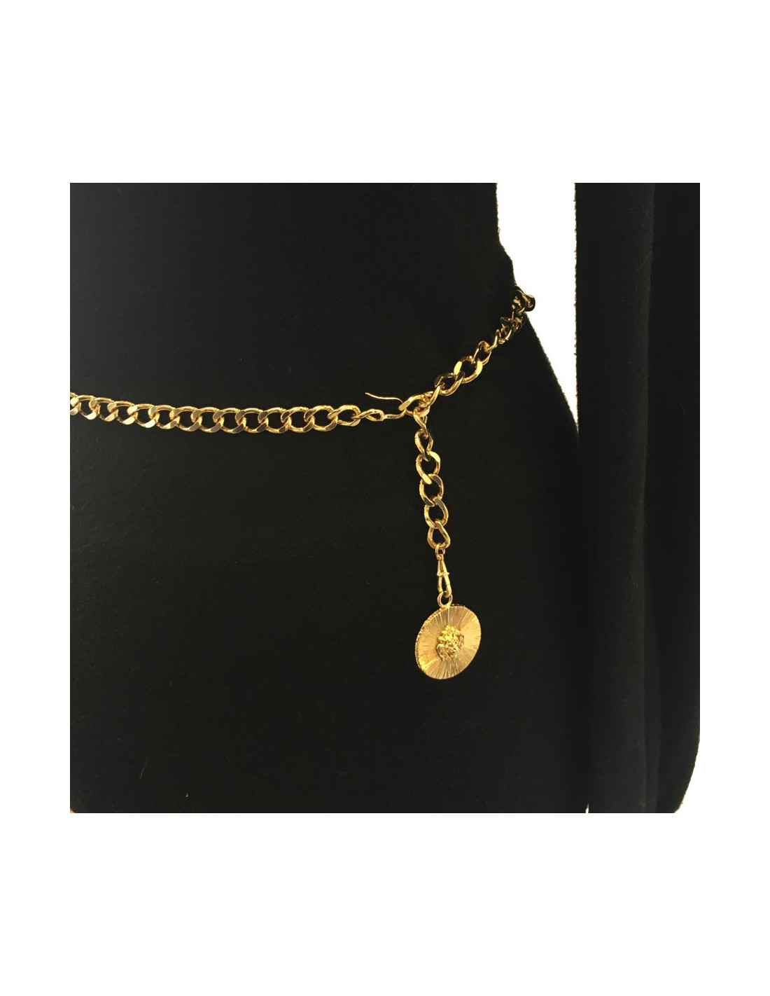 Ceinture sautoir Chanel chaîne maille en métal doré. Ce bijou se termine par une pièce ronde avec un tête de lion en relief.