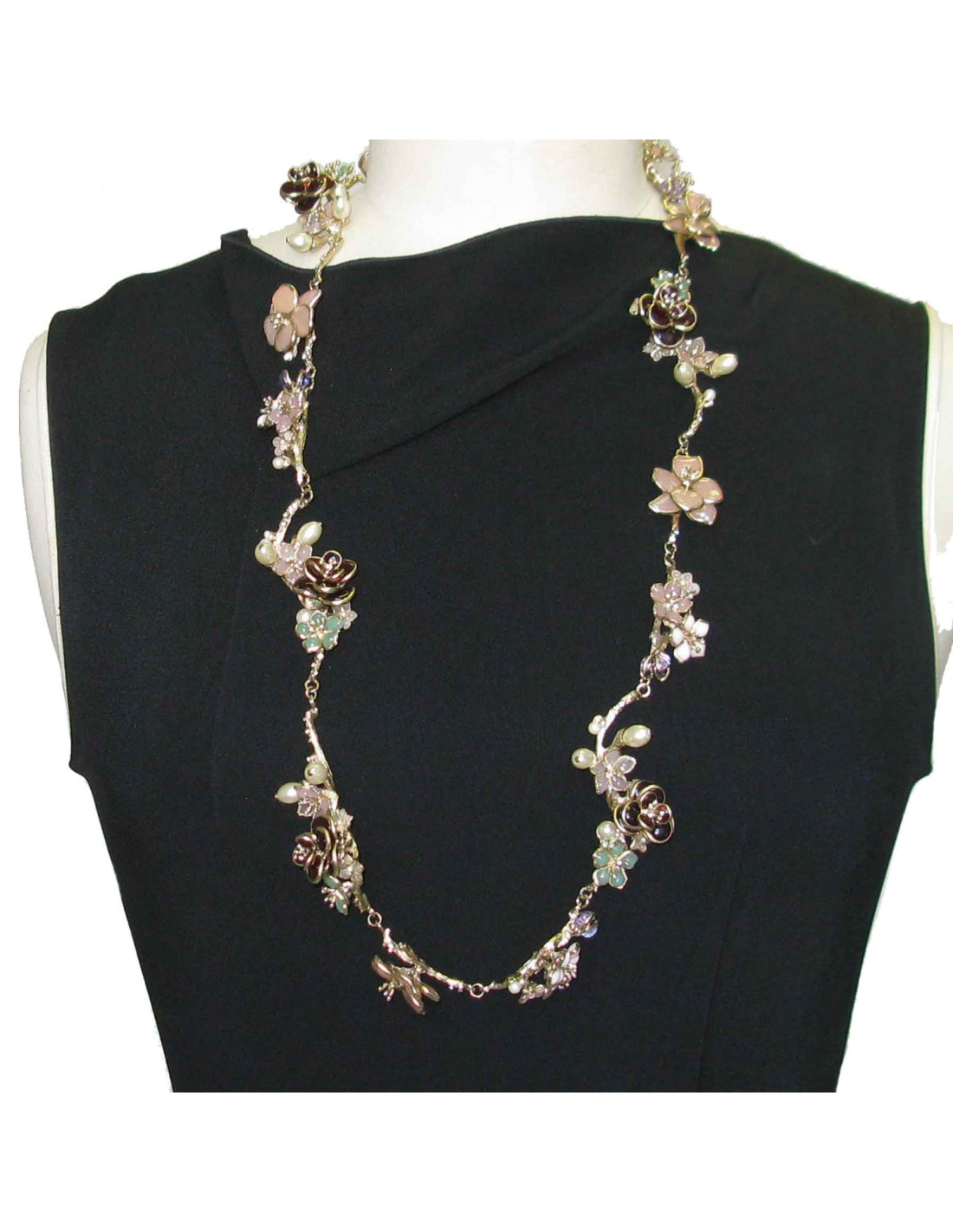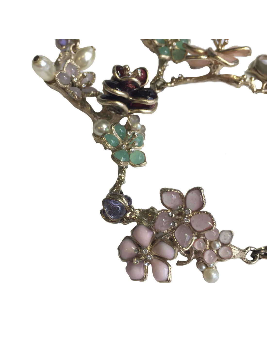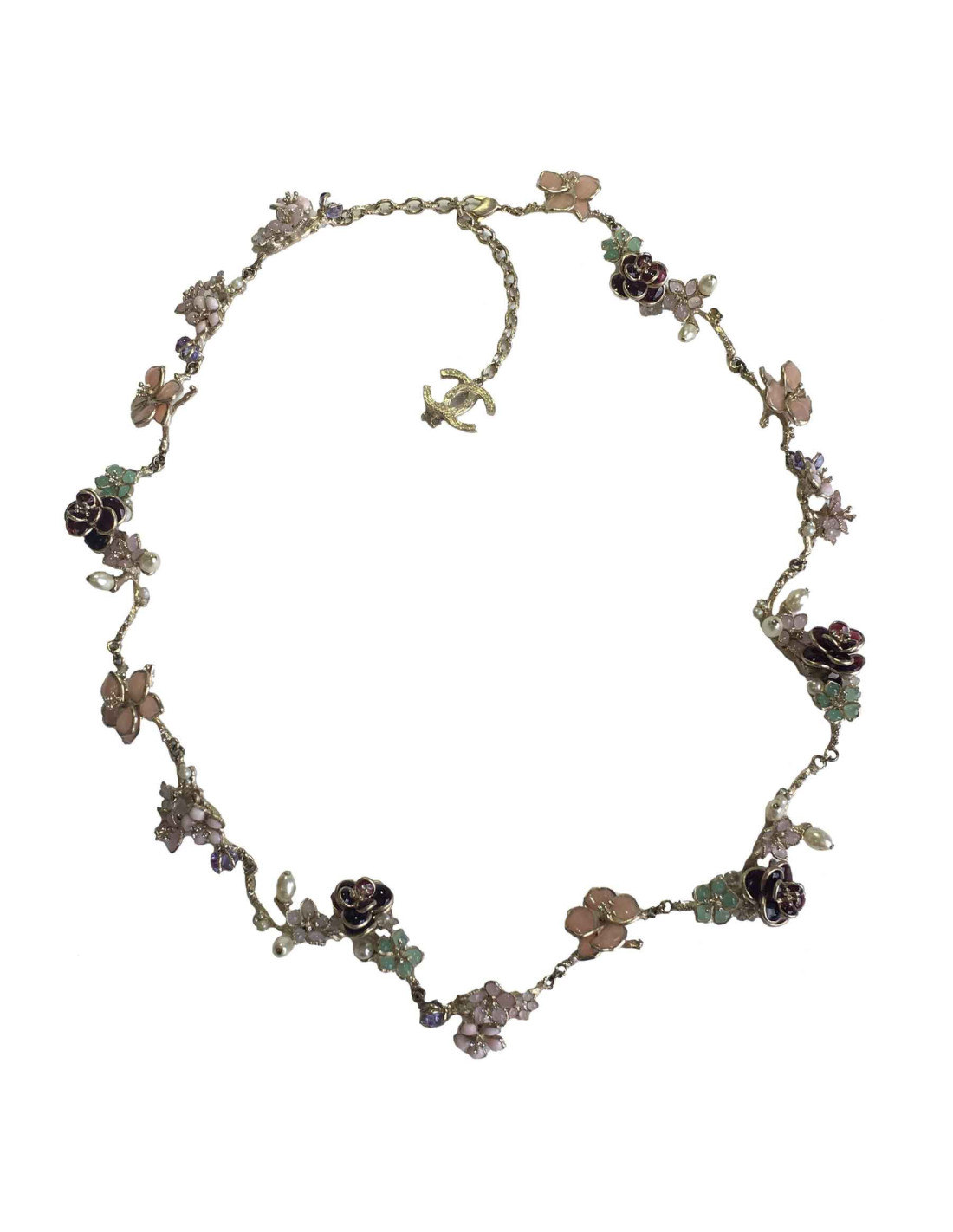 Sublime ceinture-sautoir couture Chanel en métal doré couleur or pâle, fleurs pétales en pâte de verre de diverses couleurs : rose, bordeaux, vert, mauve. perles nacrées ovales et brillants. Un beau CC serti de brillants et d'une petite fleur termine la chaîne du fermoir.