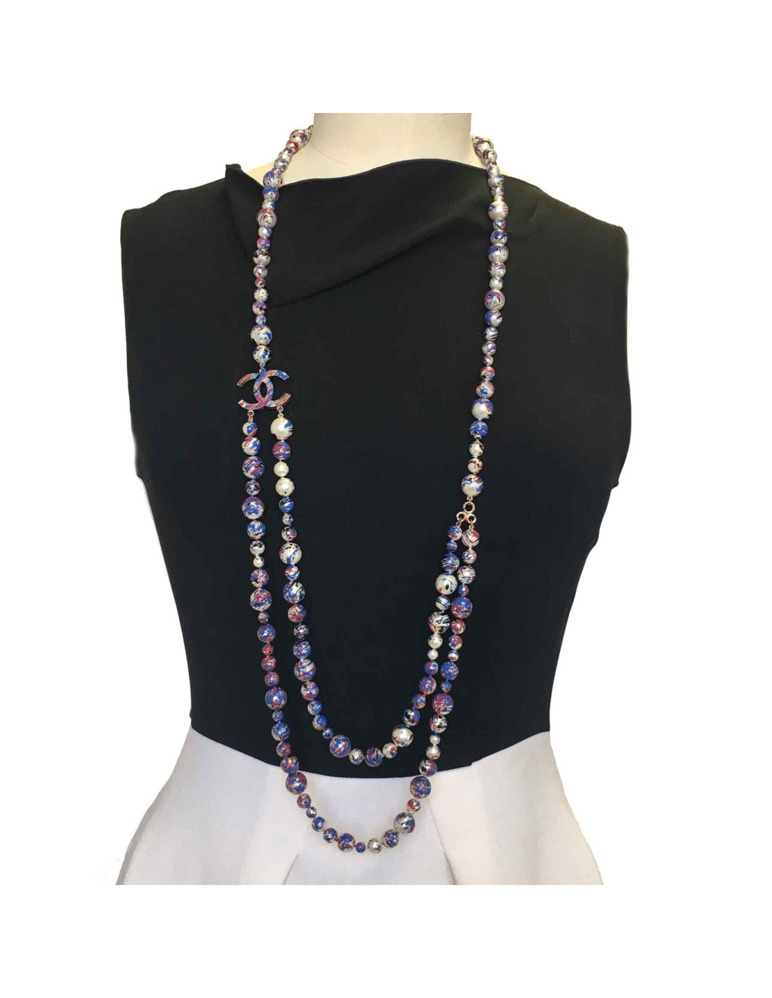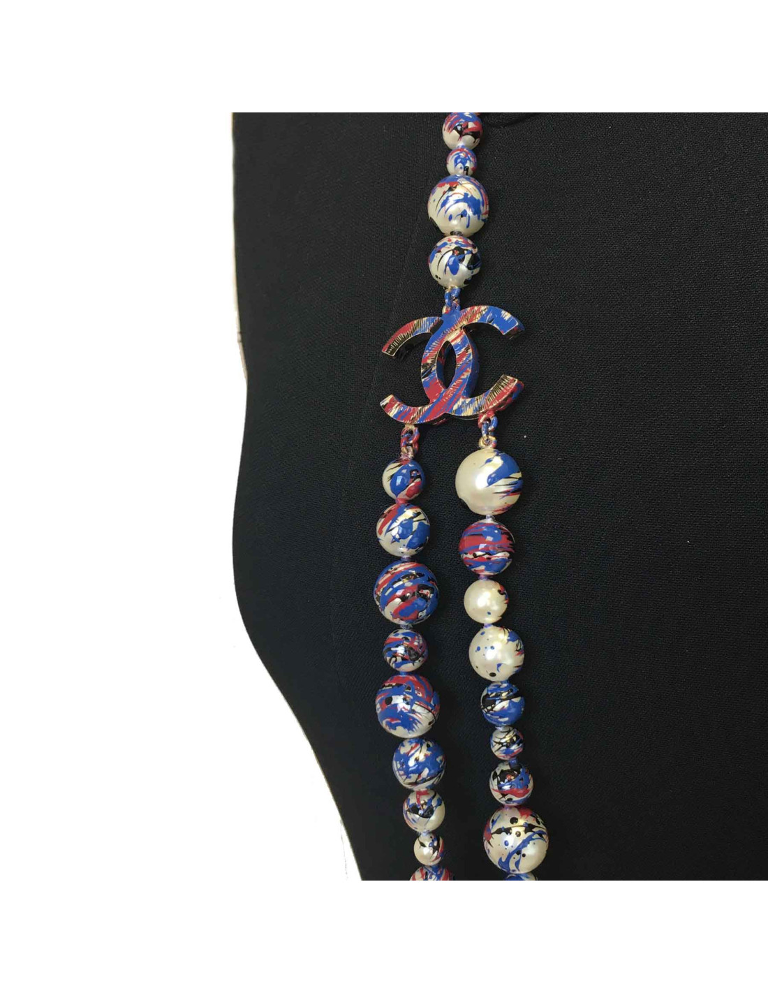 Très beau sautoir Chanel de la collection "Chanel Airlines", défilé Printemps - été 2016 en perles nacrées recouvertes de bleu-blanc-rouge, couleurs du drapeau français et un CC.