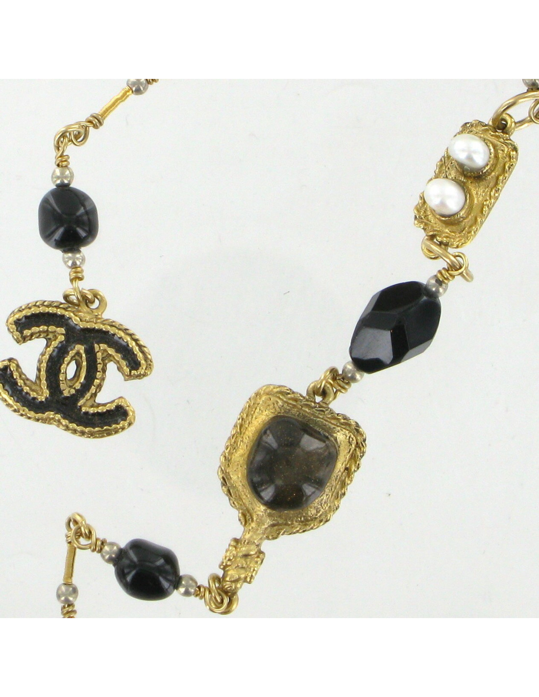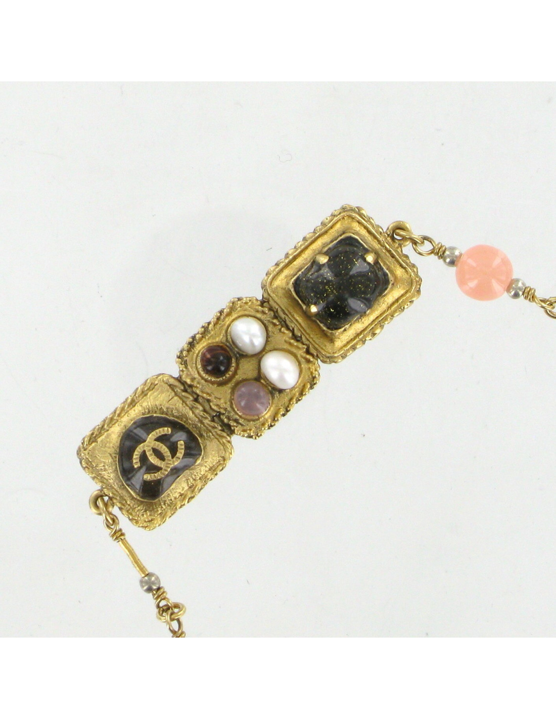 Magnifique sautoir CHANEL composé de perles nacrées, de plaques métalliques doré à l'or fin (très couture) surplombées de pierres ambres, noires, roses et de cabochons marrons. Un sautoir Chanel dans l'esprit purement bizantin, très cher à Coco Chanel.