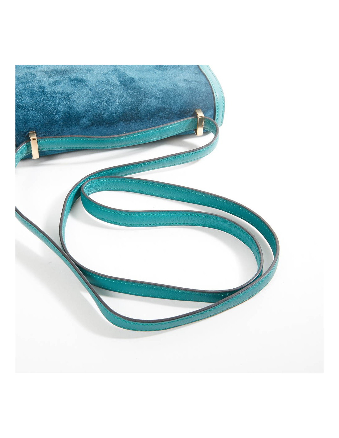 Pièce d'exception de la Maison Hermès, en cuir de veau façon daim, nommé doblis. Il est bicolore : vert malachite et bleu océan. La bijouterie est dorée (il y a toujours les plastiques dessus). Il a un double compartiment, et l'intérieur est en cuir swift vert malachite, avec une poche fente. Il se porte à l'épaule ou croisé (Constance Elan).