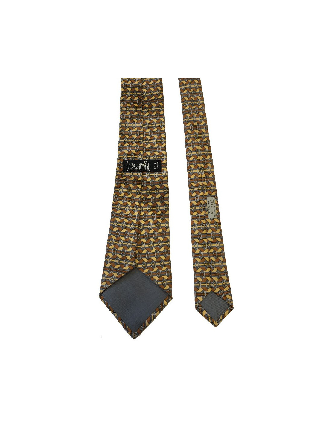 Cravate HERMÈS vintage en soie imprimée gris, marron et jaune clair