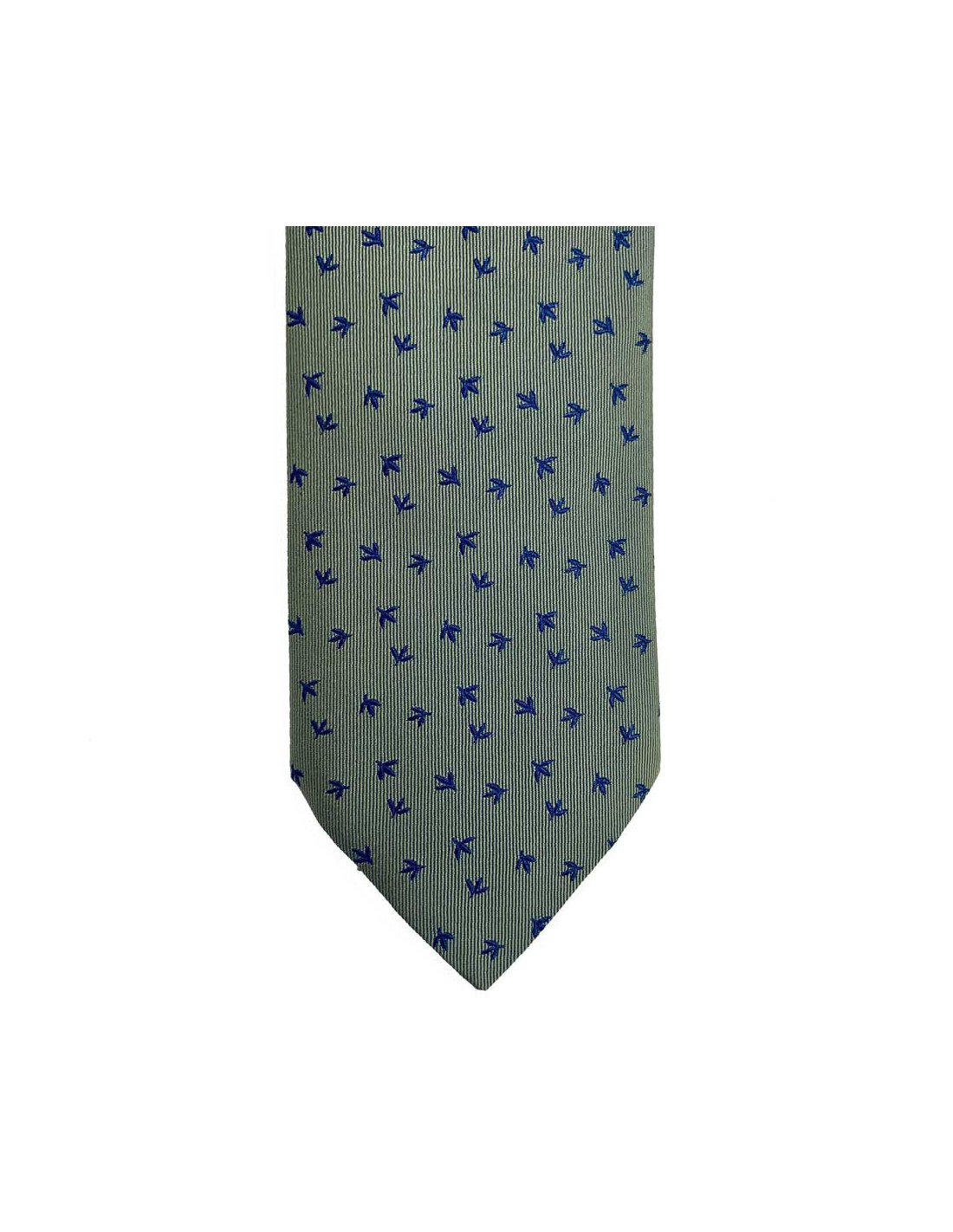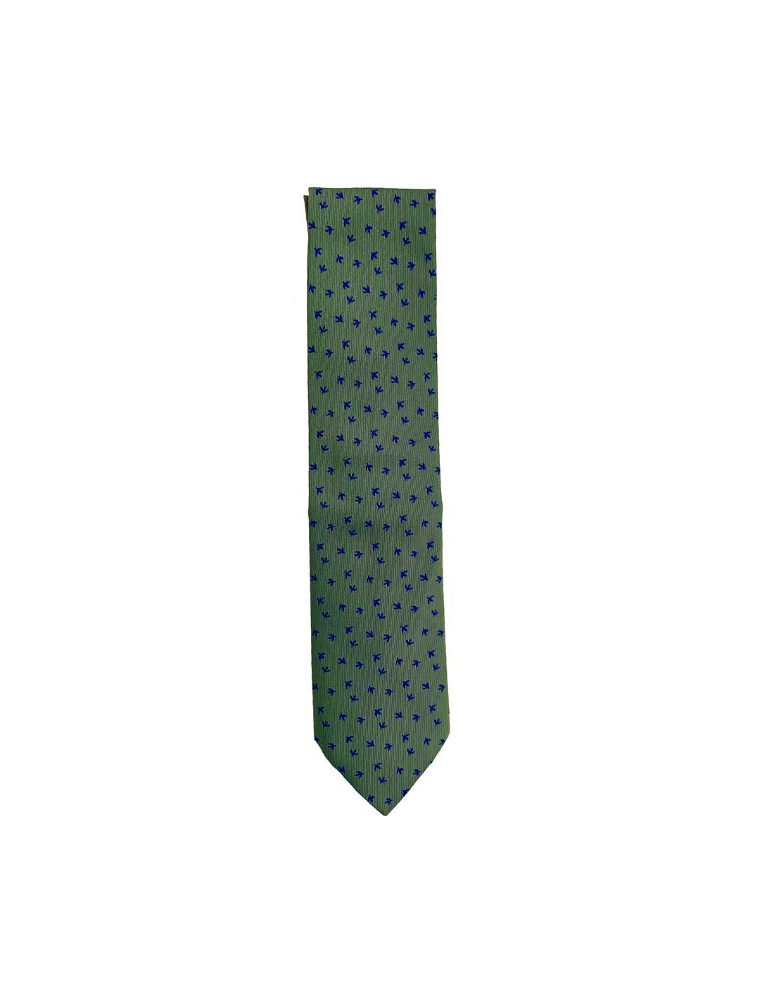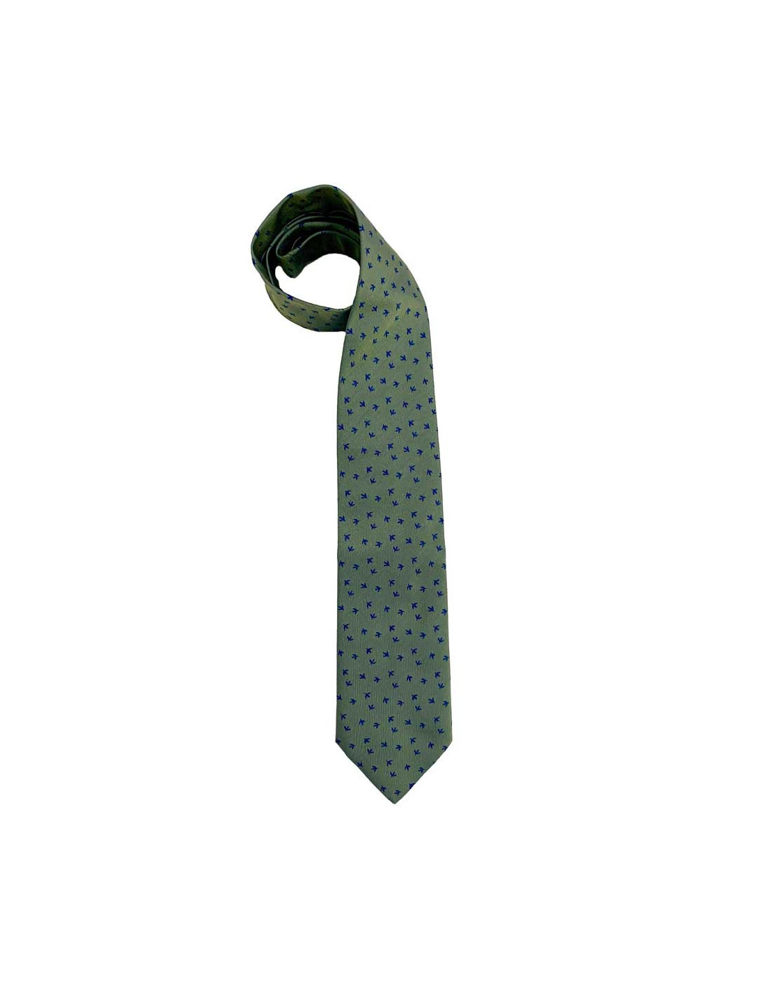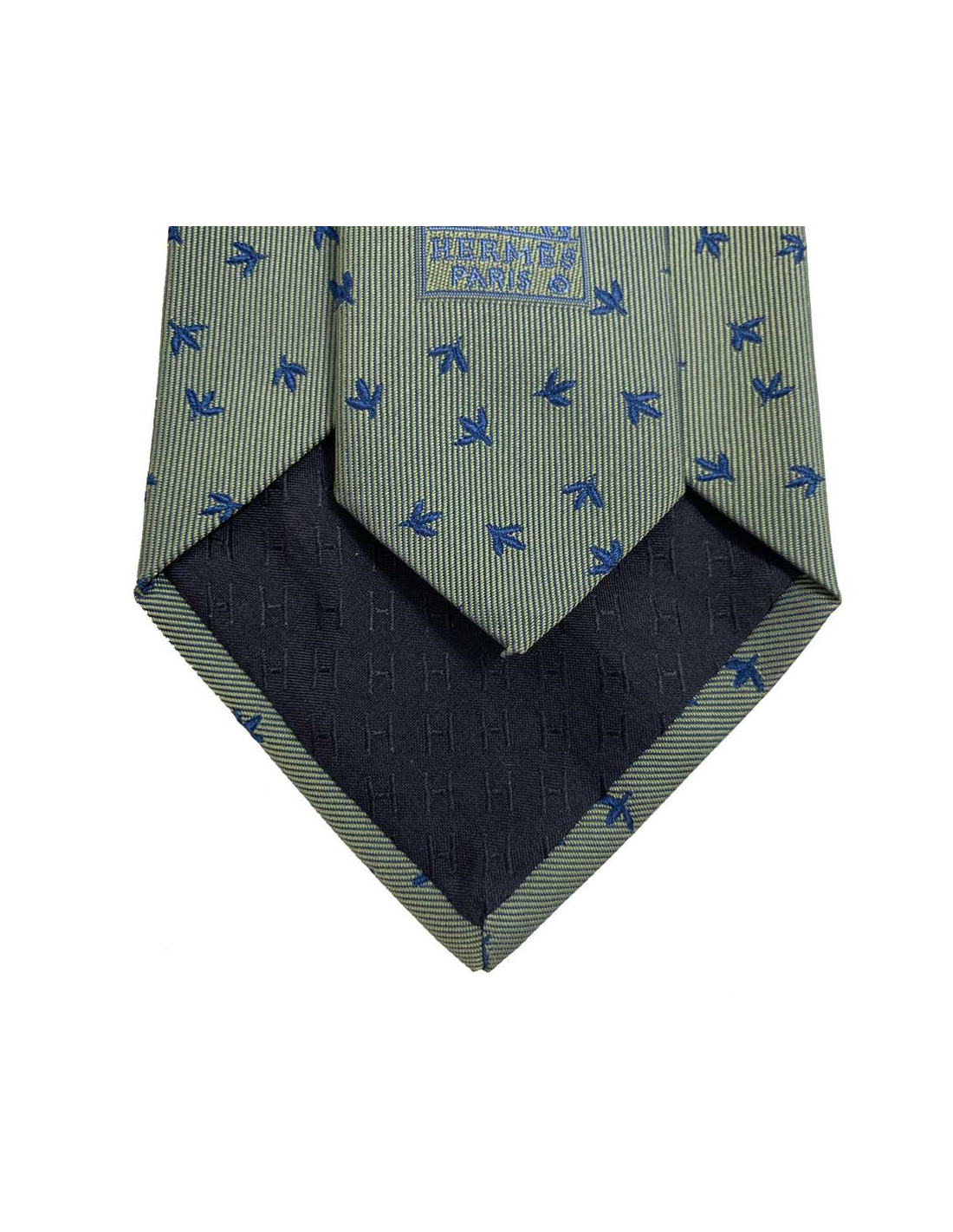 Cravate de la Maison HERMES en soie kaki. Le motif : feuilles. La doublure est en soie bleu marine monogrammée H. Cette cravate est sobre et s'accordera avec tous vos costumes.