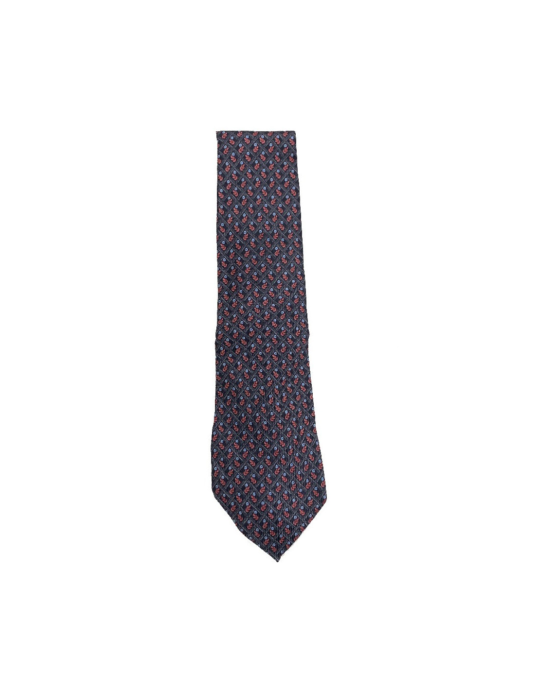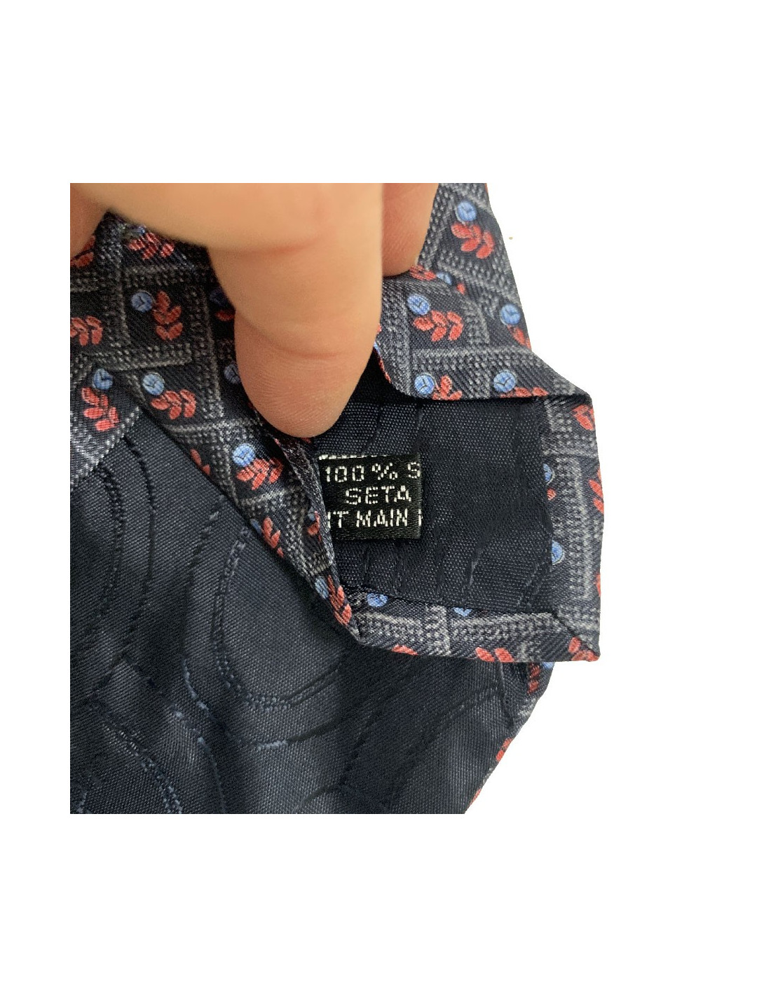 Très belle cravate vintage de la Maison Christian Dior. Elle est en soie grise et à motifs roses, gris et bleus. Cette cravate a une belle doublure bleu marine monogrammée.