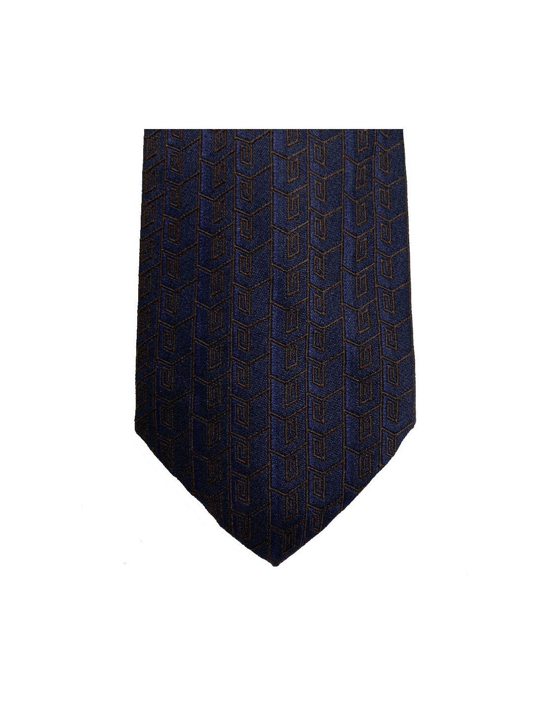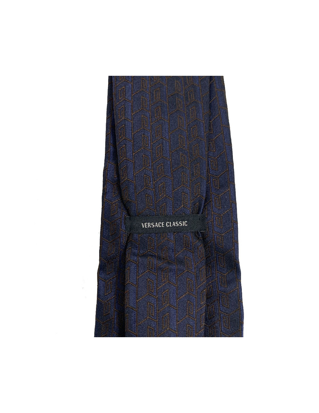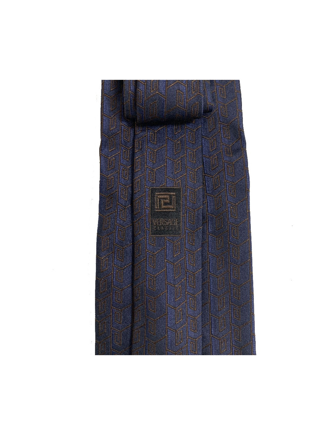 Cravate Versace Classic en soie bleu nuit. Motif Versace en fil de soie marron. C'est une cravate très esthétique de part sa couleur sombre. Sa doublure est en soie bleu nuit monogrammée VERSACECLASSIC.
