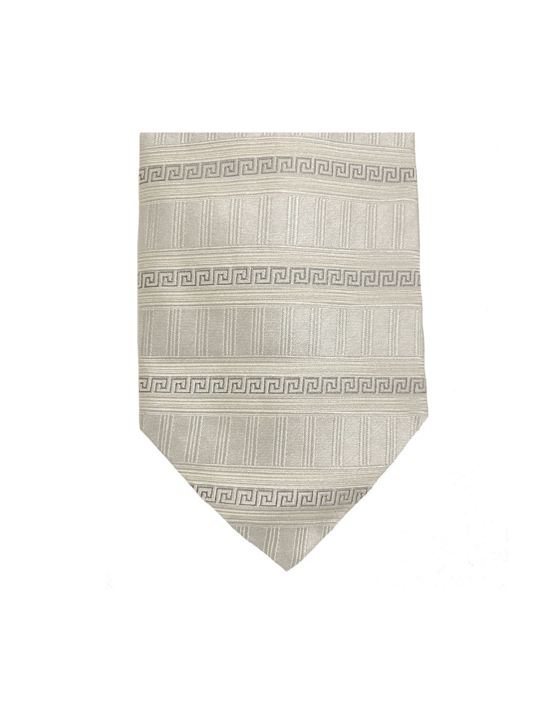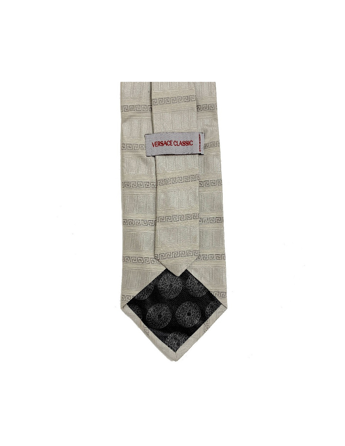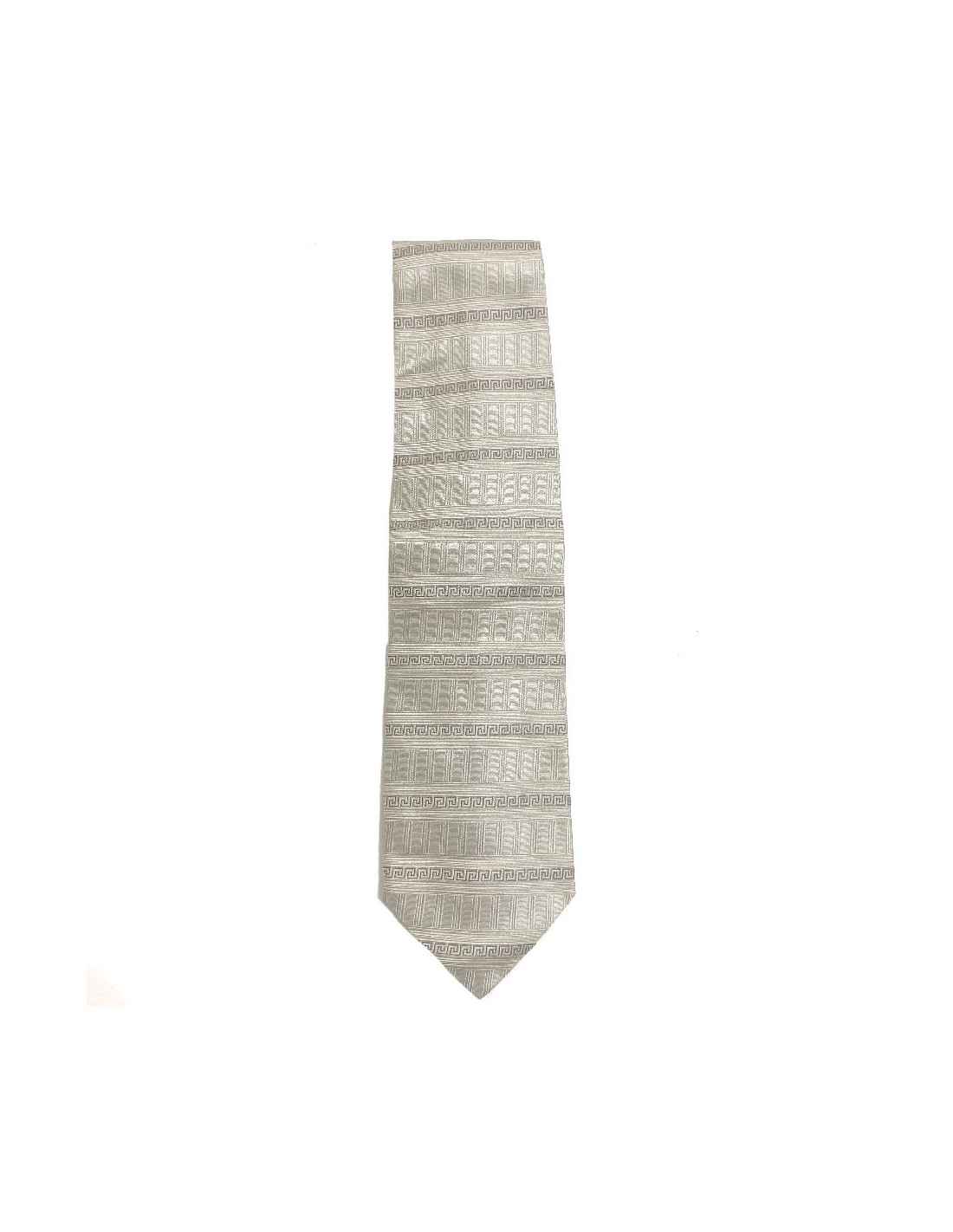 Très belle cravate Versace en soie beige à motif Versace gris.