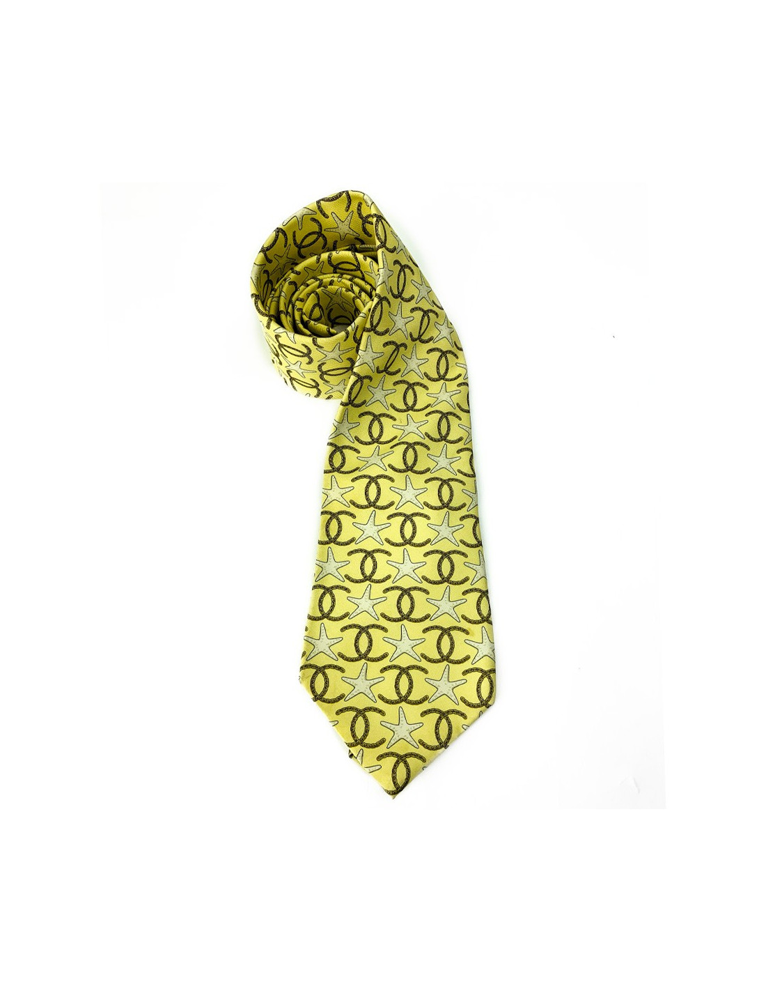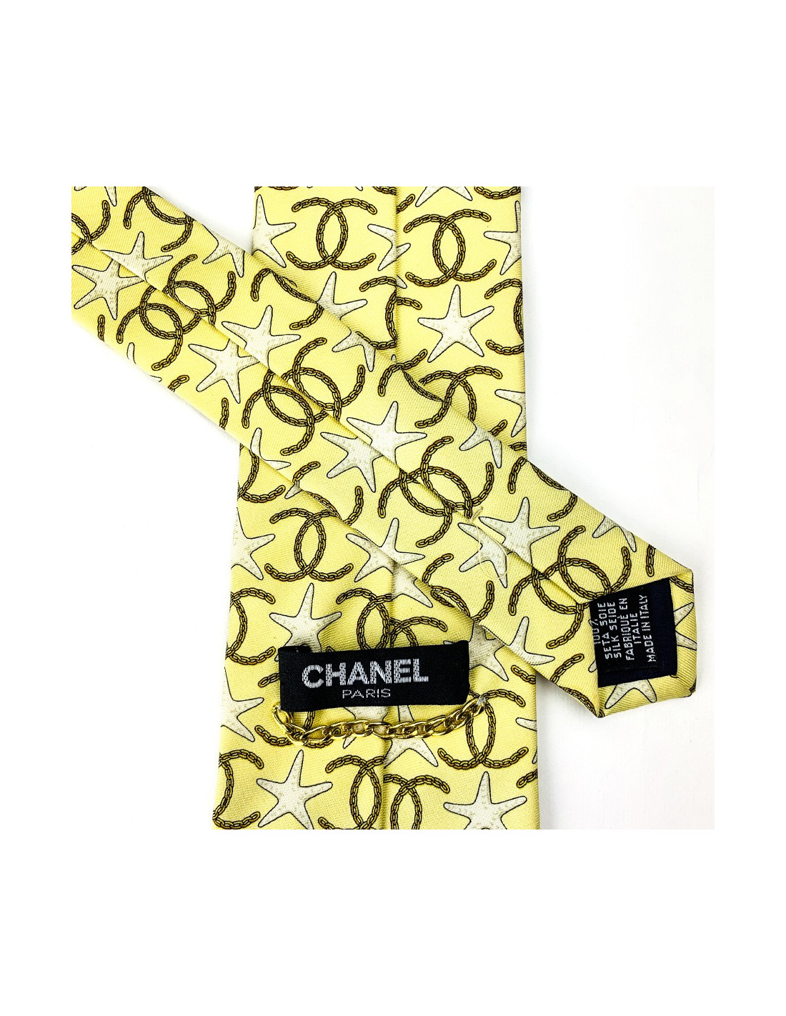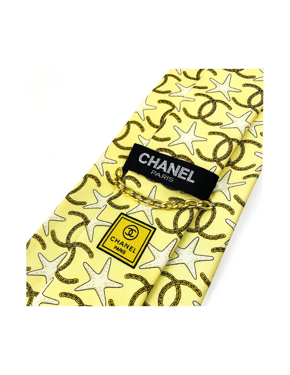 La cravate provient de la Maison Chanel. Sur fond jaune clair, se dessinent des étoiles de mer beiges et des logos CC.