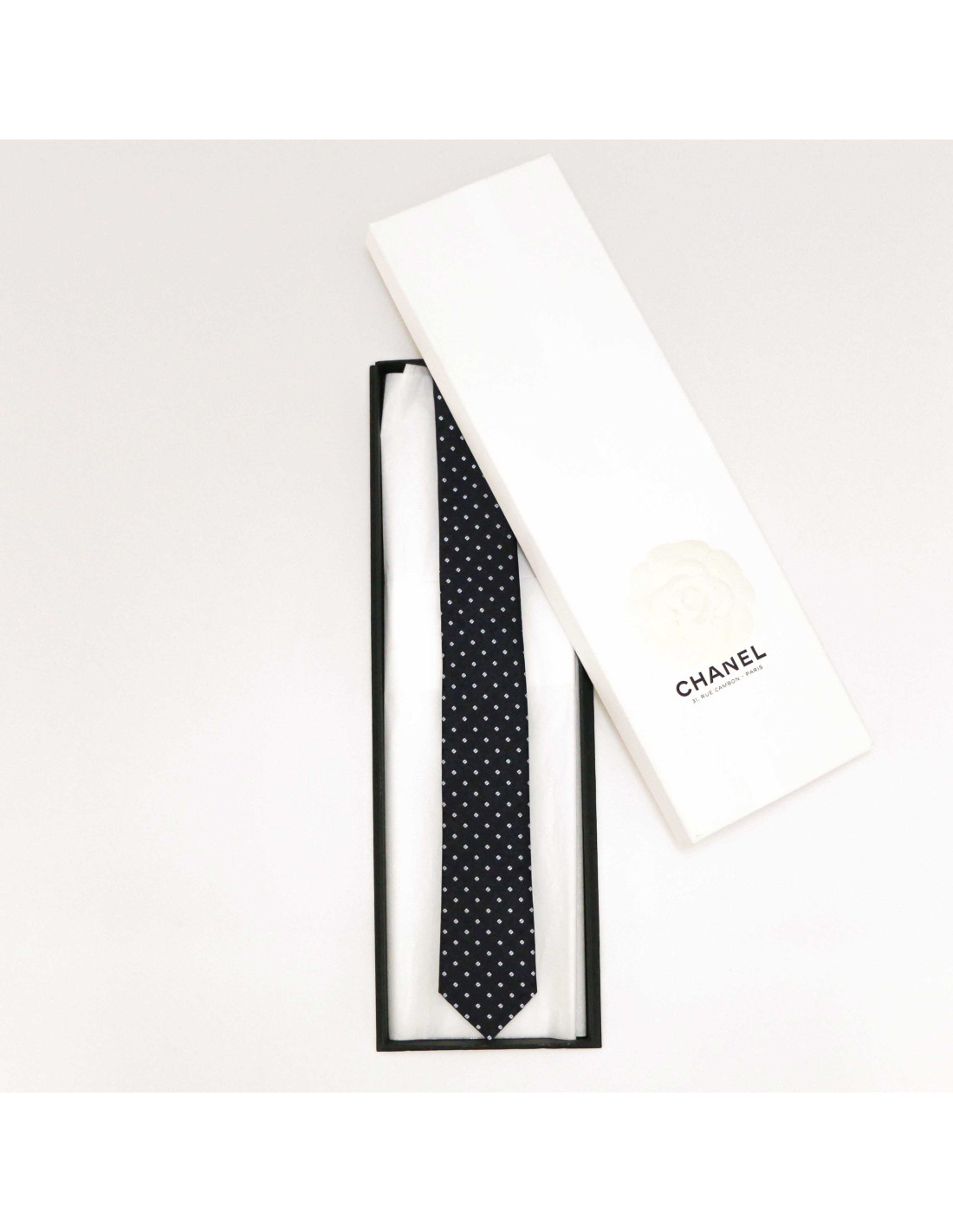 Derniers articles en stock CRAVATES / NOEUD PAPILLON Cravate CHANEL large soie noire CHANEL 37482 650,00 € Cravate CHANEL CC embossé noir Condition : très bon étatMatière : soieCouleur : noirDimensions : longueur totale 110 cmDétails : motif CC embossé, soie brillante Ajouter au panier