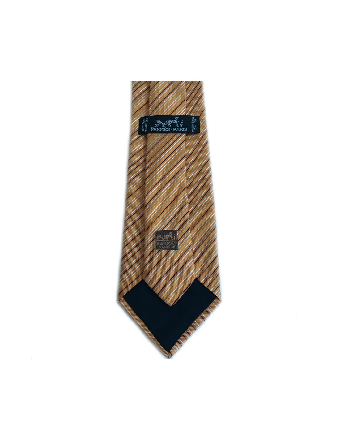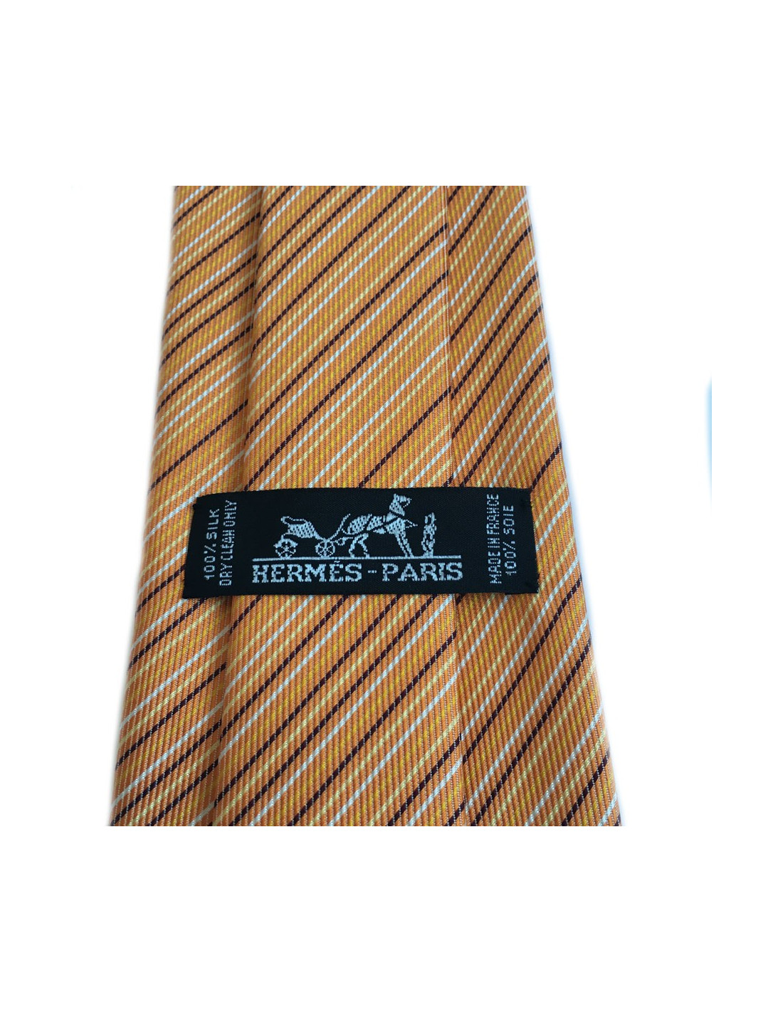 Cravate HERMES en twill de soie (100%) orange à fines rayures blanches, jaunes et noires. Aucune usure car elle n'a jamais été portée. La doublure est de couleur noire avec le logo H.
