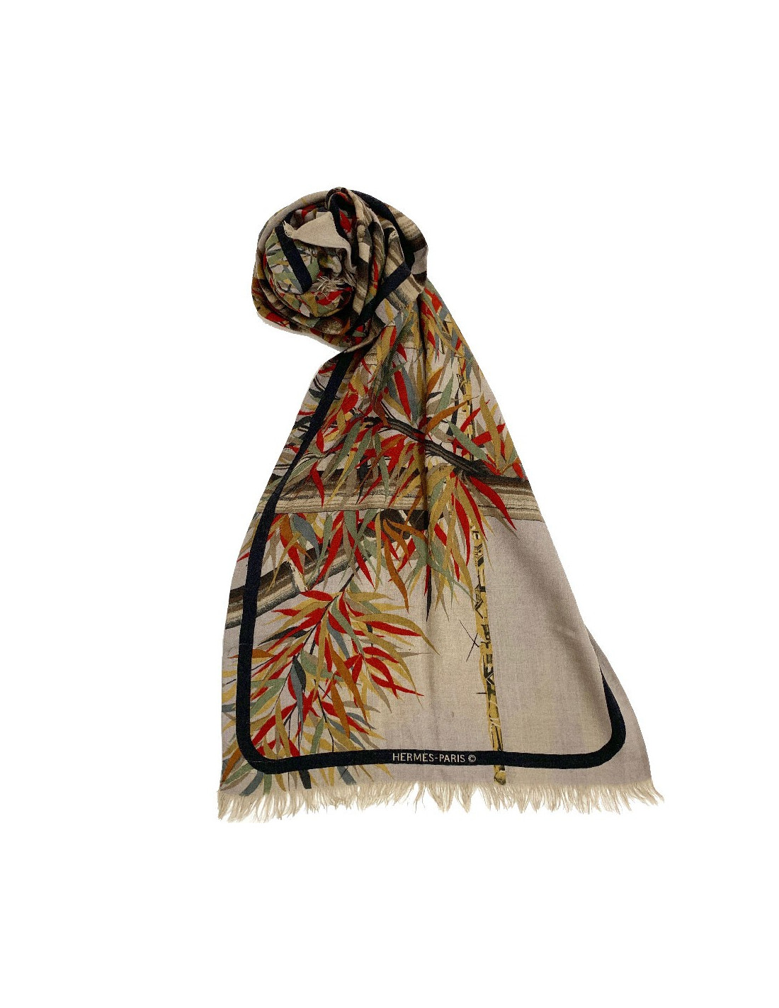 Très belle écharpe, pour homme, de la Maison HERMES. C'est une écharpe à petites franges, en cachemire et soie. Le motif représenté sur ce foulard est : des branches de bambou. Il y a l'inscription HERMES PARIS au bas de l'écharpe.