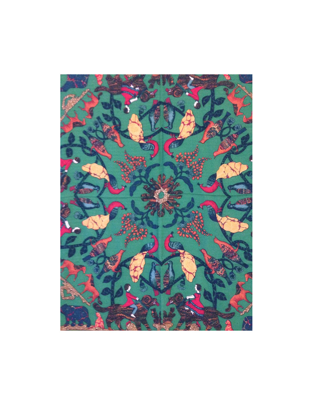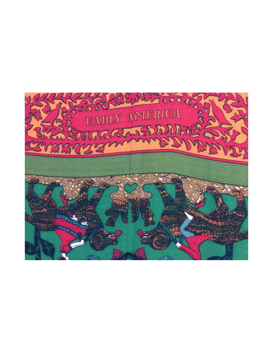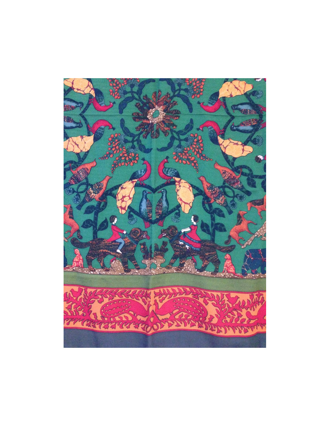 Superbe châle "Early America" Hermès en cachemire et soie vert et rouge, représentant de superbes paons (mâles et femelles), un cavalier et une cavalière. Encore un tableau de cette grande Maison qu'est Hermès.
