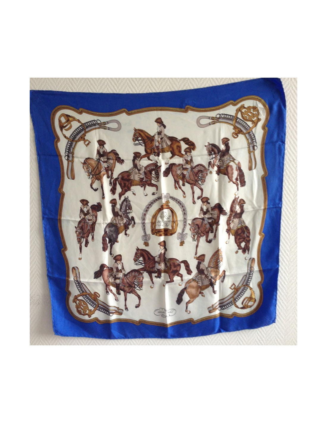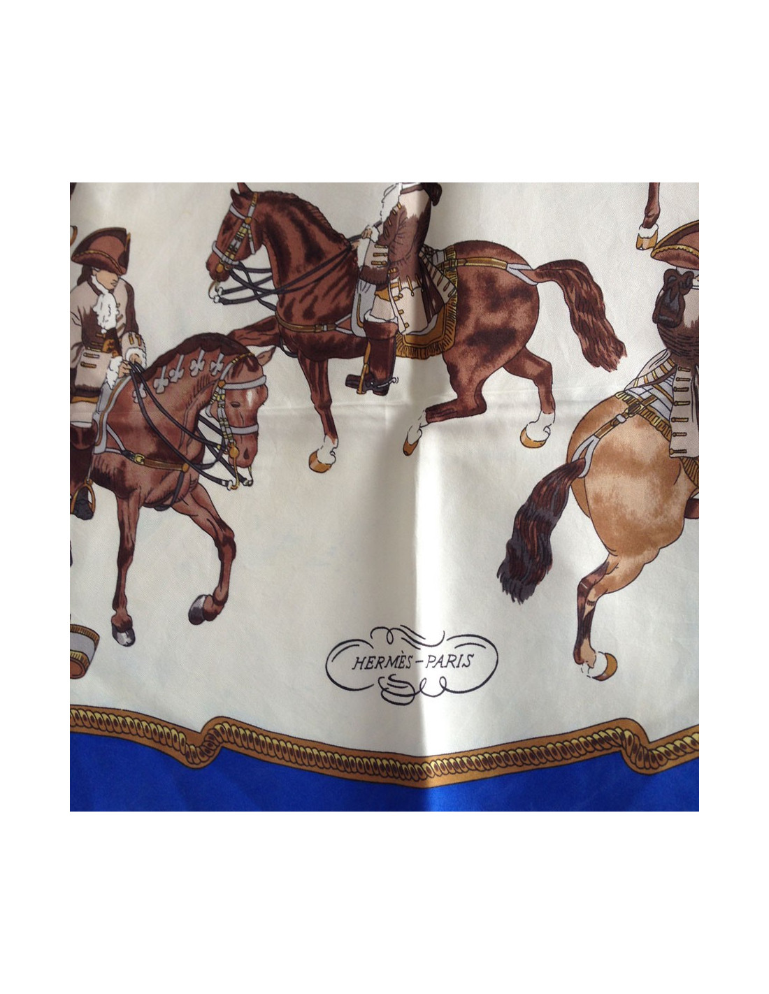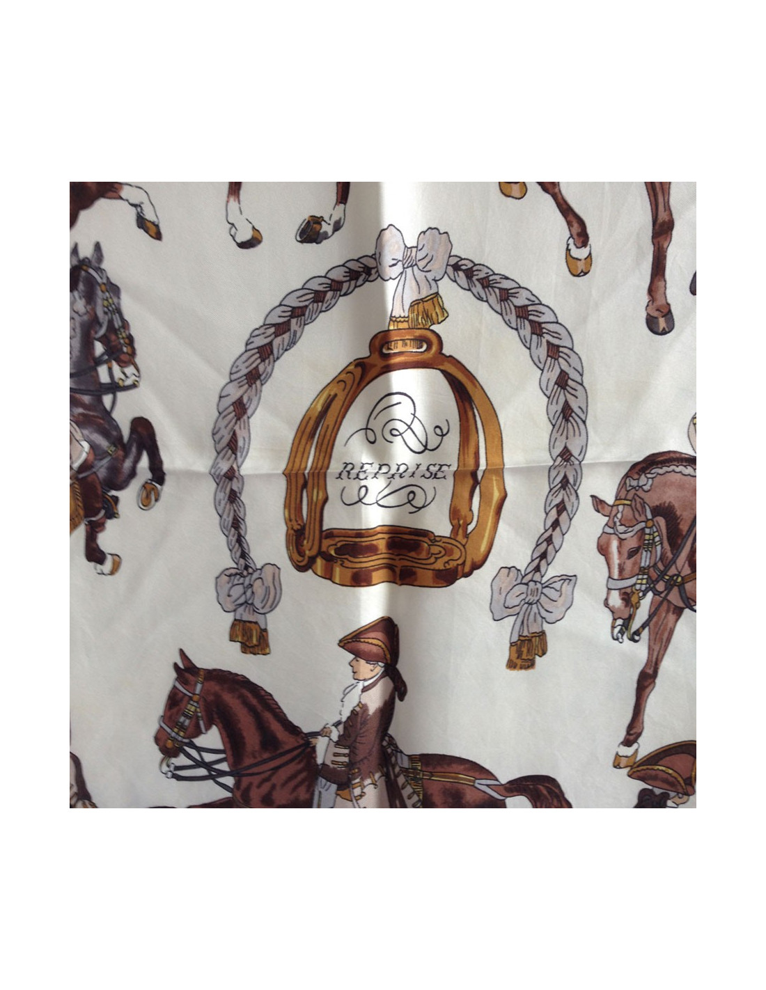 Carré Hermès, 100% soie, modèle "Reprise", signé "Ledoux". Frise bleue, fond écru. Foulard vintage. Légères décolorations bleues sur le fond. Etat d'usage.