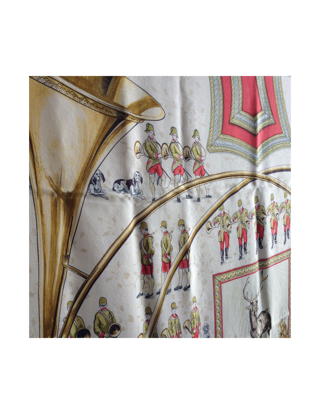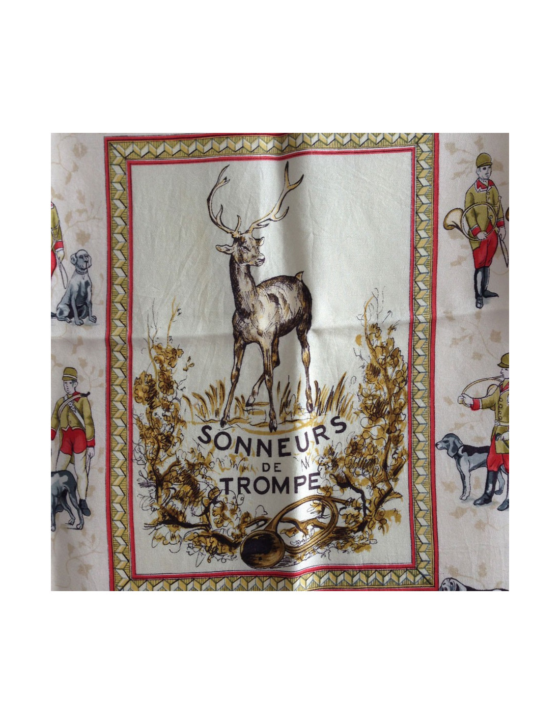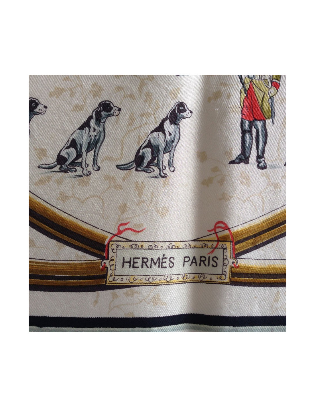 Foulard HERMES en 100% soie, vintage, "Sonneurs de Trompe", signé "F. De La Pérrière", frise vert tendre et blanc, fond écru. Le motif central est un cerf. Le roulotté est encore bien rond, légèrement défait sur le côté gauche du foulard, quelques tâches peu visibles. Légèrement effilé à deux endroits. En bon état général.