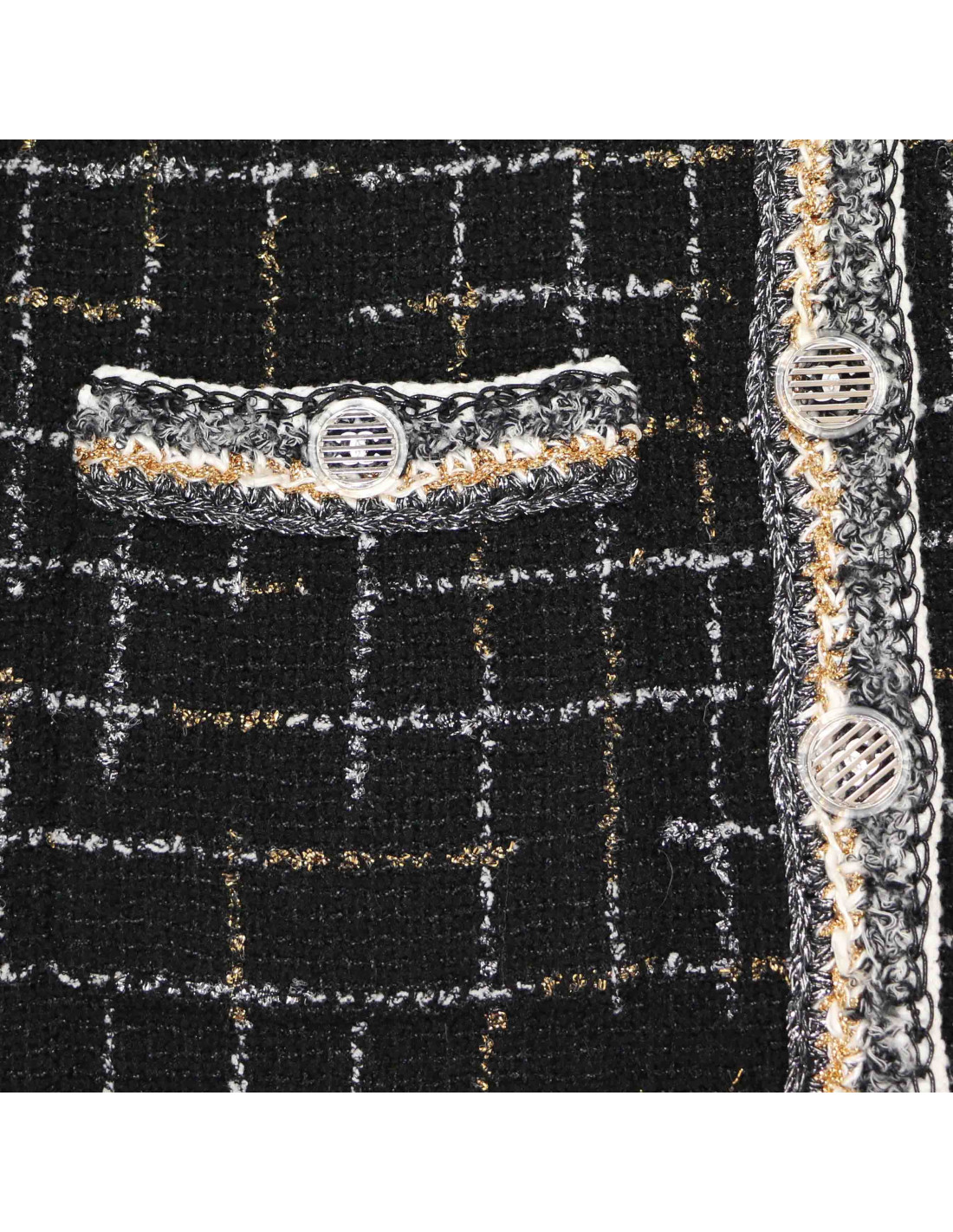 Détails : doublure en soie noire avec l'incontournable chainette au bas de la veste intérieure. 2 poches, fermeture par 2 boutons (fond unCC). Nombre de boutons 12.