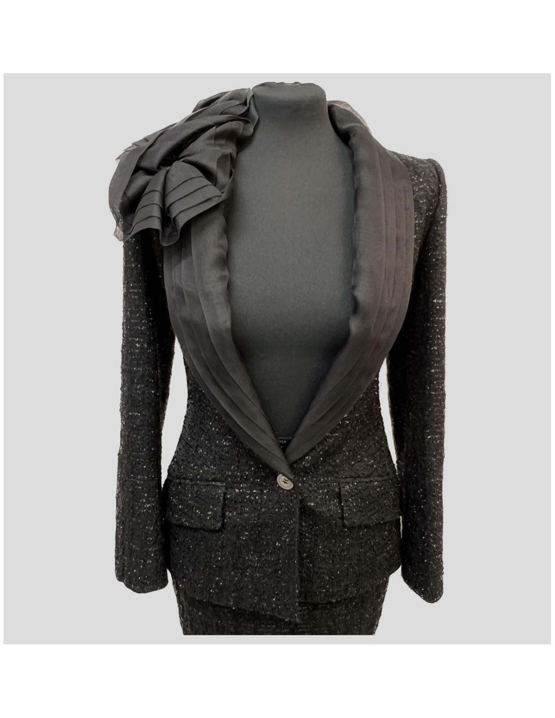 Vendu JUPES Ensemble CHANEL TOP T 38 FR JUPE T 40 FR CHANEL 19832 3 500,00 € Bel ensemble Chanel, top t 38 FR et jupe t 40 FR,matière : 70% métal et 23 % polyamide. Etat neuf. Collection récente. Le haut et la jupe sont en dentelle délicate avec des fils d'or et d'argent. La jupe est doublée 100% de soie couleur chair. a partie transparente du haut est également en soie 100%. Jamais porté. Dimensions à plat : haut : longueur de... Voir