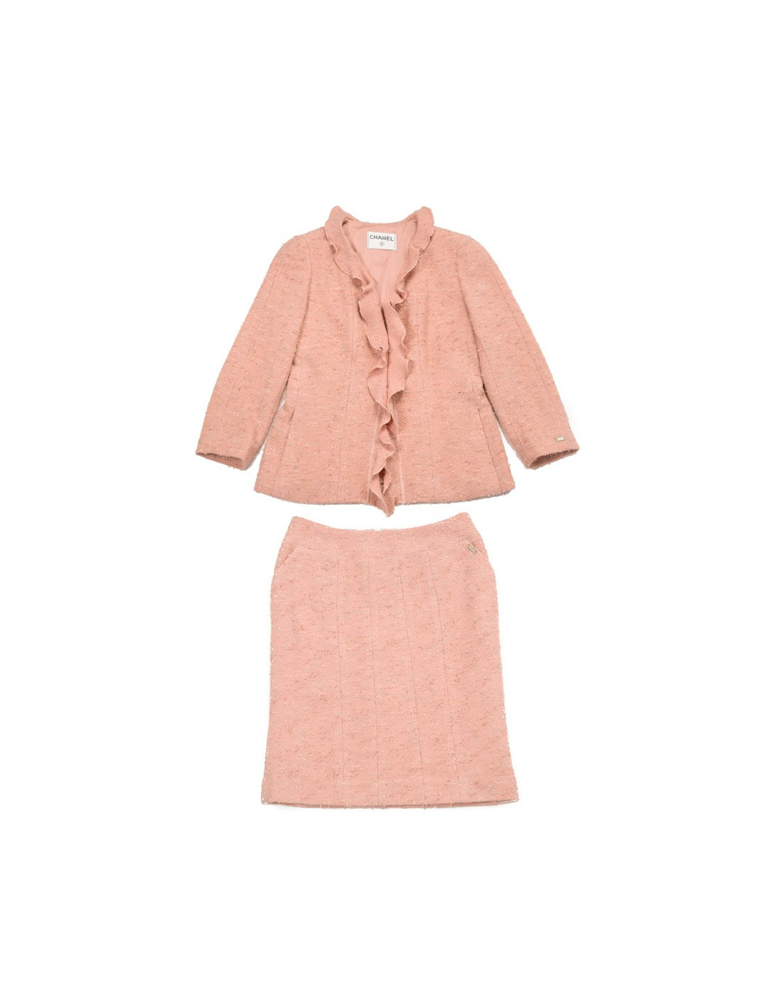 Tailleur Chanel de couleur rose poudre (effiloché) en laine, doublé de soie, veste épaulée, 2 fermetures à crochets à l'intérieur de la veste, 1 poche de chaque côté de la veste + chainette en bas de la doublure. Pas d'étiquette de taille. Taille 38. En très bon état. Jupe droite, comporte 2 poches de chaque côté de la jupe.