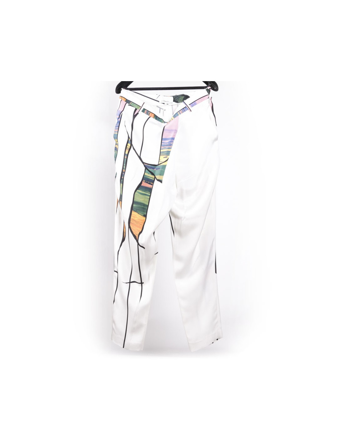 le pantalon 100 % soie, avec 2 poches avant et une poche arrière et possibilité de le porter avec une ceinture : taille 41 cm, hanches amples 54 cm, hauteur 102 cm