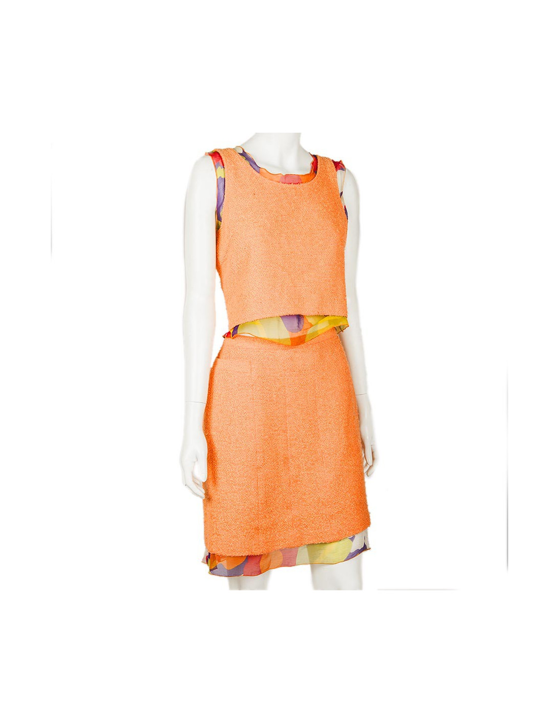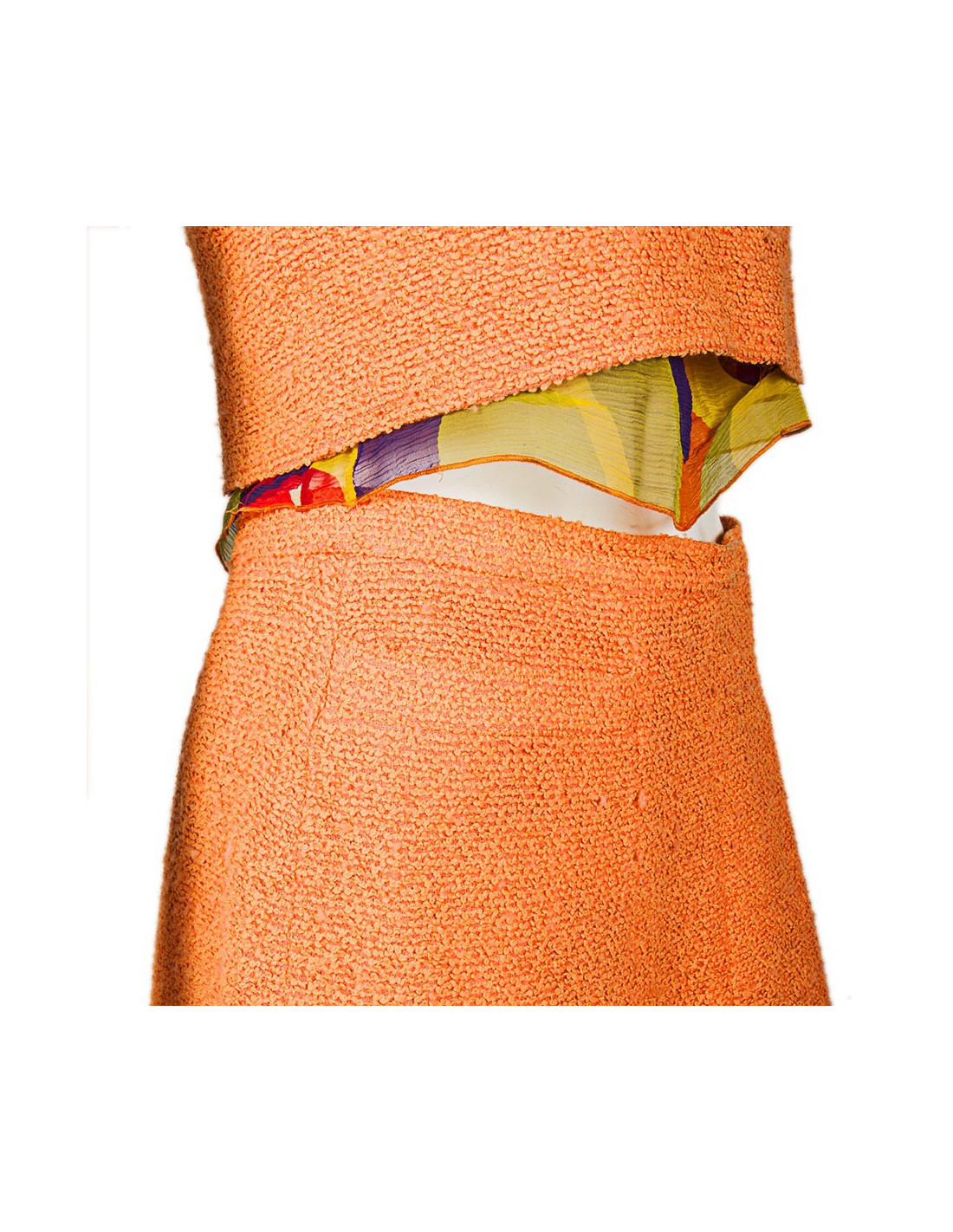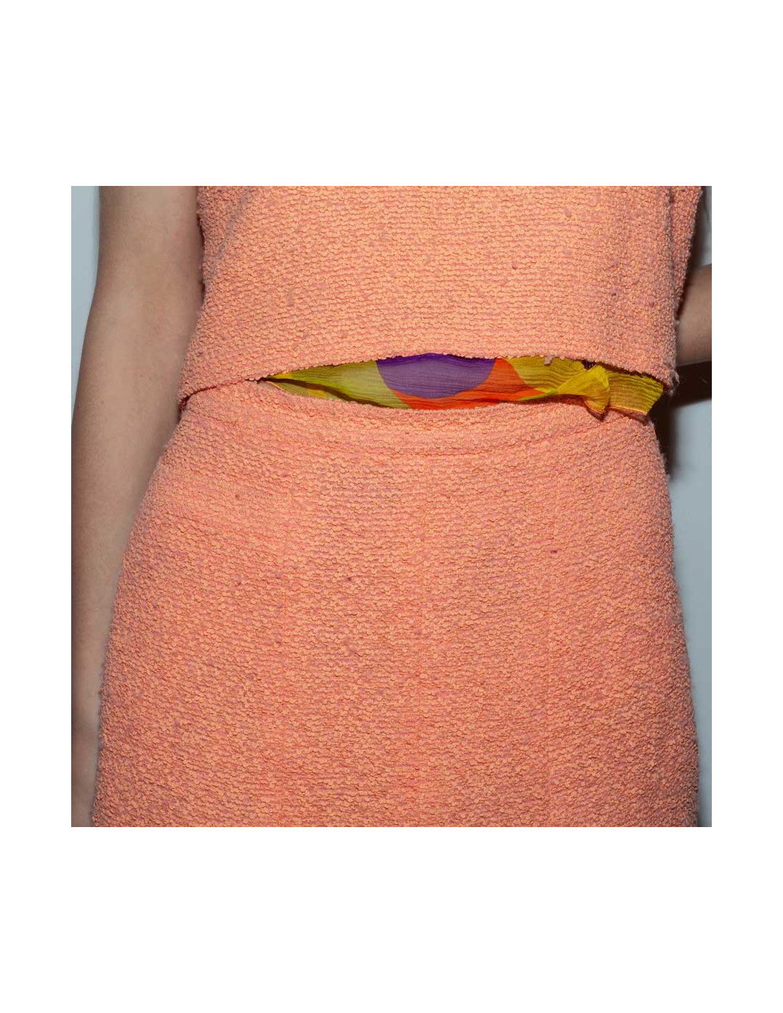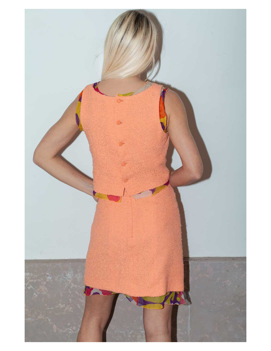 Ensemble CHANEL en laine corail Chanel taille 38 FR. Top sans manche fermé par une rangée de boutons corail marqués du monogramme "Chanel"; et d'une jupe taille haute composée d'une poche discrète à droite, d'un sigle métallique "Chanel Paris" couleur corail à droite (voir photo) et d'une fermeture zippée discrète accompagnée d'un bouton siglé, tous deux ornés d'une doublure en soie pure multicolore dépassant légèrement.