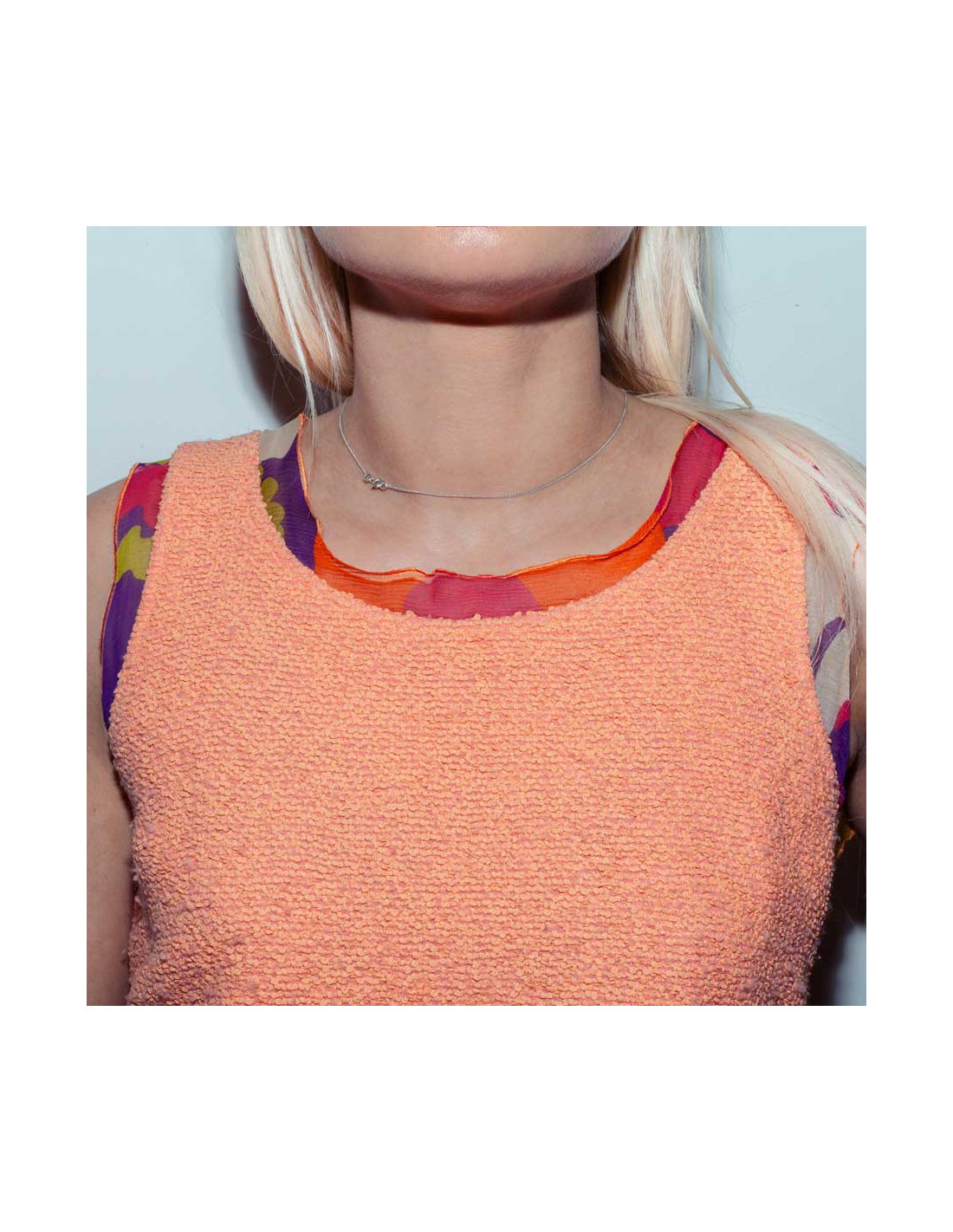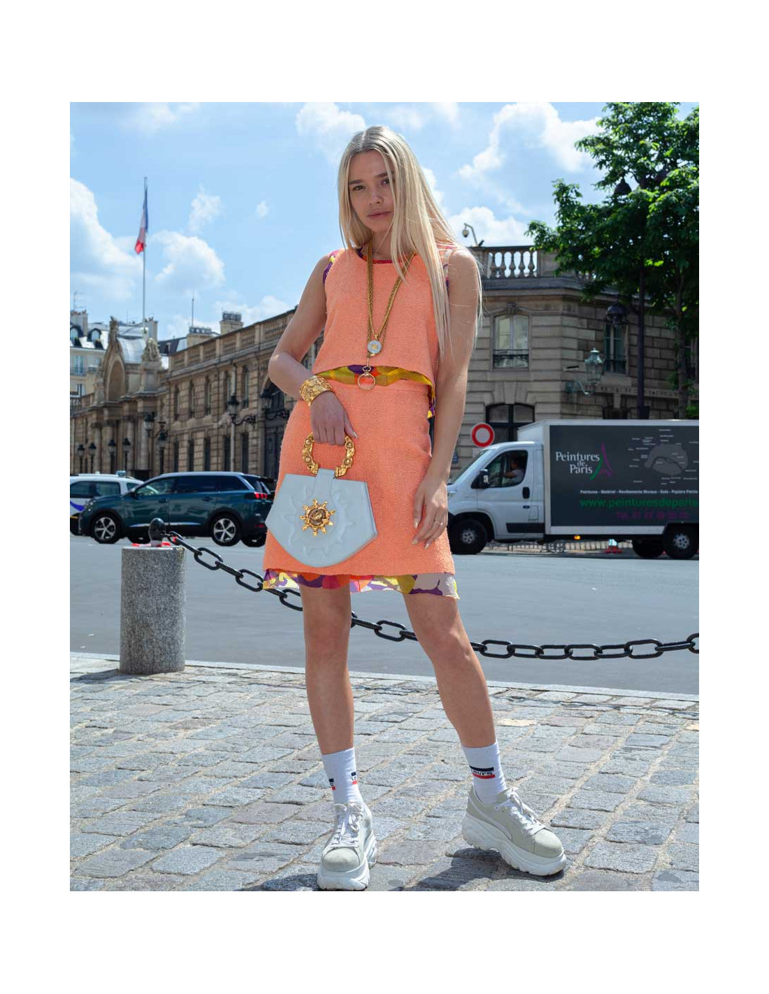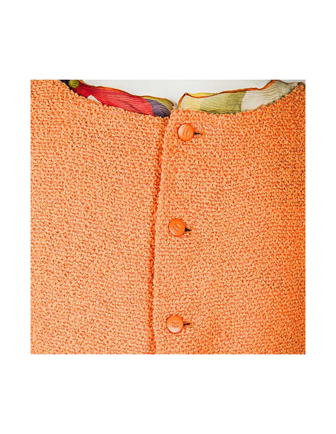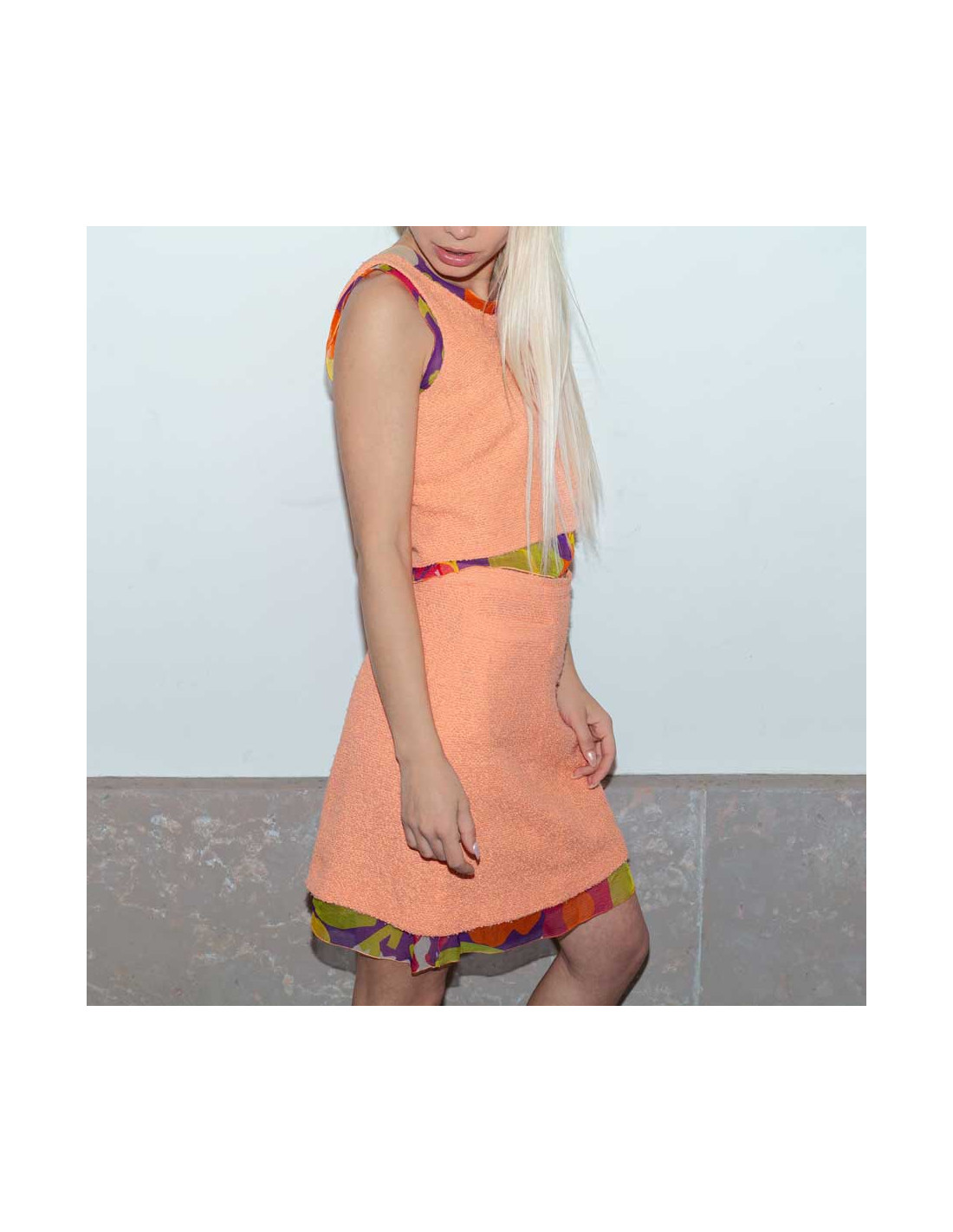 Ensemble CHANEL en laine corail Chanel taille 38 FR. Top sans manche fermé par une rangée de boutons corail marqués du monogramme "Chanel"; et d'une jupe taille haute composée d'une poche discrète à droite, d'un sigle métallique "Chanel Paris" couleur corail à droite (voir photo) et d'une fermeture zippée discrète accompagnée d'un bouton siglé, tous deux ornés d'une doublure en soie pure multicolore dépassant légèrement.