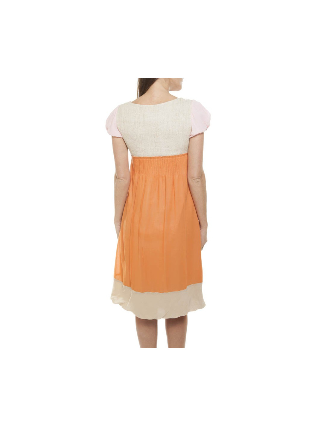 Elle est fabriquée avec des matières différentes : orange, beige, rose et liseret vert amande.