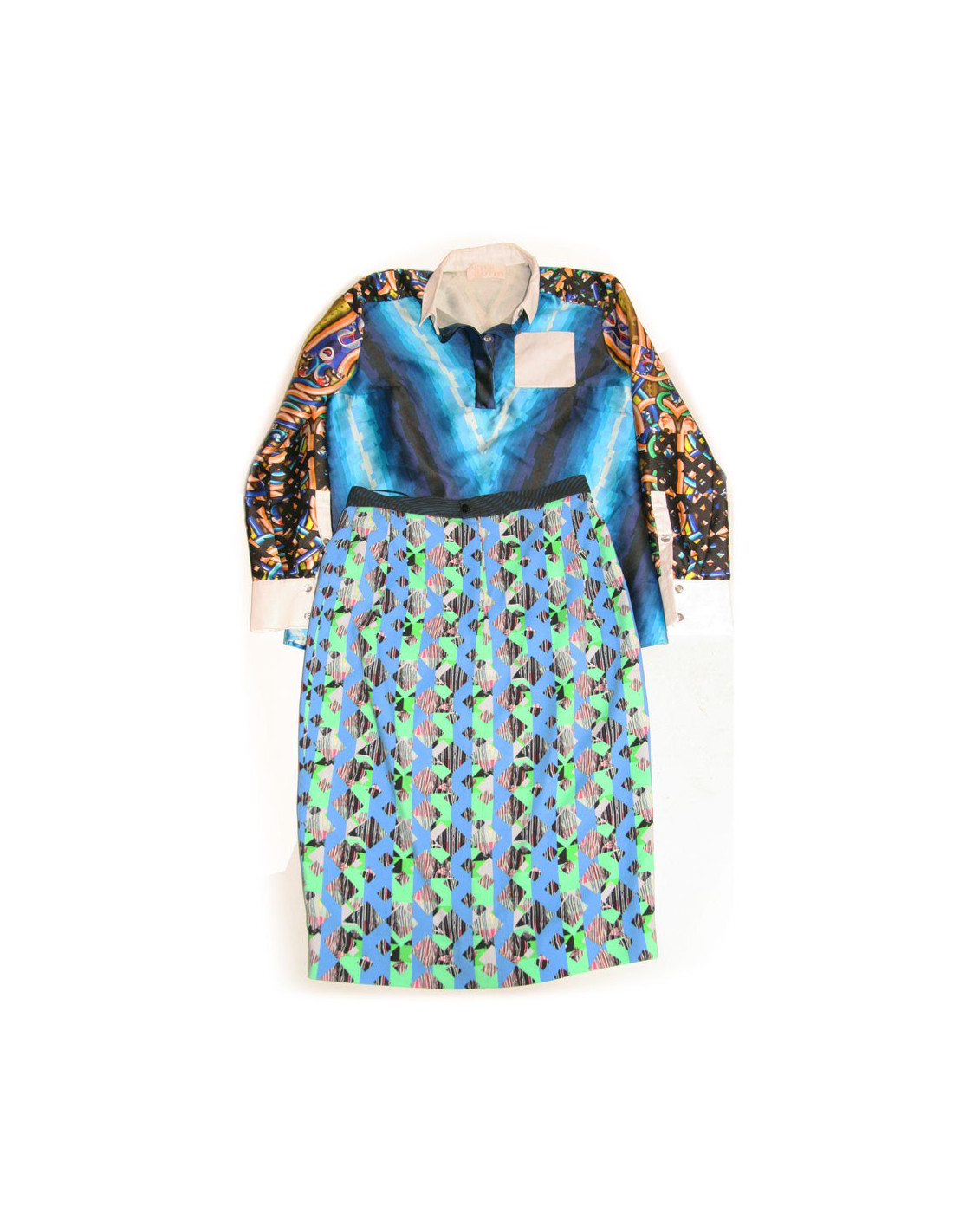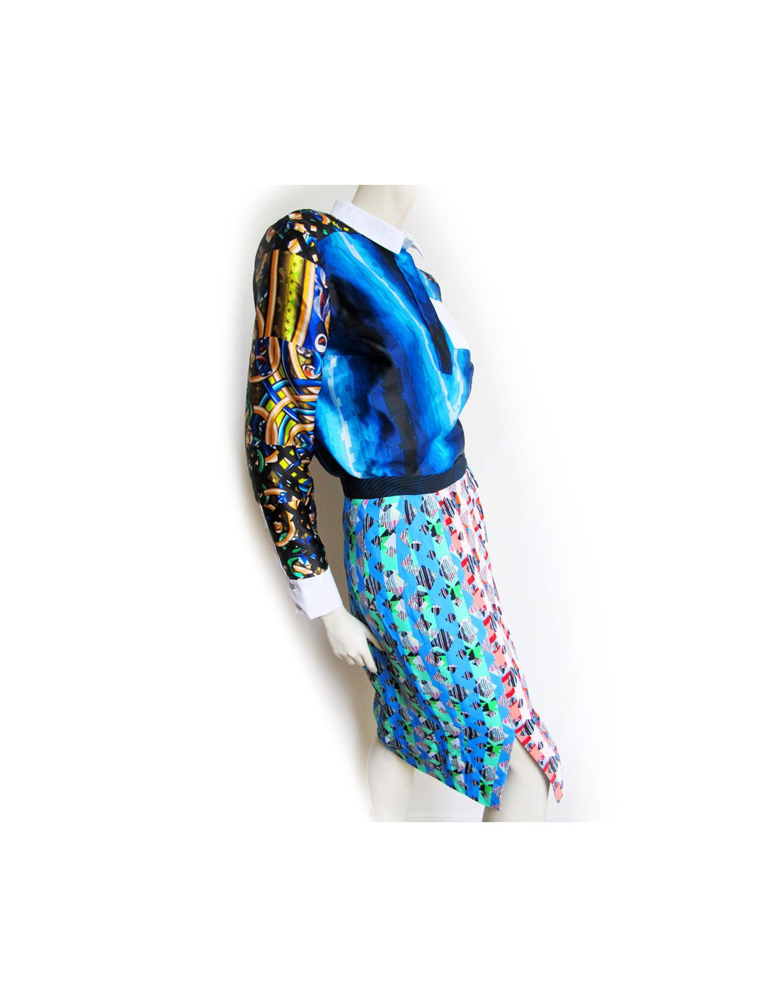 Ensemble jupe et haut Robert Pilotto T38, créateur très en vogue. Le haut: 83% soie,