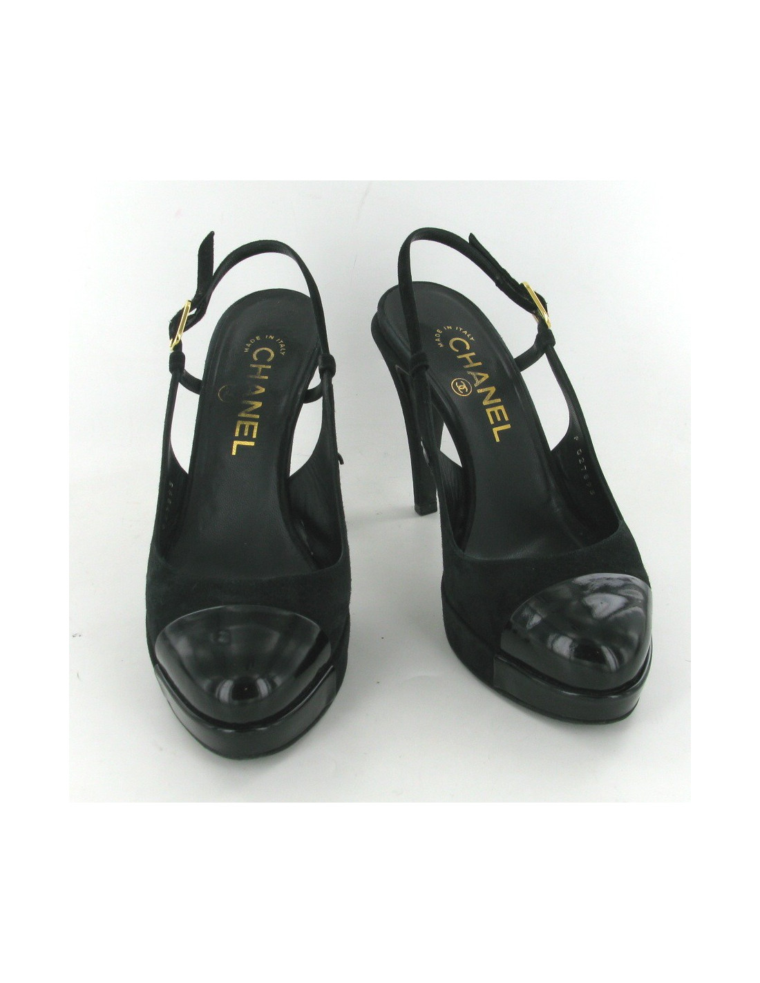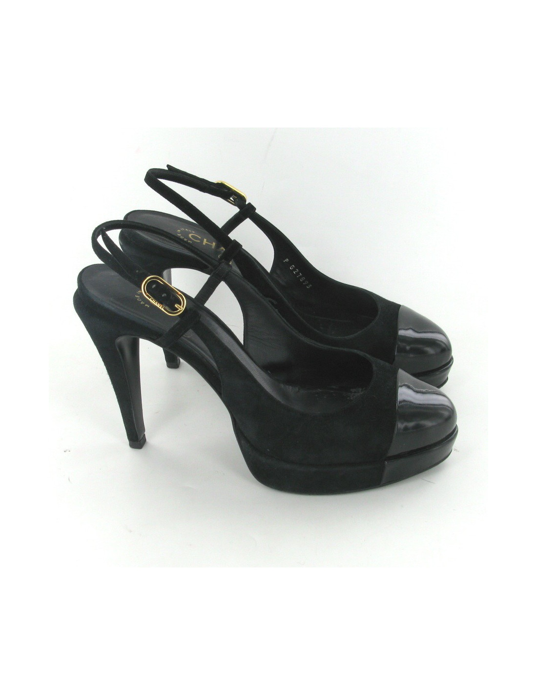 Magnifiques escarpins en daim et cuir verni noir T 37 CHANEL. La boucle CHANEL est en métal doré, il y a un CC en métal noir à l'intérieur du pied. Usure du daim au niveau des talon et 2 petits accrocs sur le talon gauche. très peu portées.