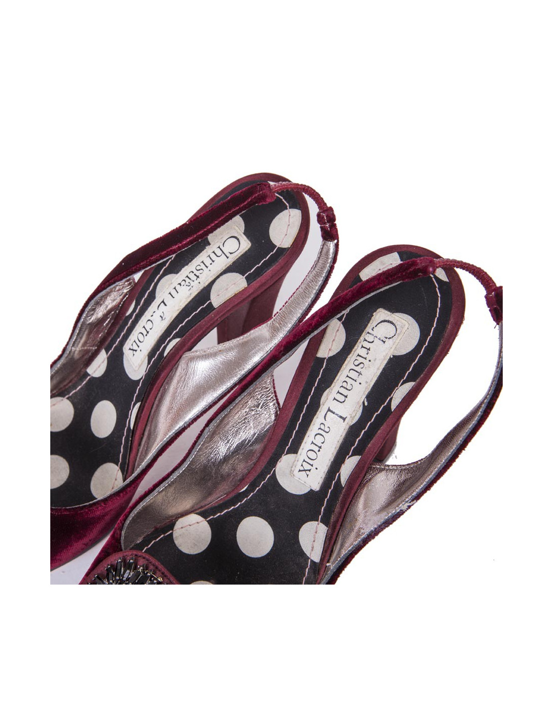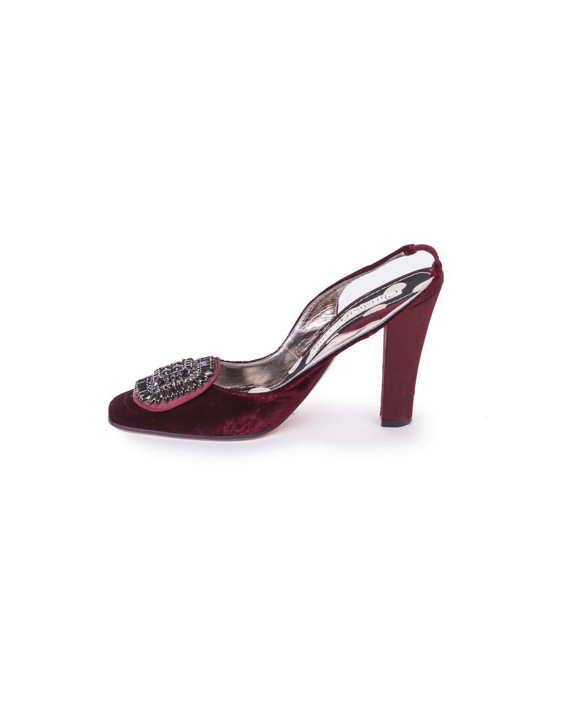 Sandales hautes T 36.5 UE Christian Lacroix en velours rouge cardinal. Elles ont une bijouterie en métal argent noirci et cristaux Swarovski noires taillés : marquise et carré. Le talon est en satin de soie (légères griffures). Les côtés intérieurs sont en cuir lisse argent.