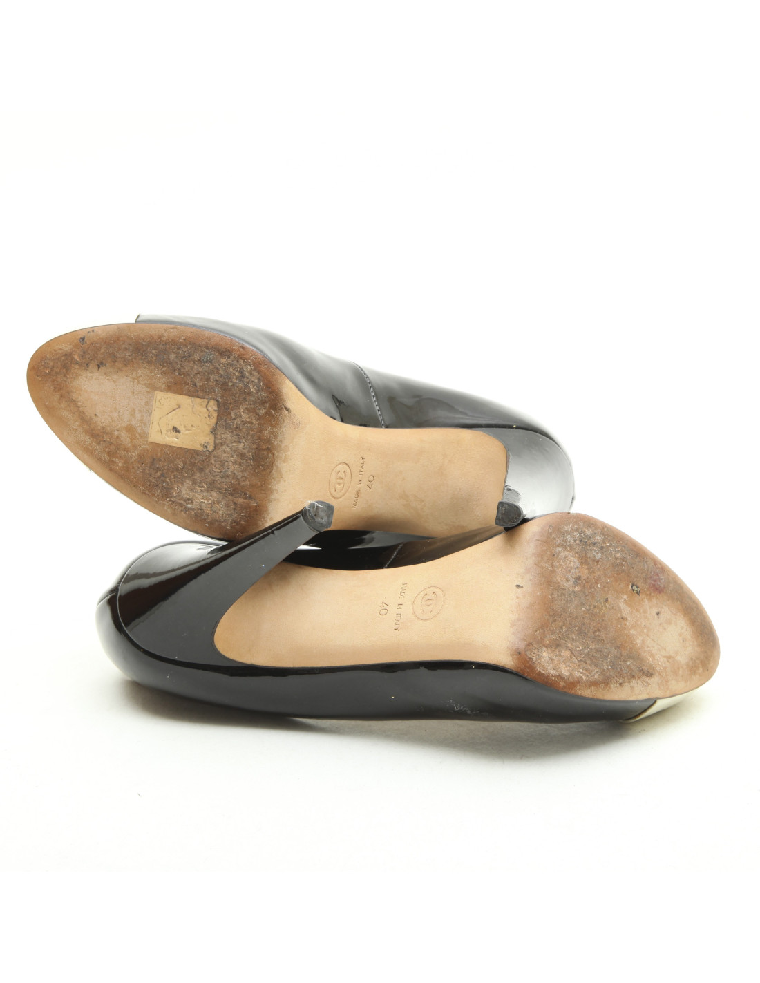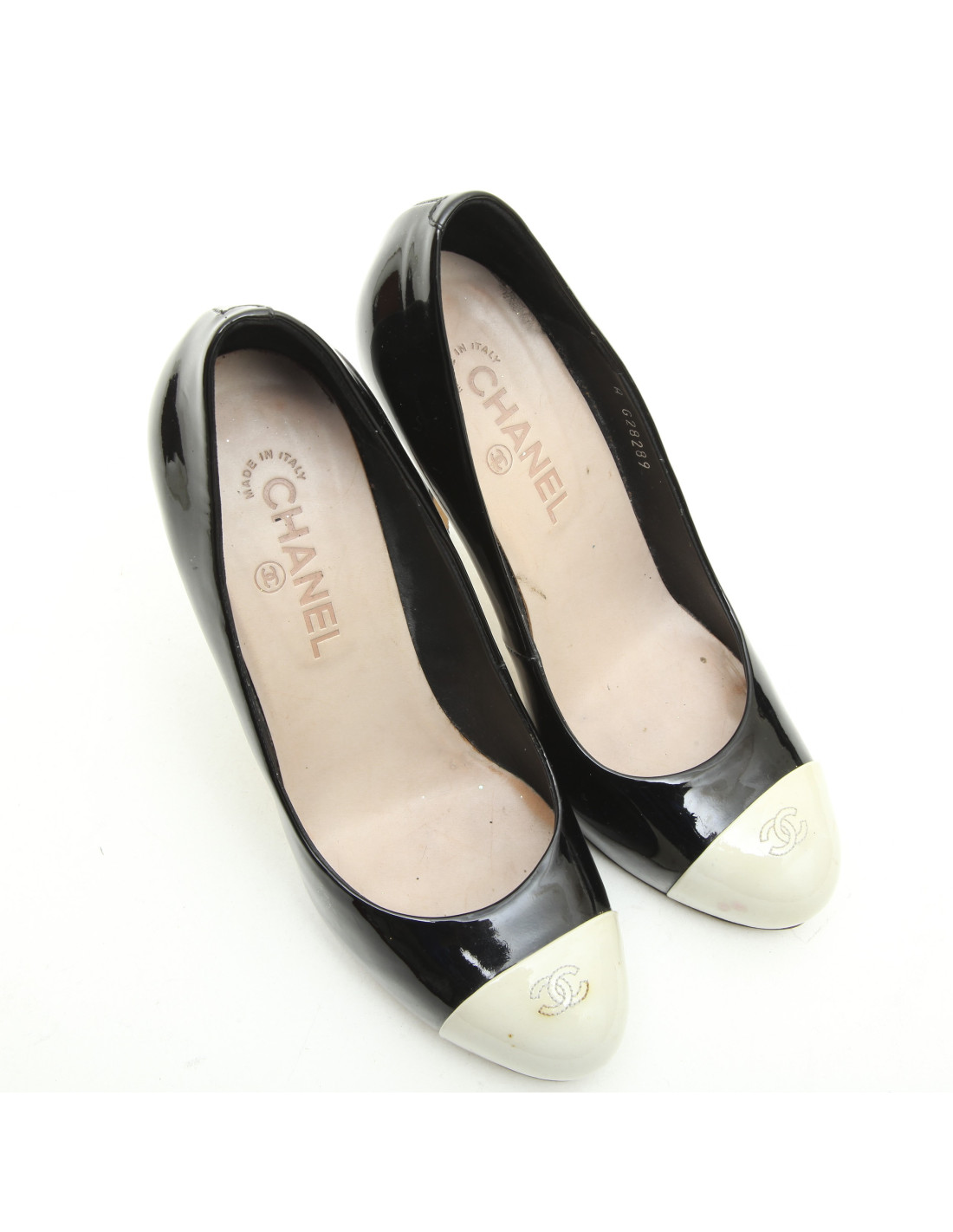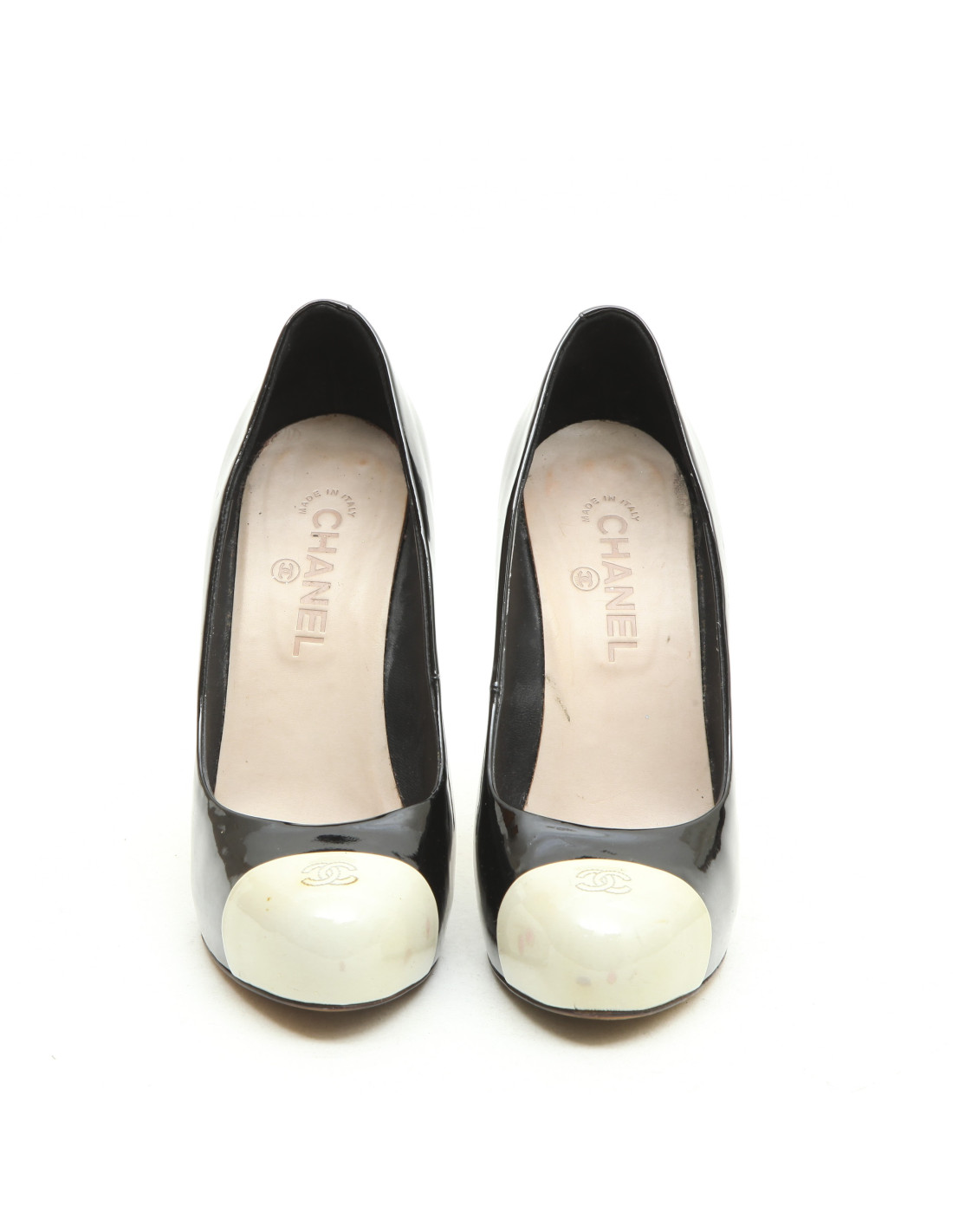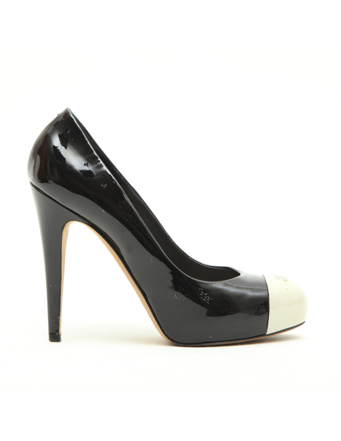Escarpins Chanel en cuir bicolore noir et blanc cassé. Taille 40. Made in Italy. Semelle en cuir.