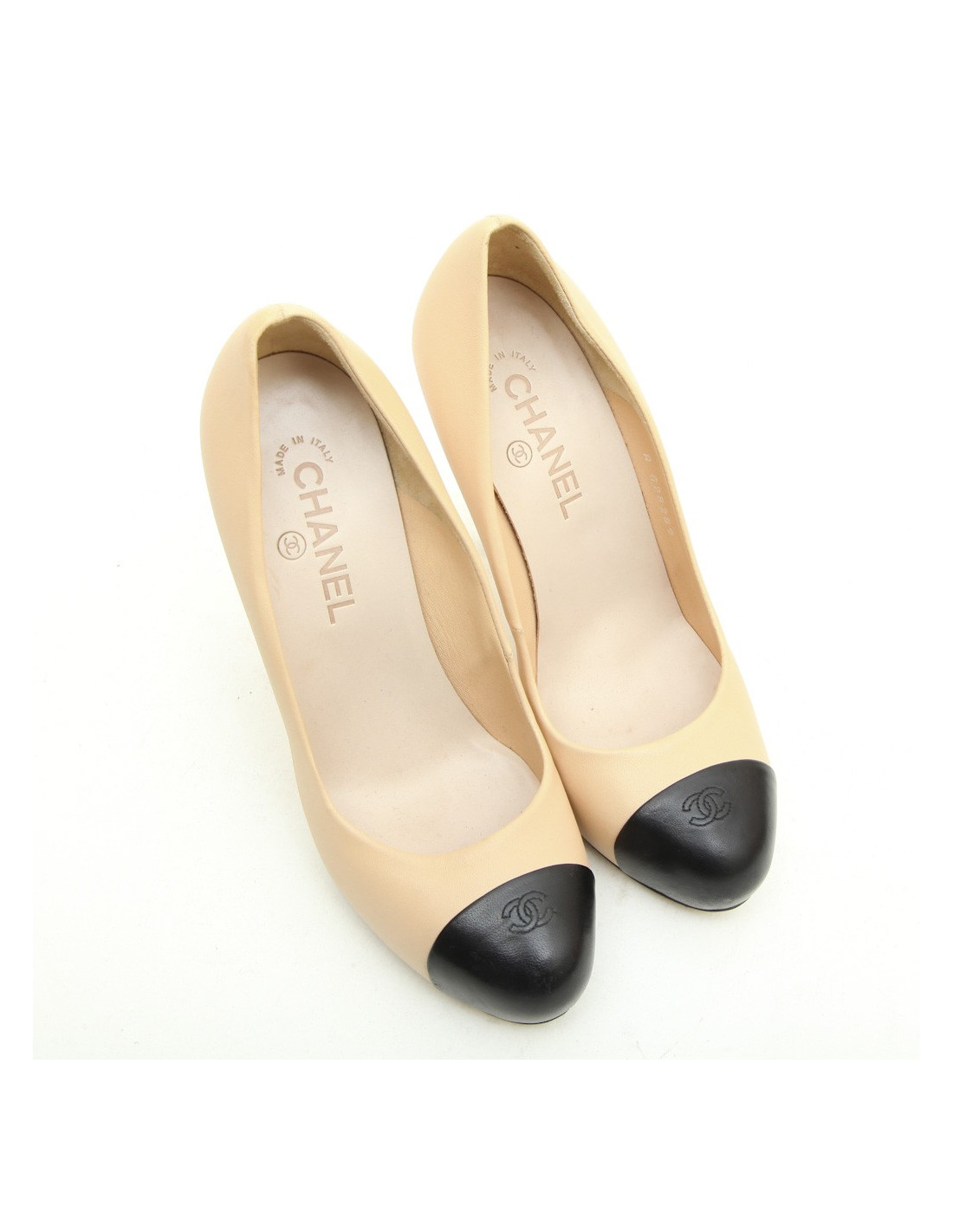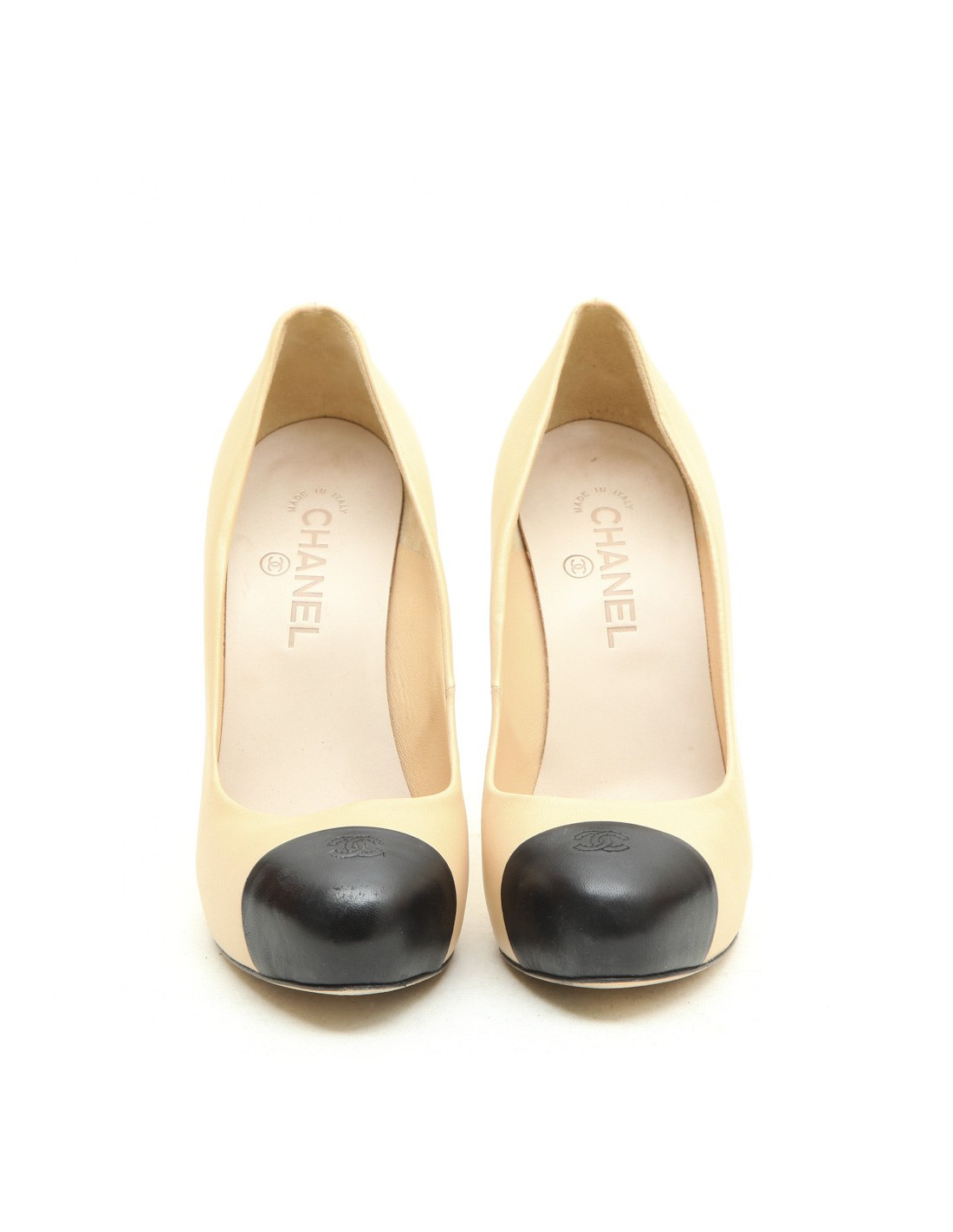 Escarpins T 39.5 Chanel en cuir d'agneau lisse bicolore beige et bout noir.