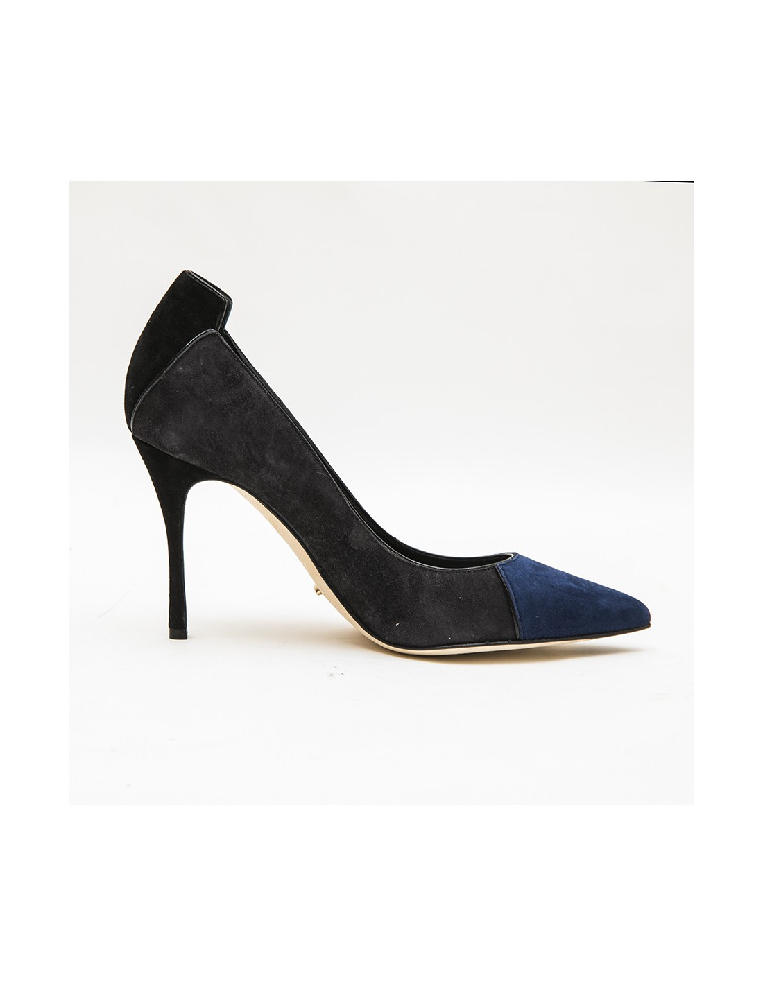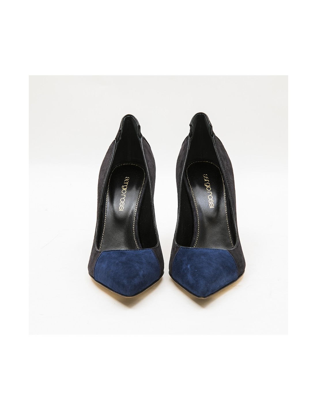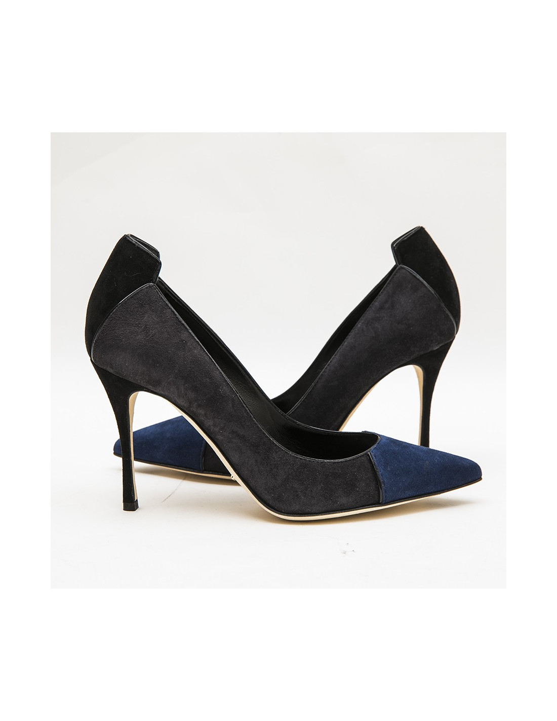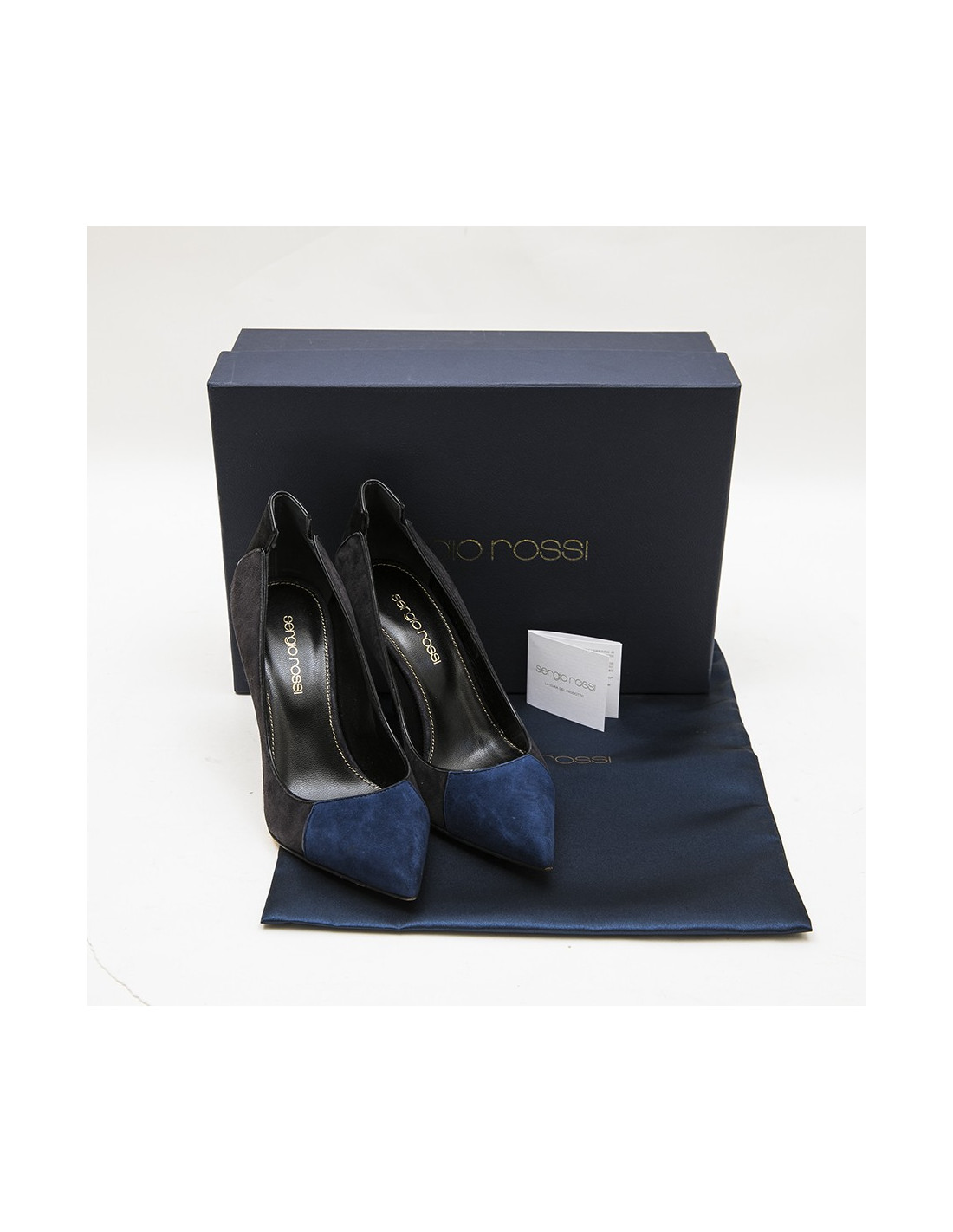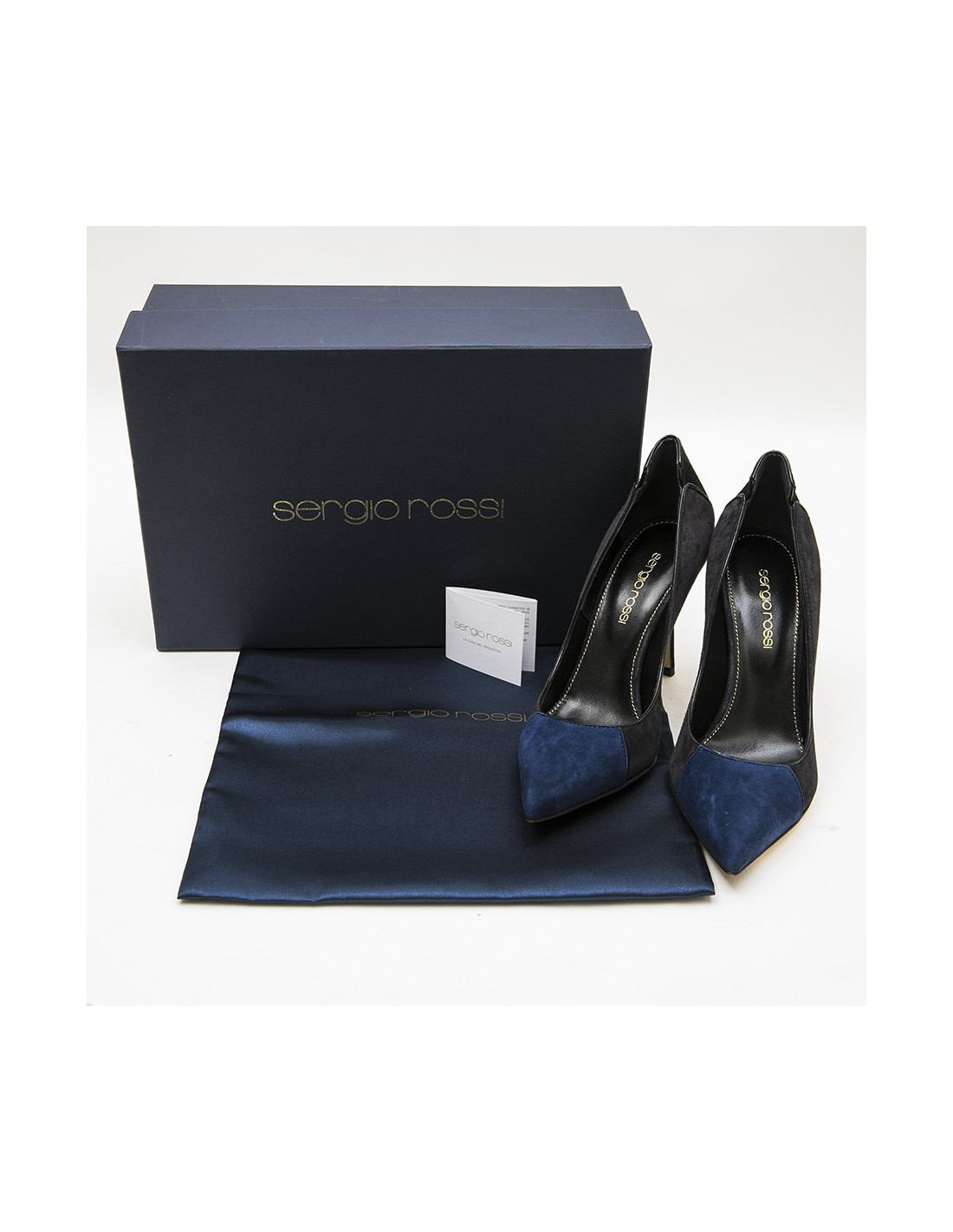 Escarpins Sergio Rossi taille 36 en daim tricolore gris foncé, noir et bleu indigo. Etat neuf.