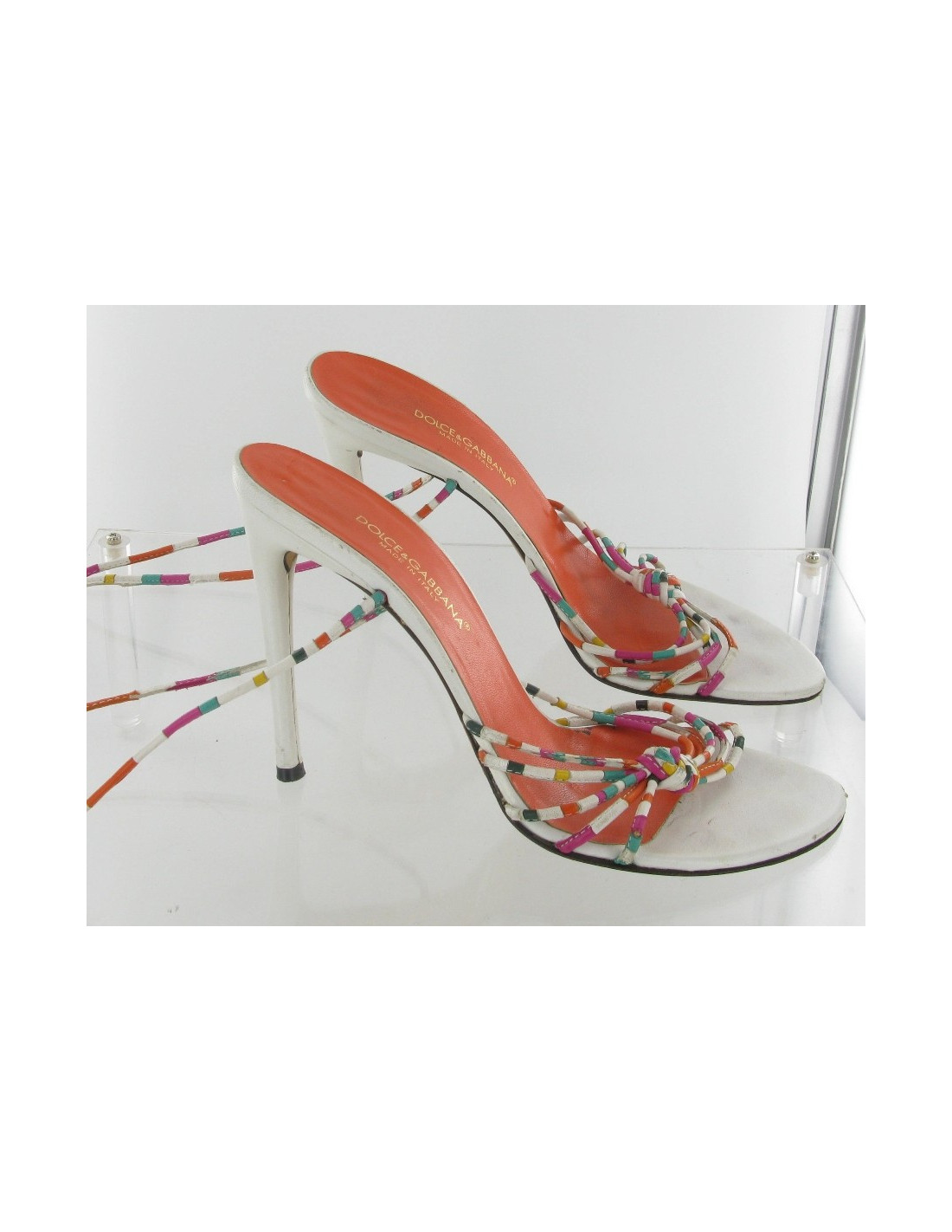 Jolis escarpins ouverts en cuir blanc à lanières en cuir multicolore t38 Dolce Gabbana.-semelle intérieure cuir orange-lanières en cuir multicolore au niveau du talon et du coup de pied pour le maintien -cuir marqué sur les talons-semelles intérieures légèrement marquées-longueur semelle intérieure: 25. 5cm-largeur extérieure:9cm