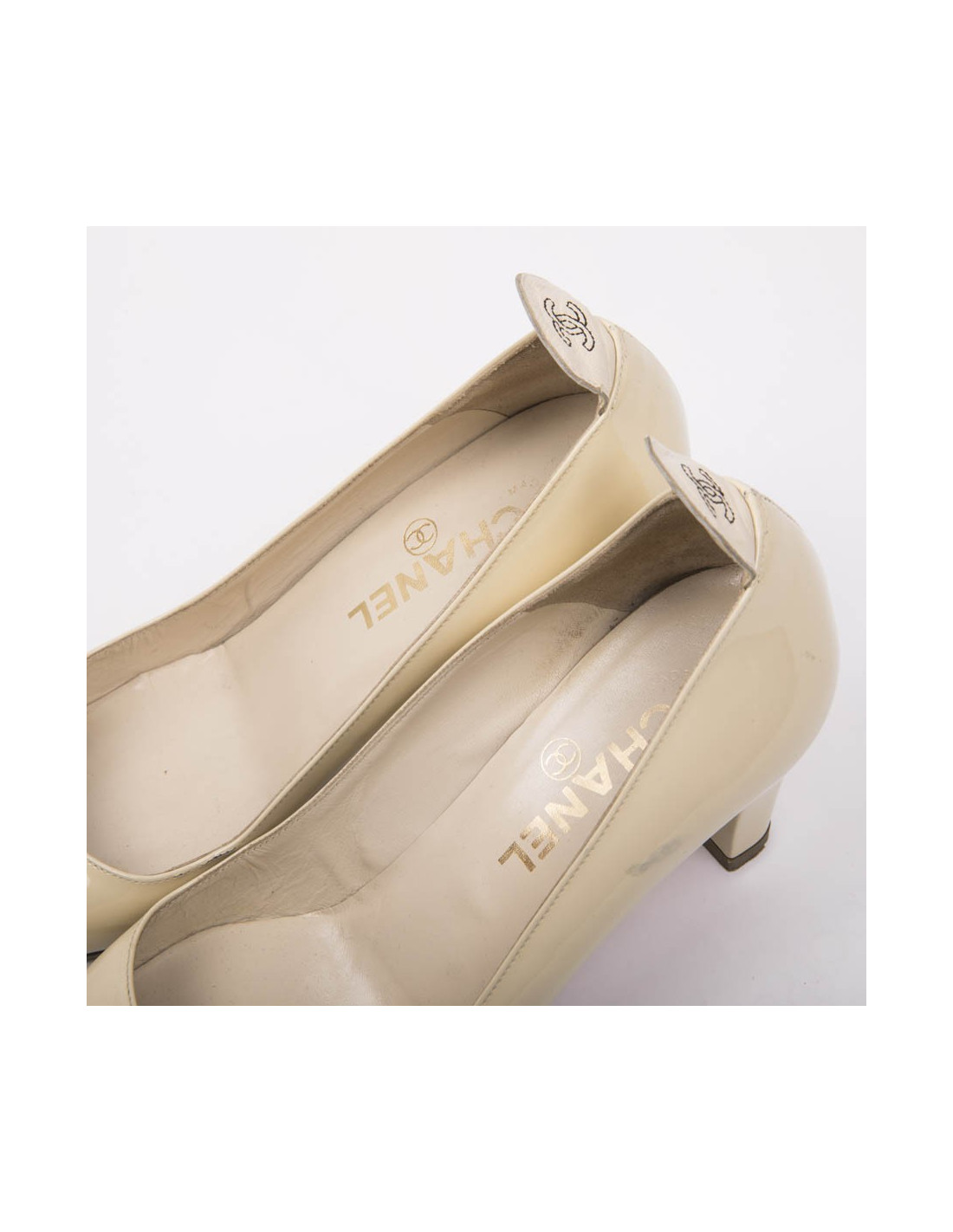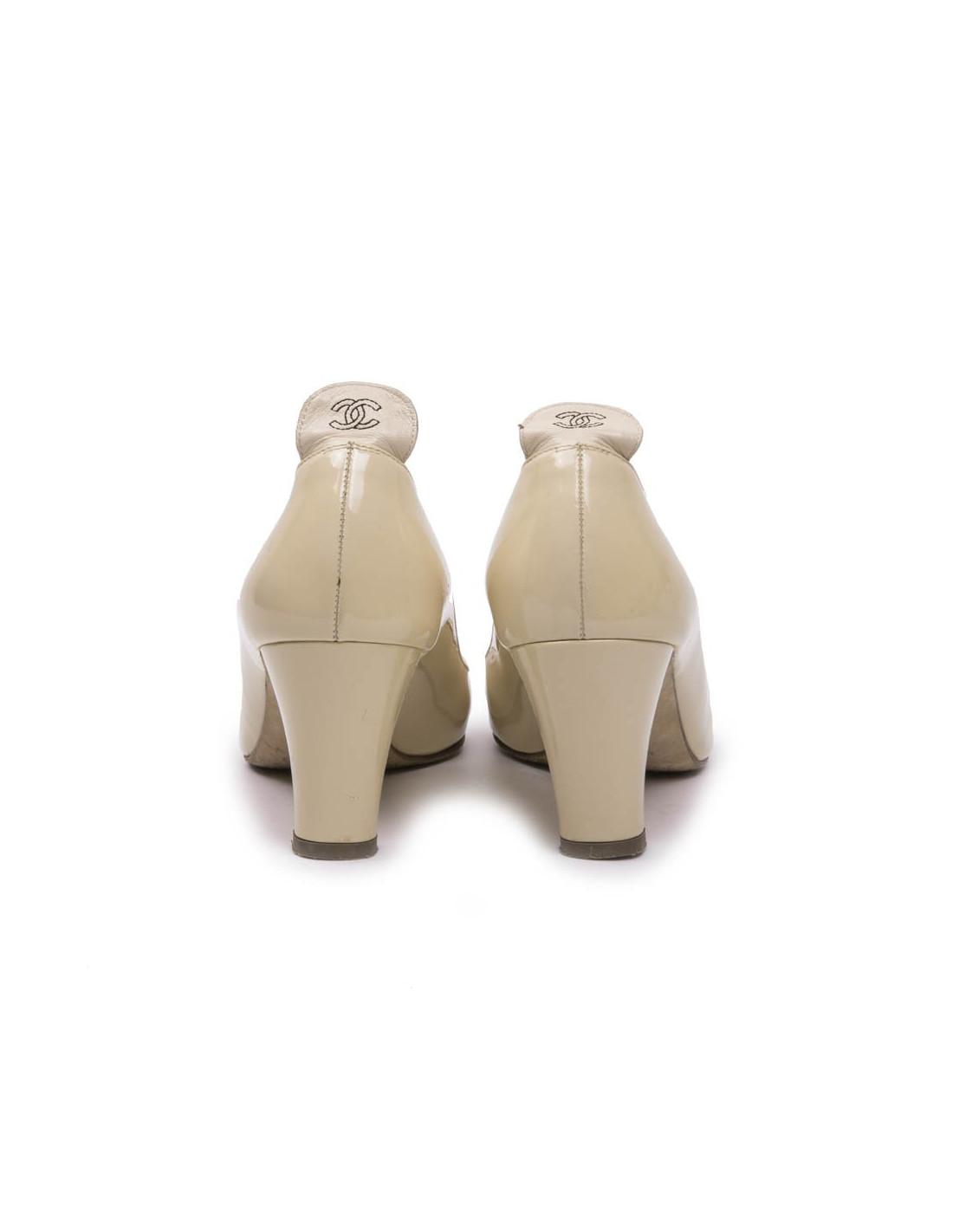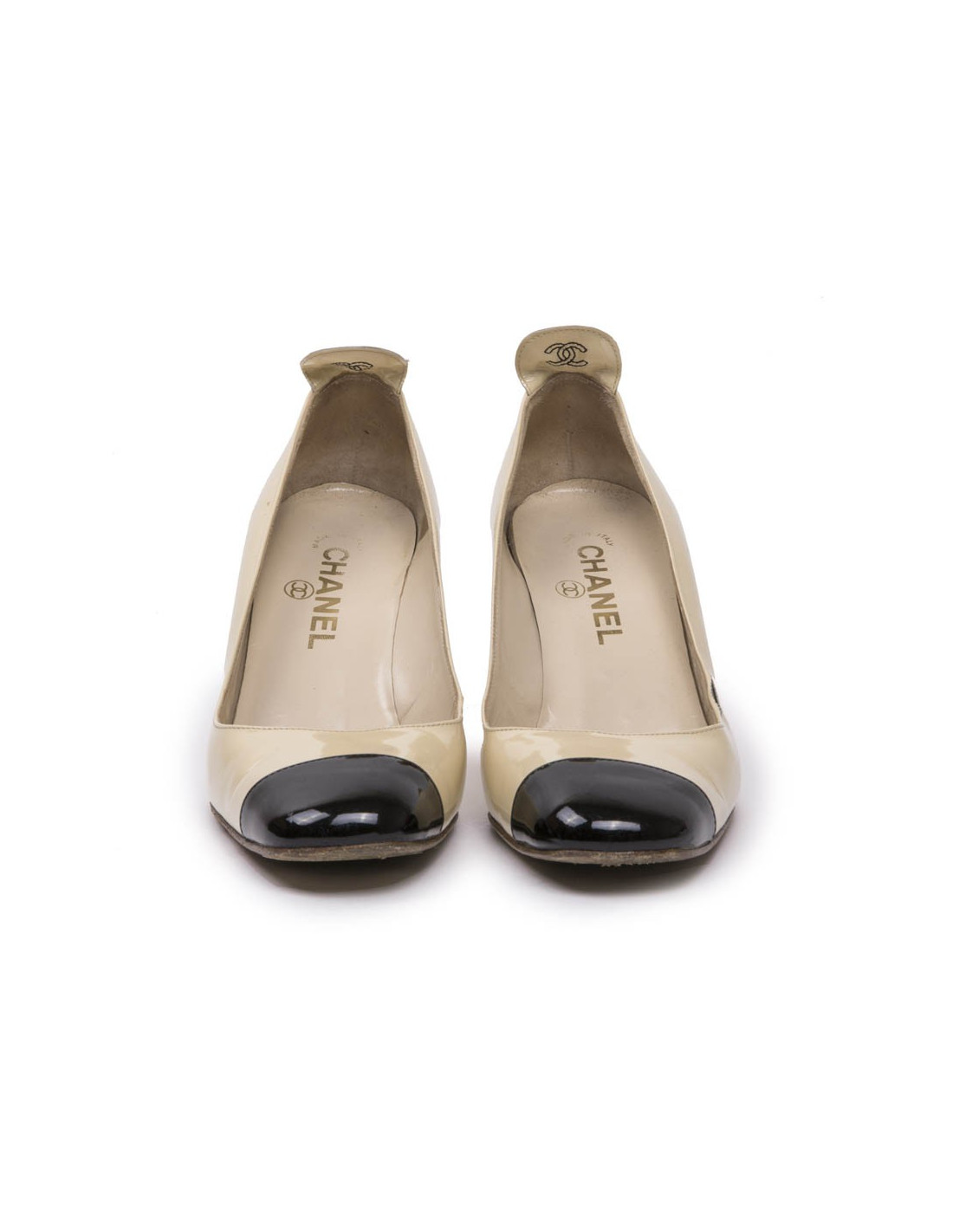 Escarpins Chanel en cuir verni bicolore beige et noir. Taille 36,5.